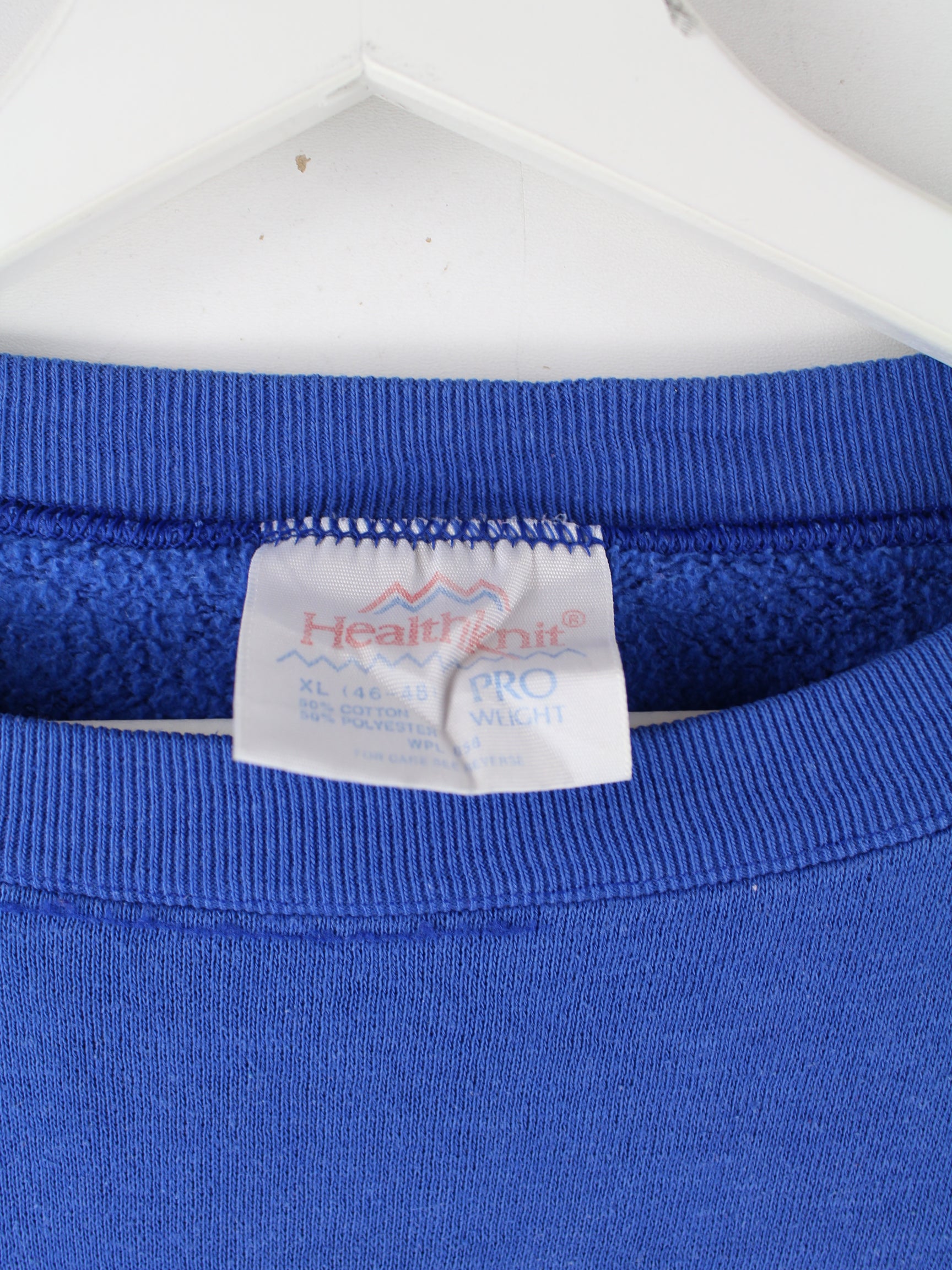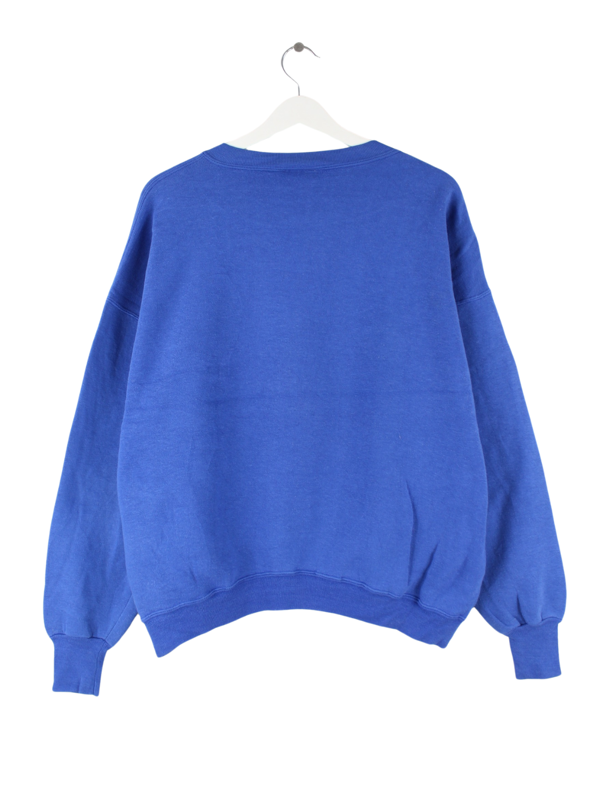 Blauer Vintage Sweater in Größe XL. Er ist aus einer Baumwollmischung hergestellt und in sehr gutem Zustand bei uns vorrätig. Mit schickem Capitals Print.