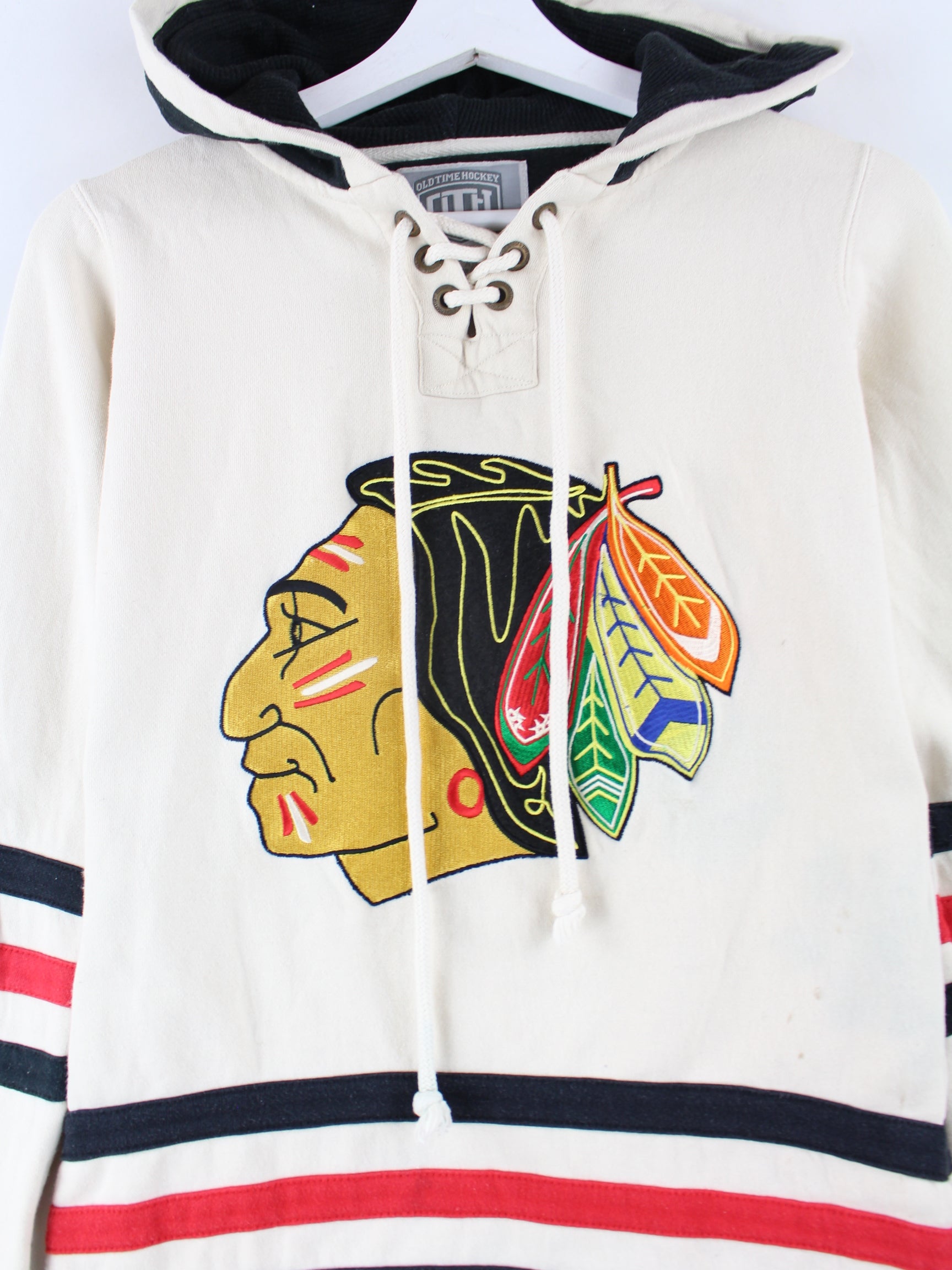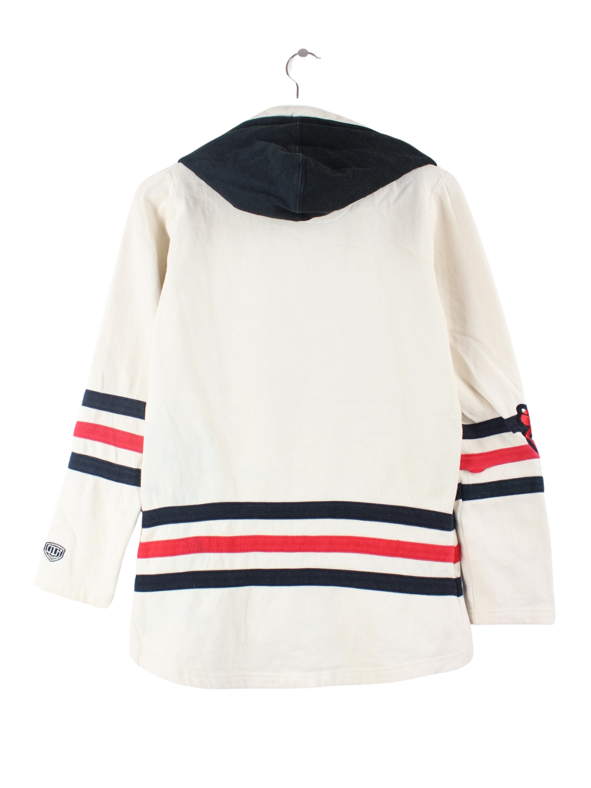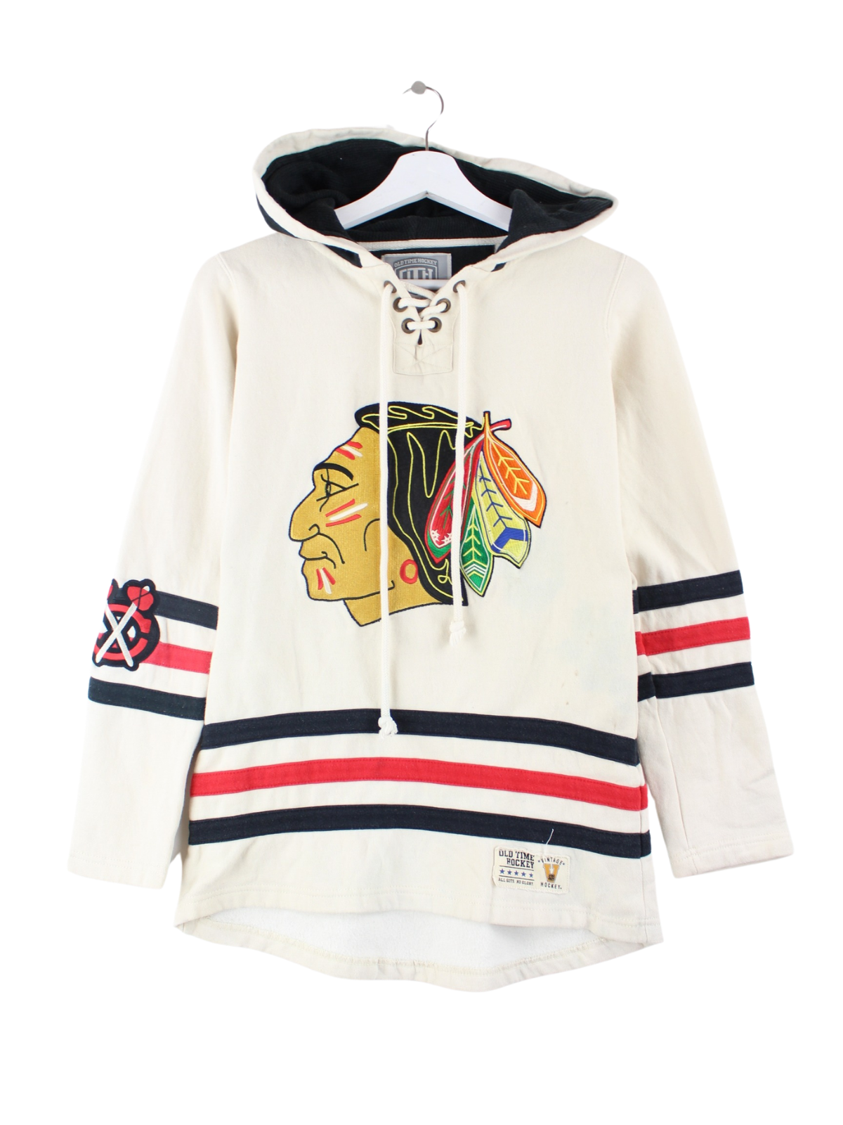Vintage hoodie with embroidery in size S. It is made of a cotton blend and is in stock in beige.