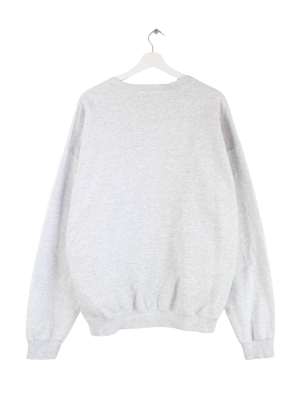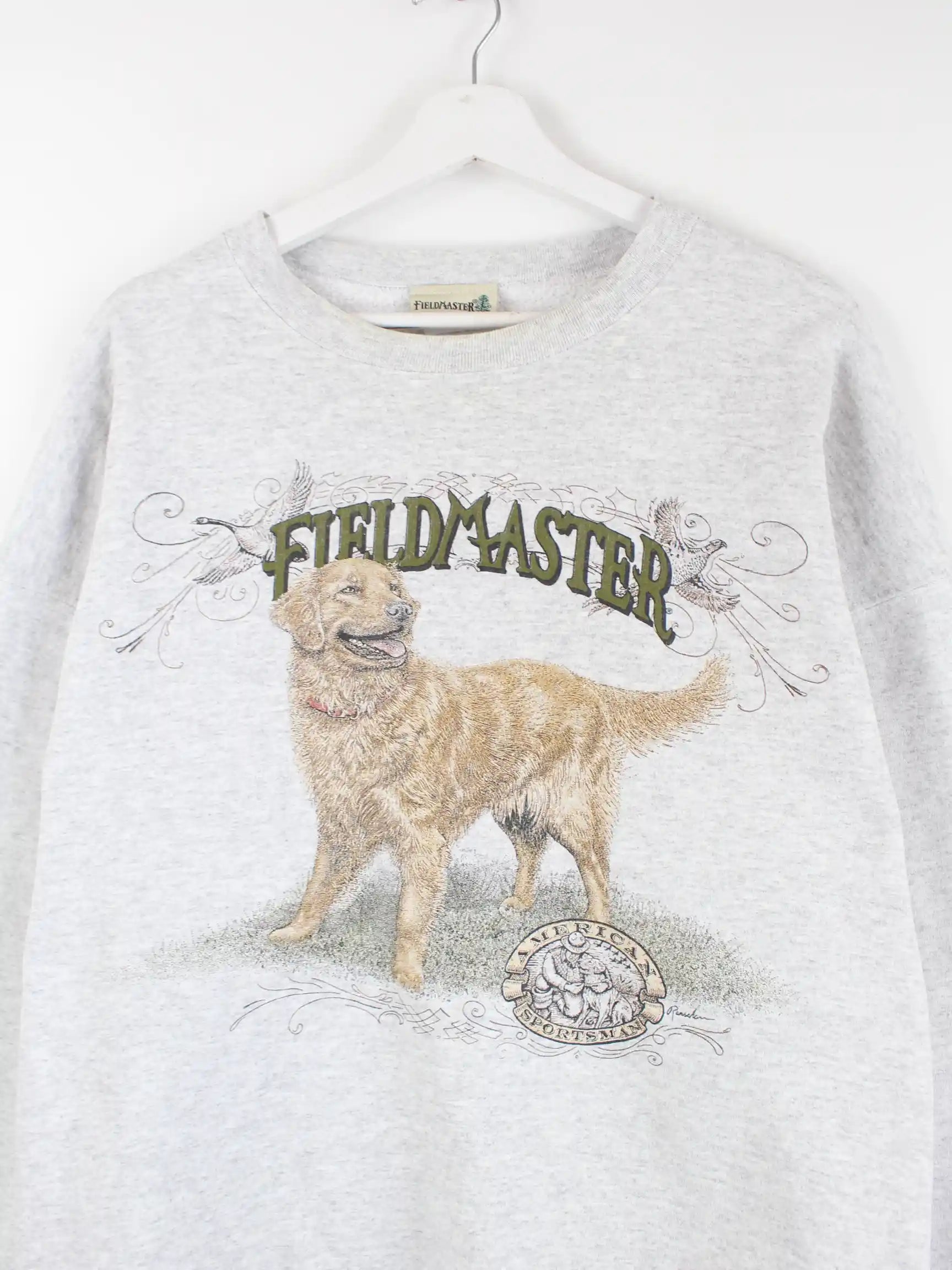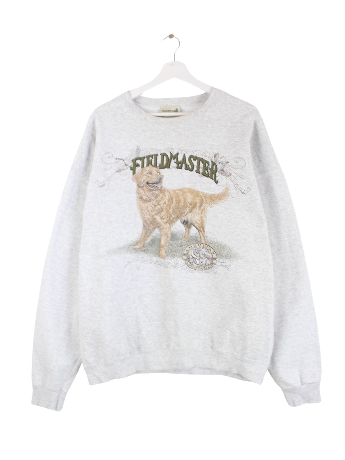 Grauer Vintage Sweater in Größe XL. Er ist aus einer Baumwollmischung hergestellt und in sehr gutem Zustand zu bekommen. Mit chiquem Fieldmaster Print.