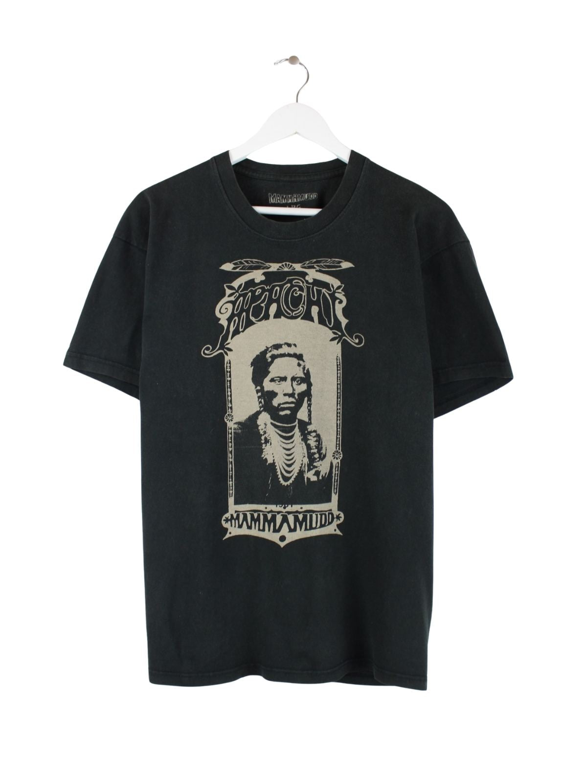 Vintage T-Shirt in Größe L. Es ist aus Baumwolle produziert und in Schwarz in Stock. Mit schickem Indigenous Print.