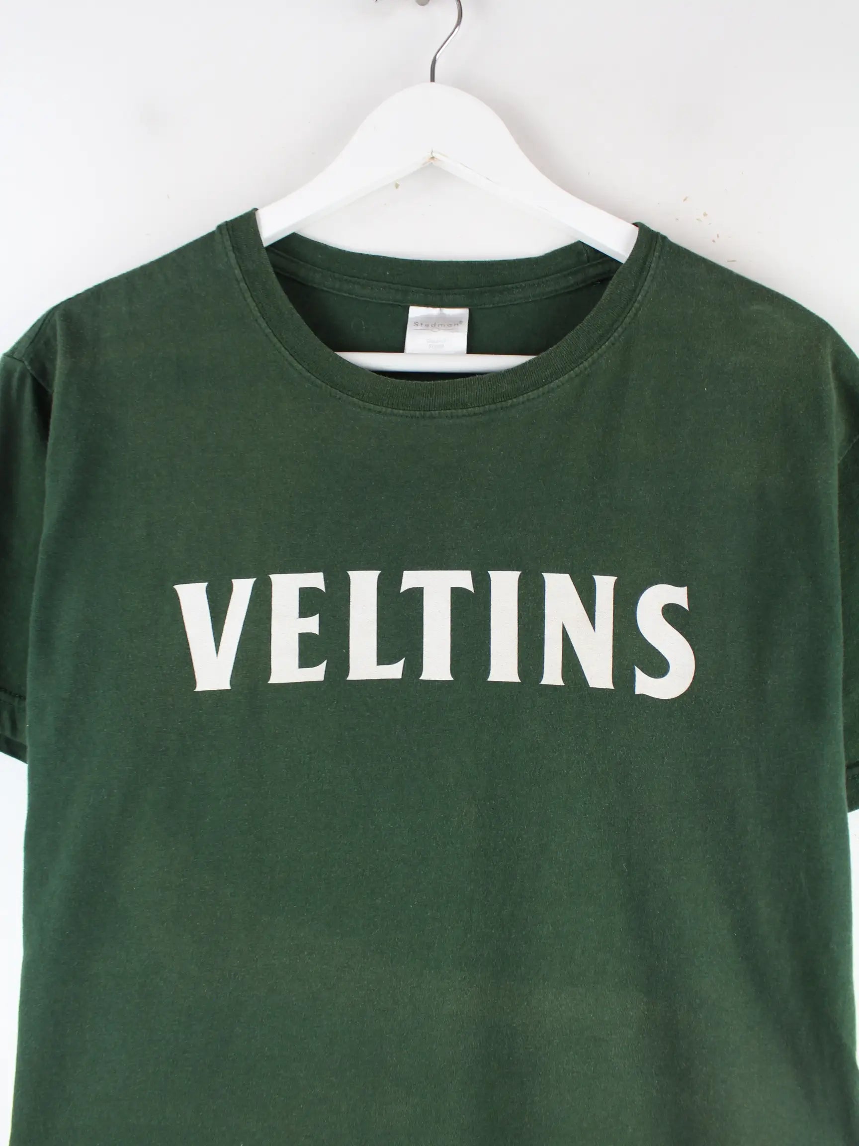 Vintage T-Shirt in Größe M. Es ist aus Baumwolle und in Grün bei uns vorrätig. Mit seltenem Veltins Print.