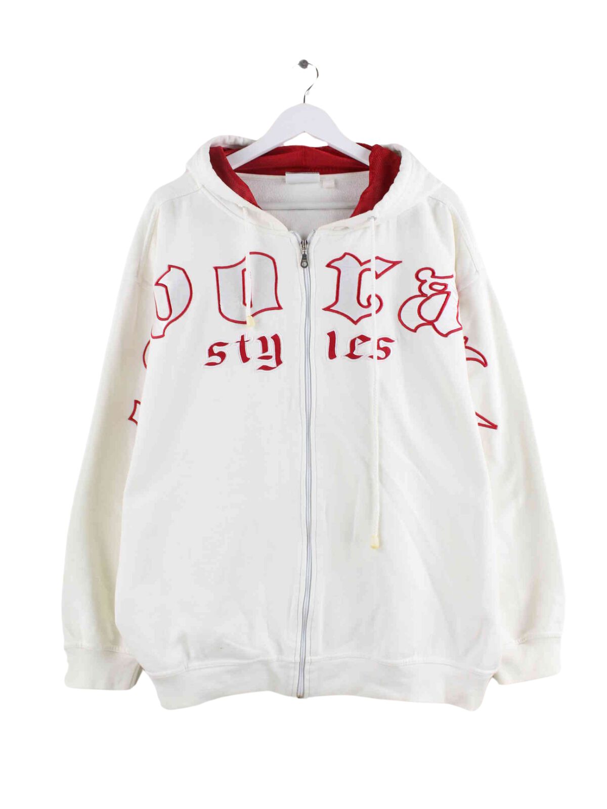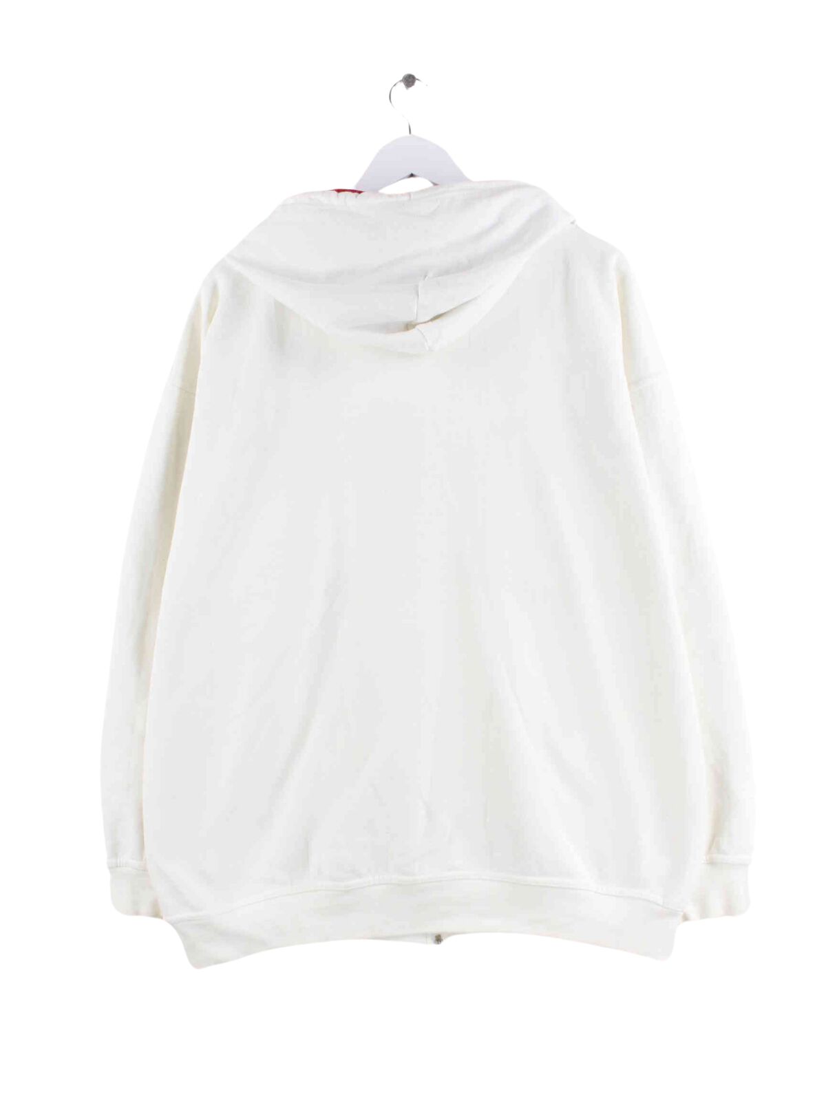 White vintage hoodie with embroidered logo and long zipper from the early 2000s in size XL. It is made from a cotton blend and is in stock in good condition.