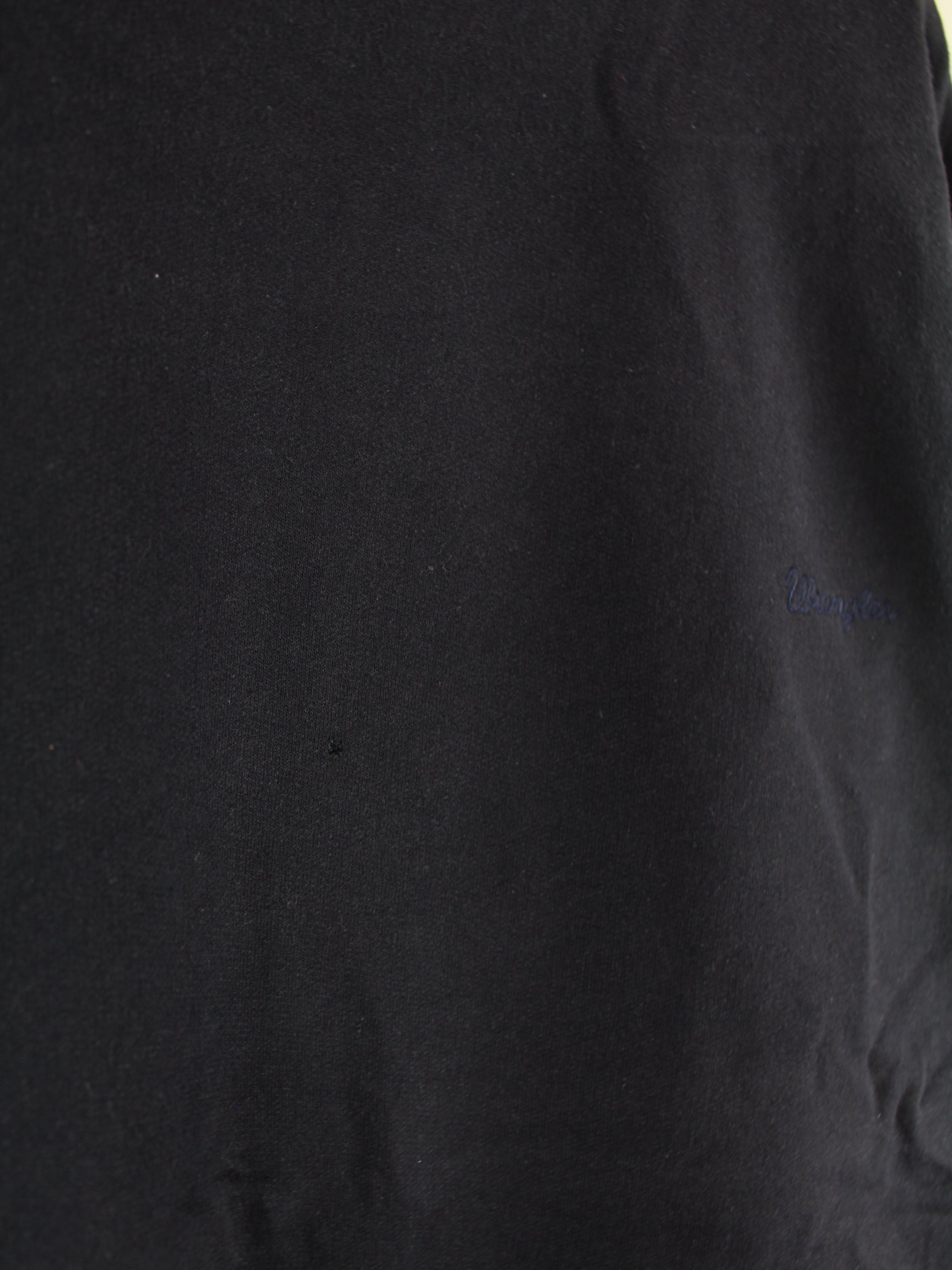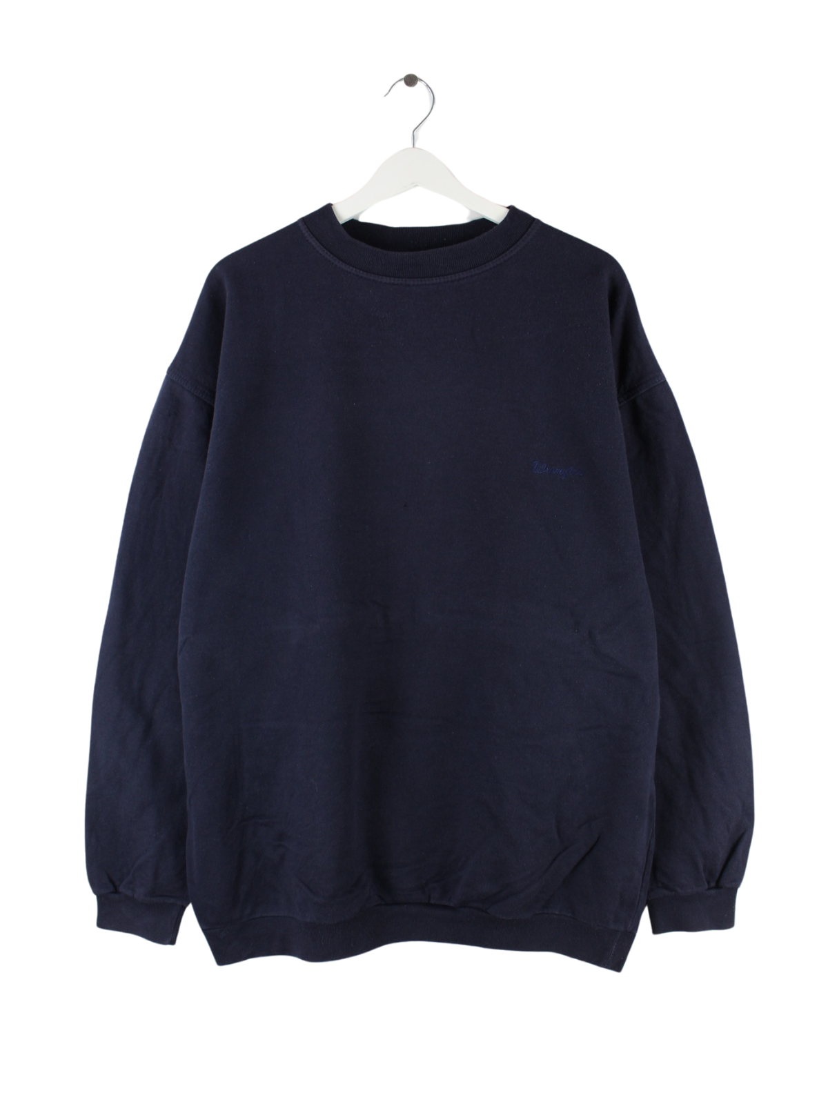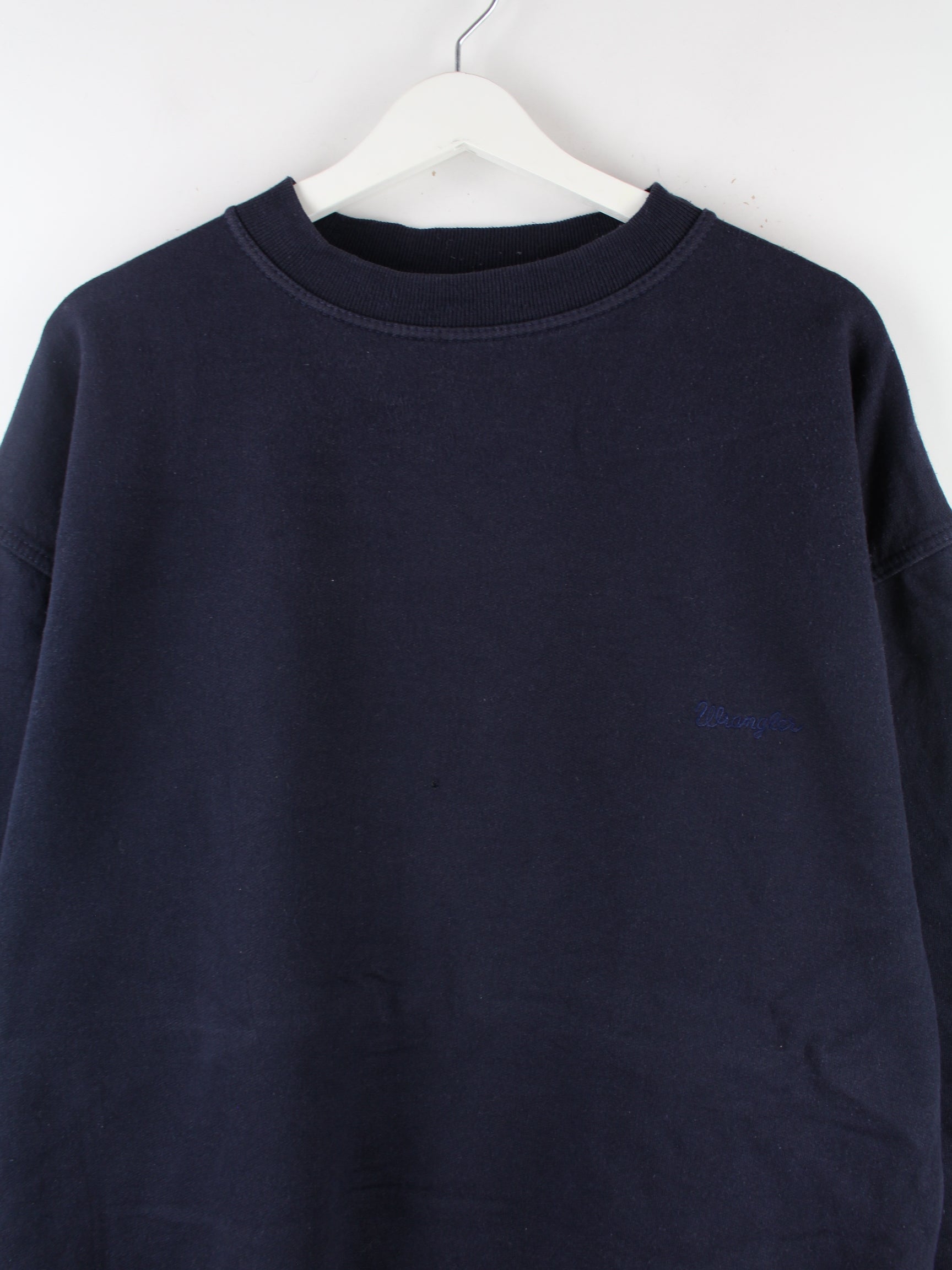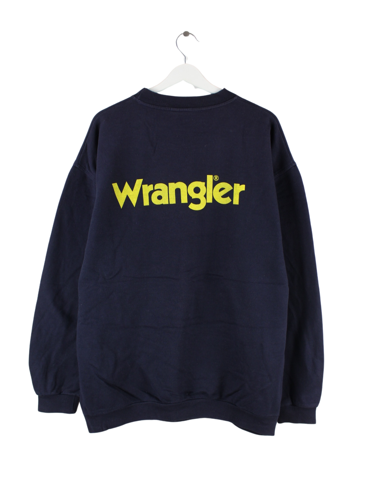Blauer Vintage Wrangler Sweater mit großem Logo Backprint aus den 90er Jahren.