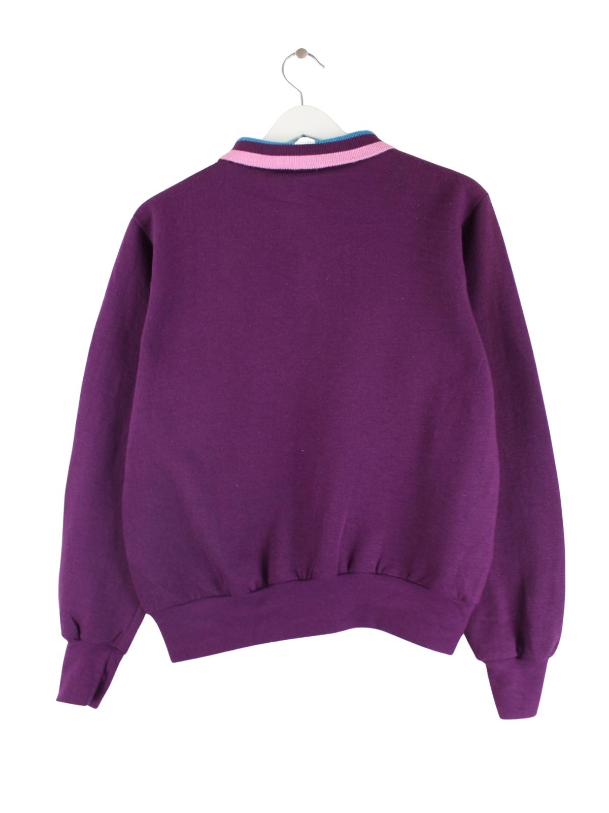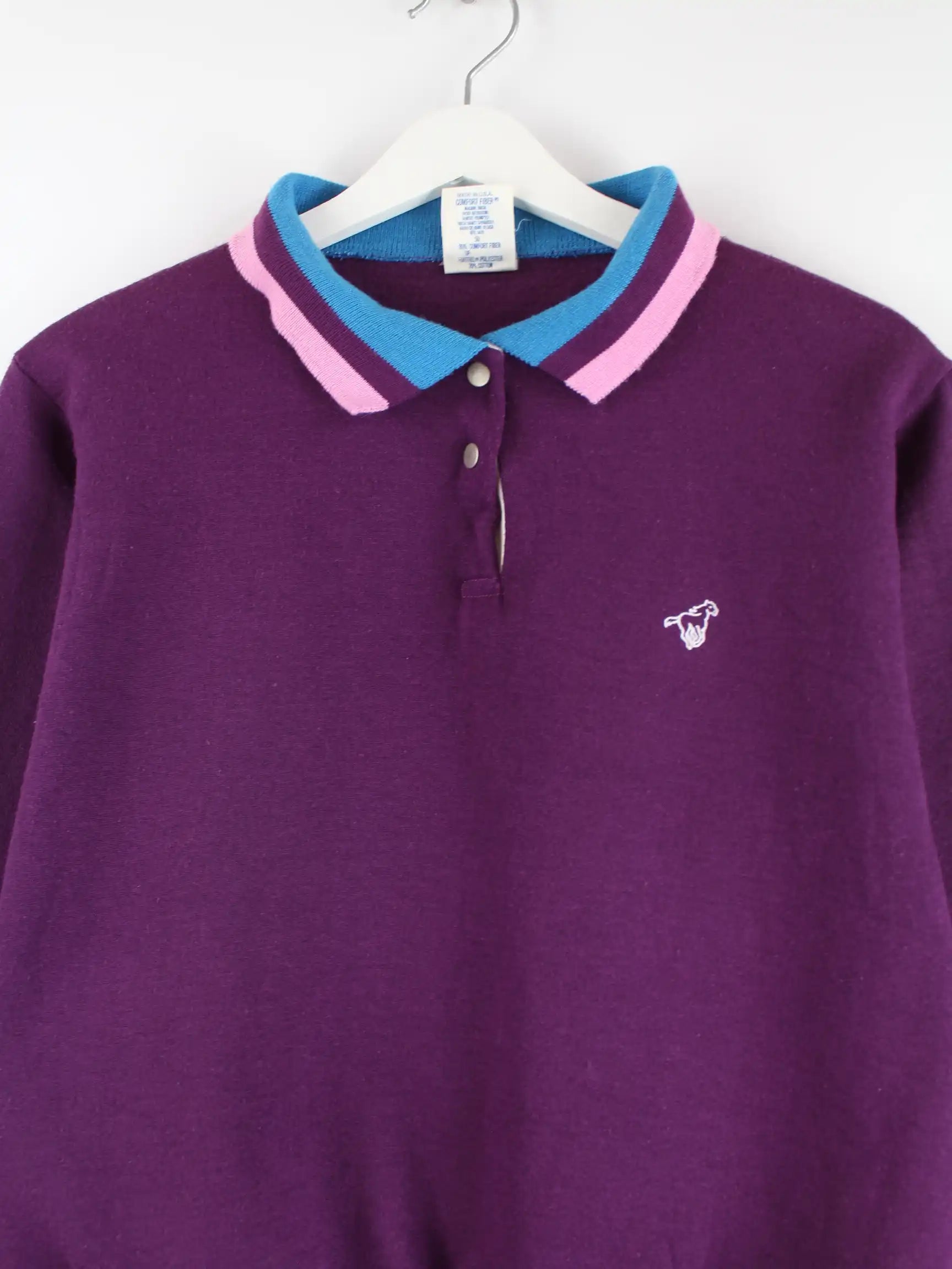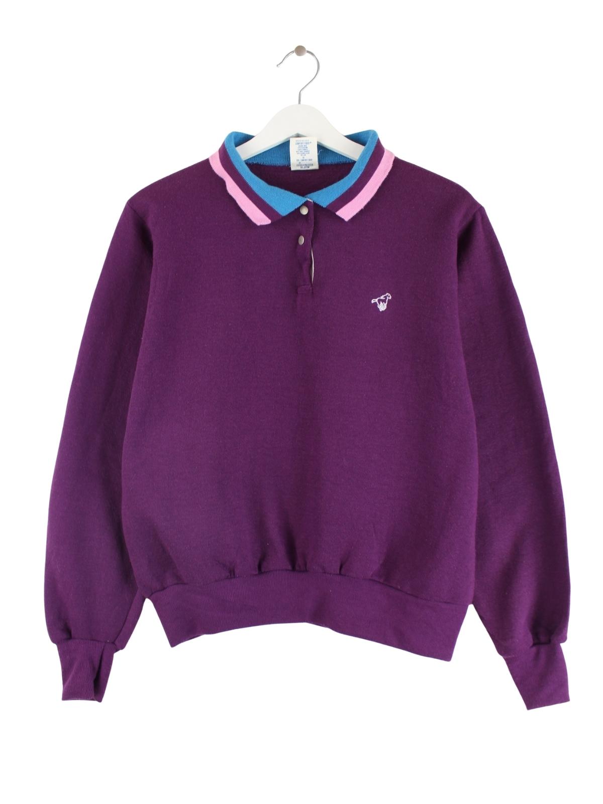 Vintage Damen Sweater der Brand Wrangler in Größe L aus den 80'ern mit Polo Kragen. Er ist aus einer Synthetikmischung hergestellt und in Lila bei uns vorrätig.