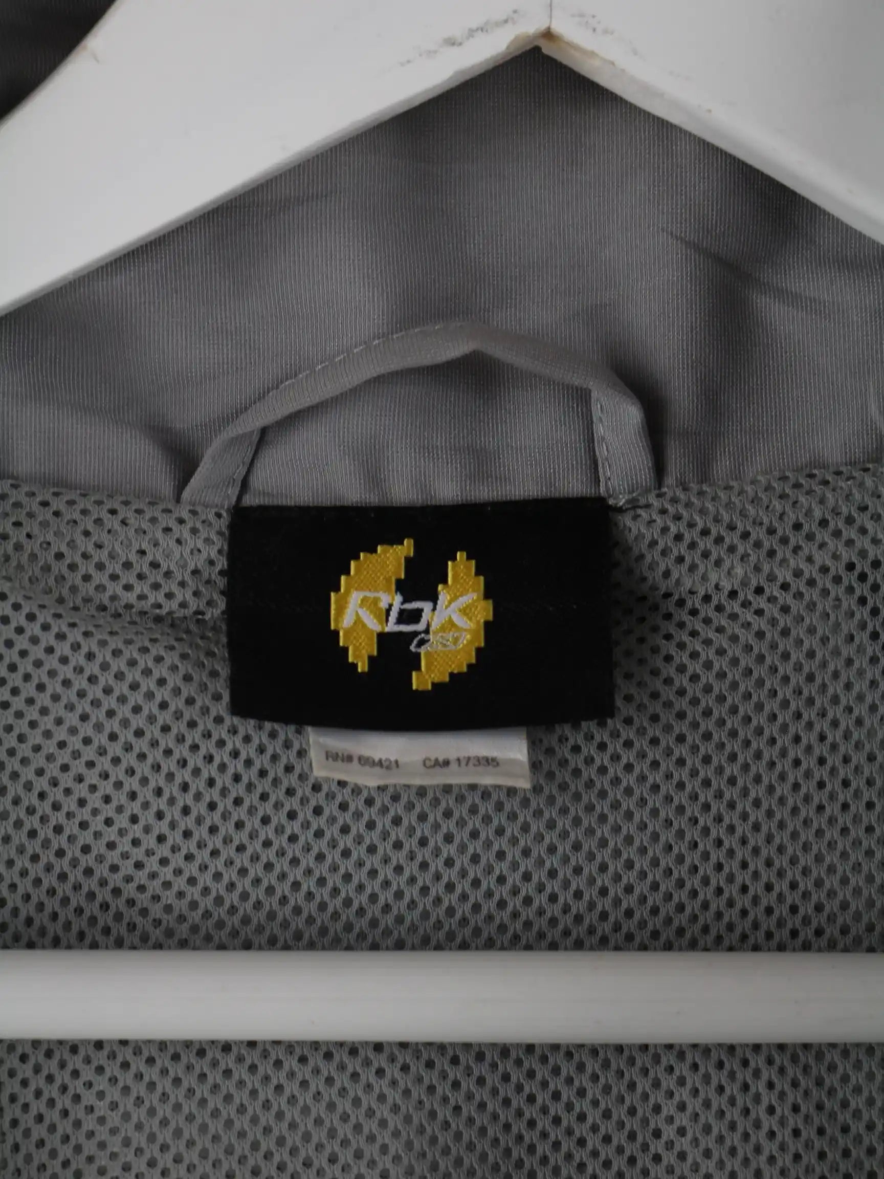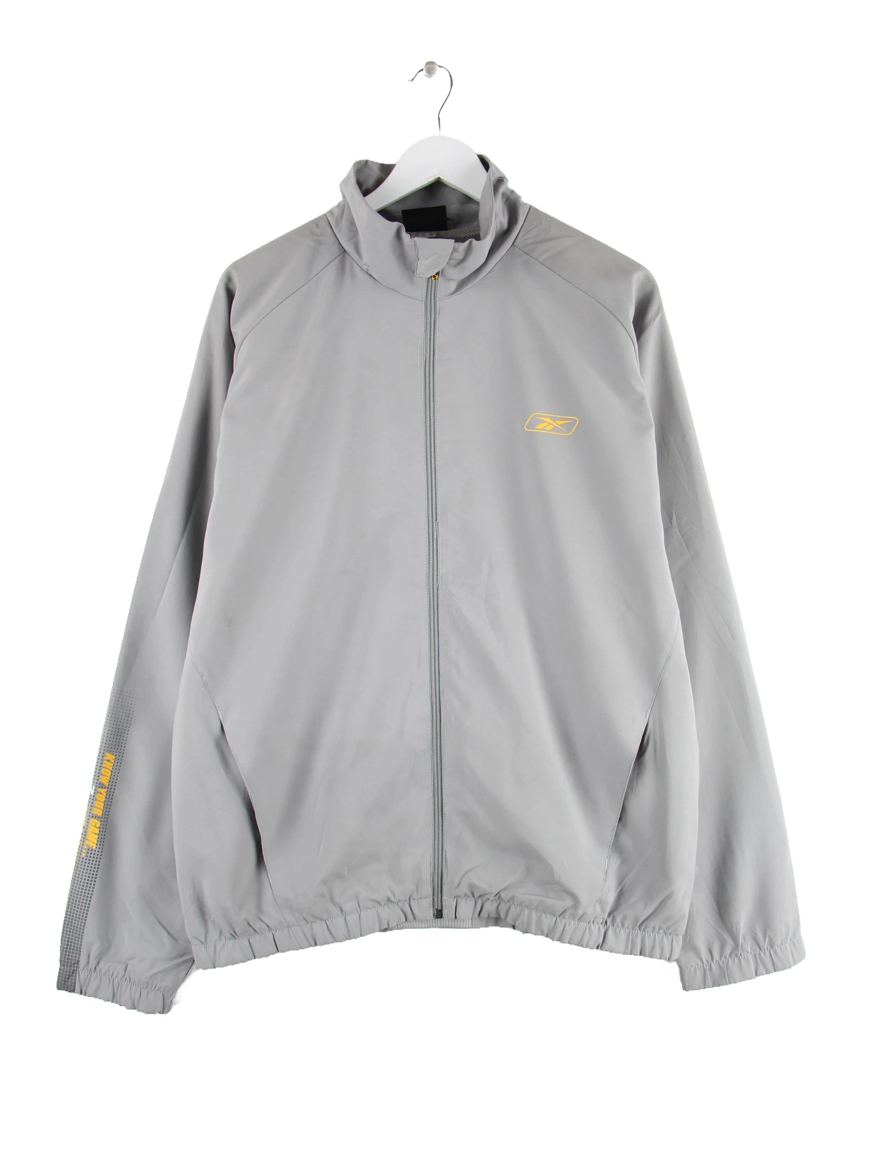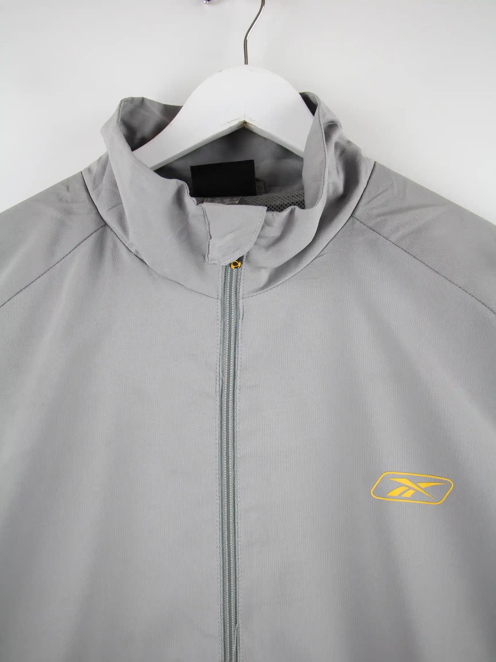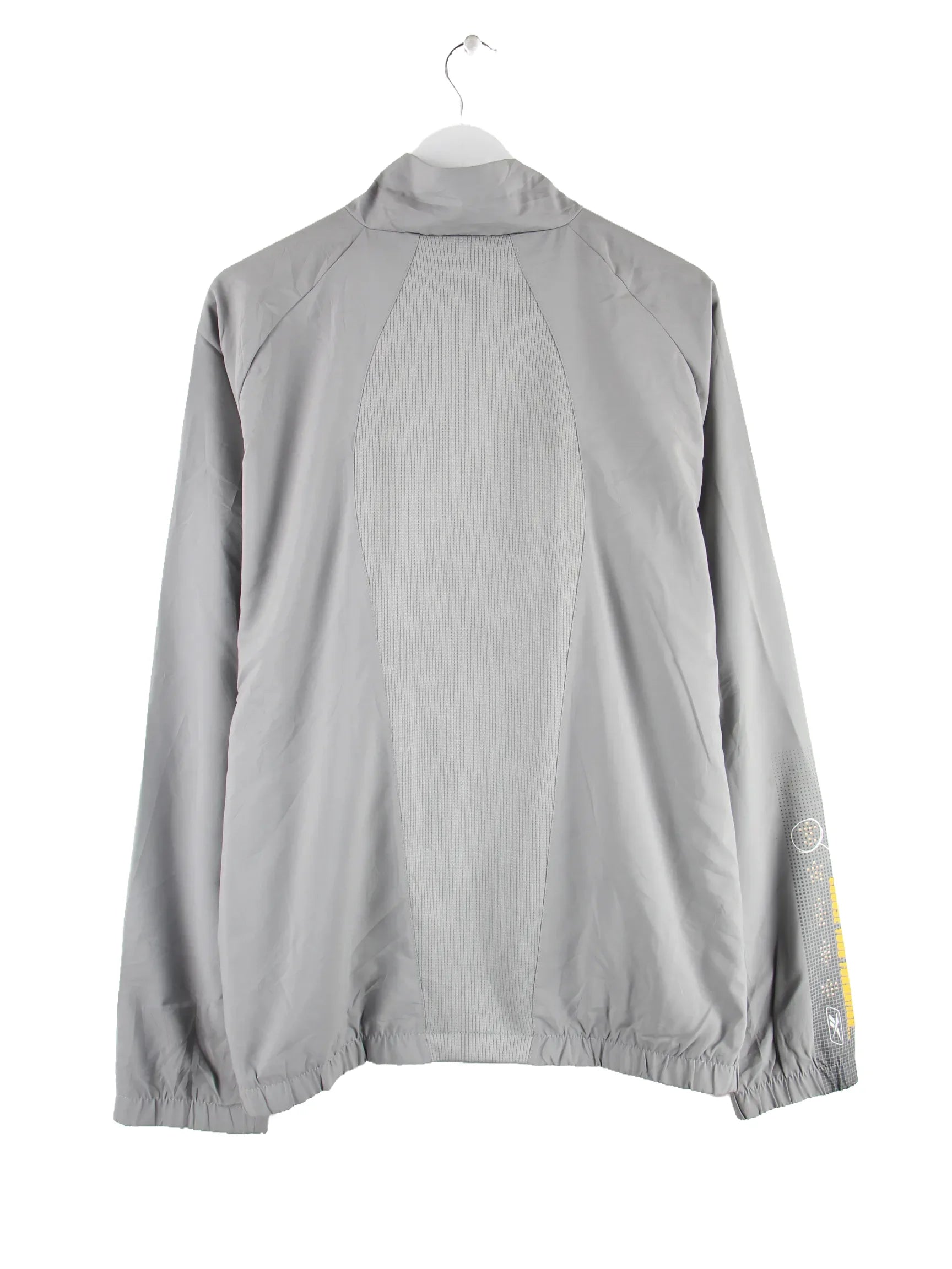 Graue Trainingsjacke der Brand Reebok in Größe L. Sie ist aus Synthetik und in gutem Zustand bei uns zu bekommen.