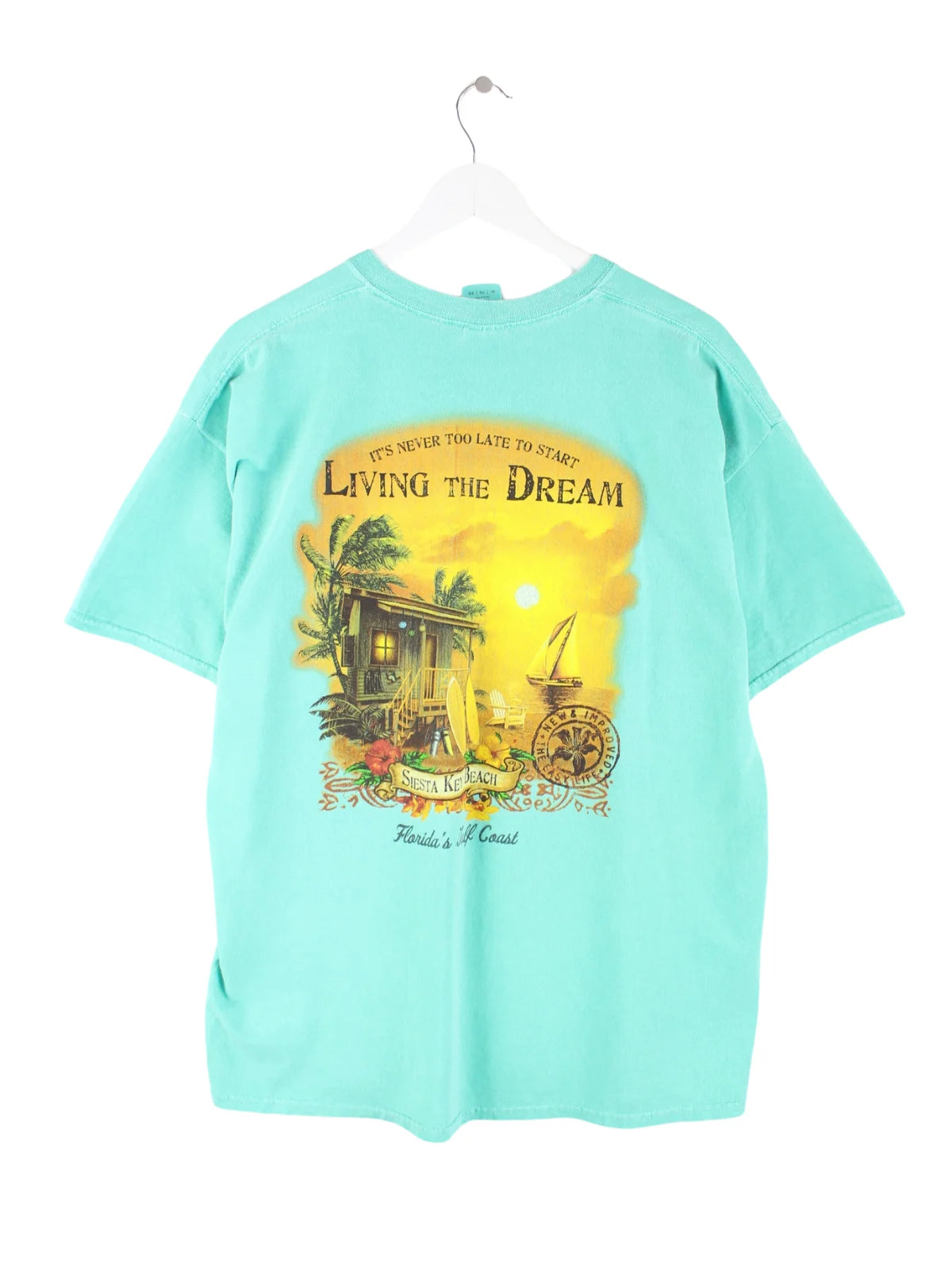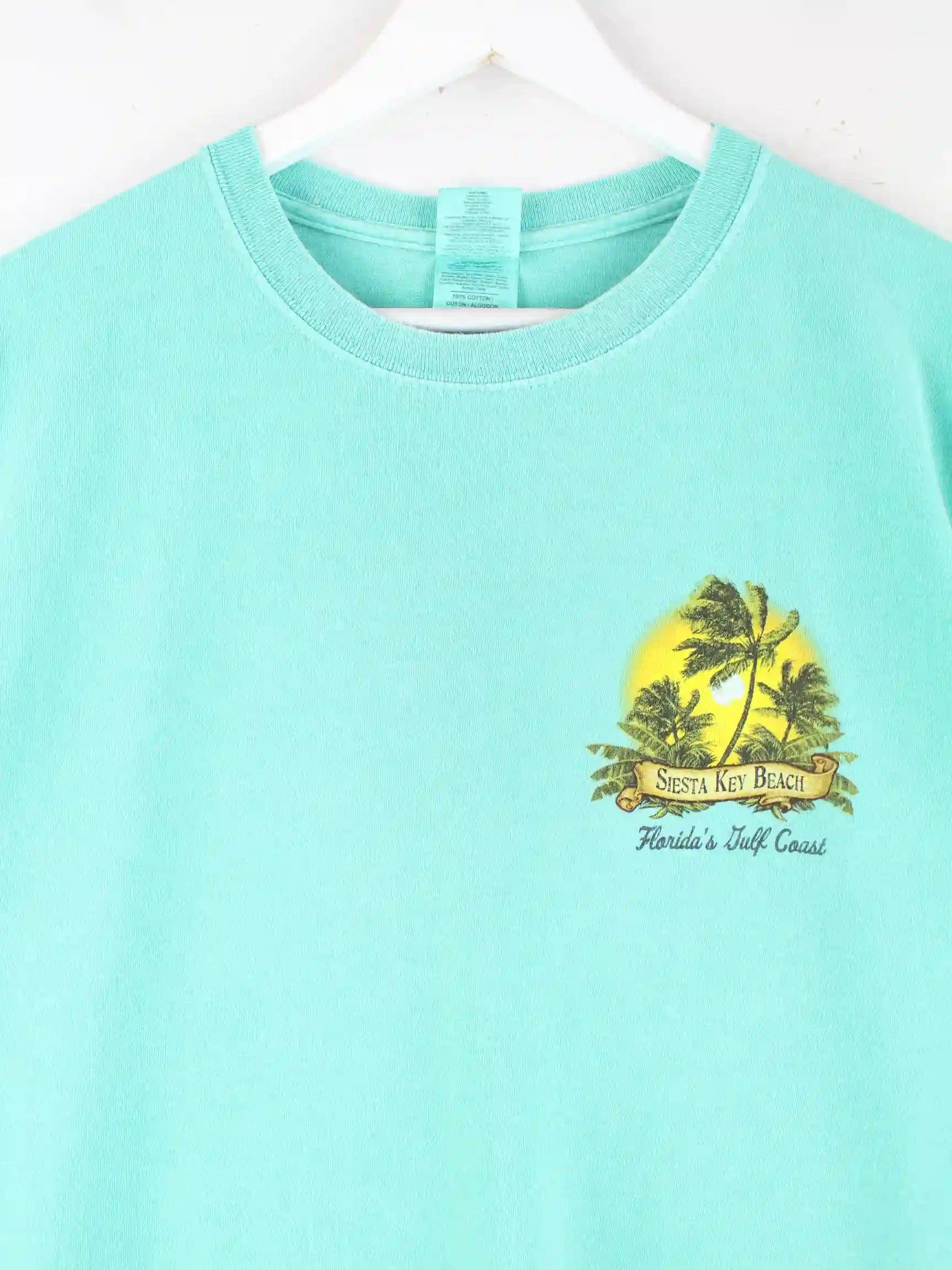 Türkisfarbenes T-Shirt der Brand Gildan in Größe XL. Es ist aus Baumwolle gefertigt und in sehr gutem Zustand im Bestand. Mit schickem Florida Print.