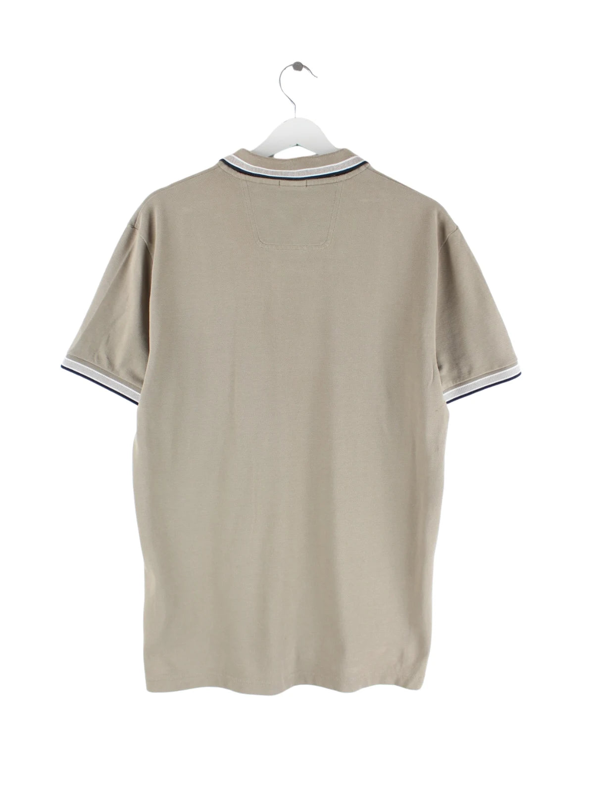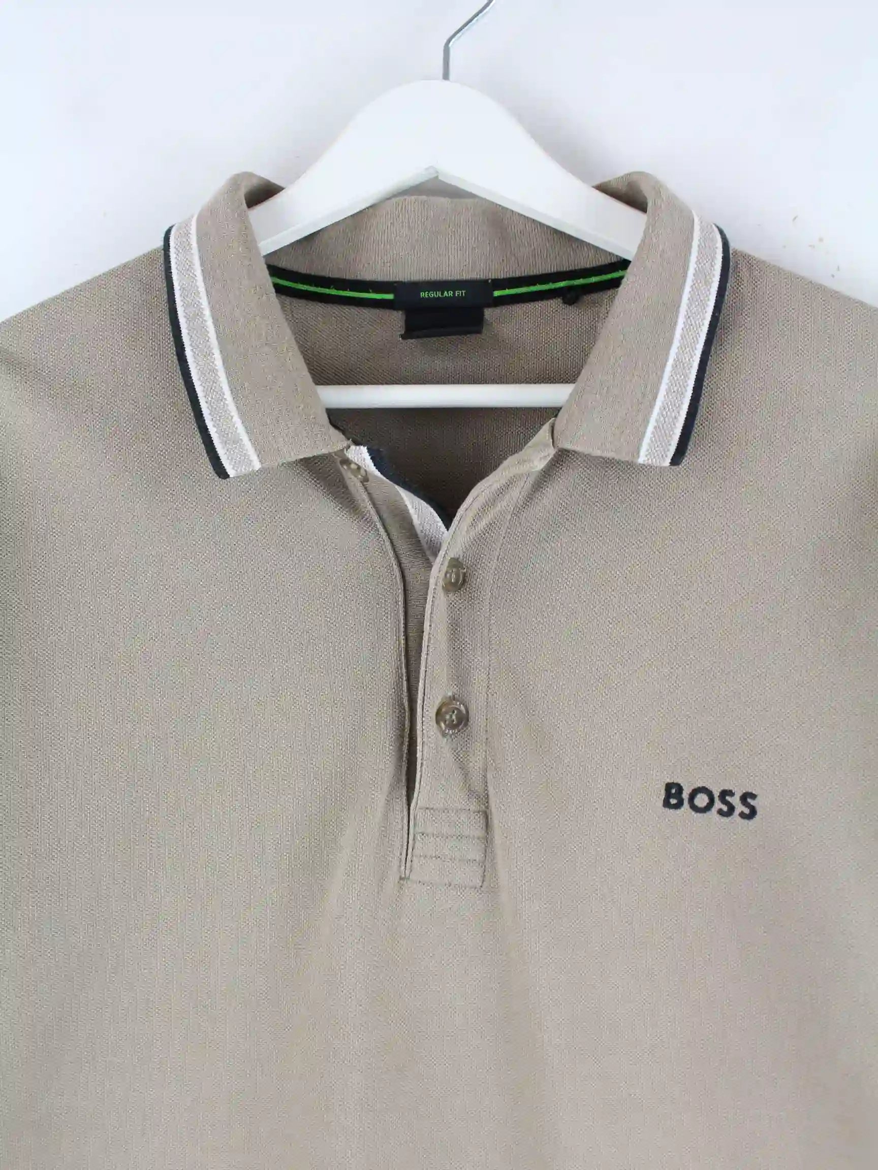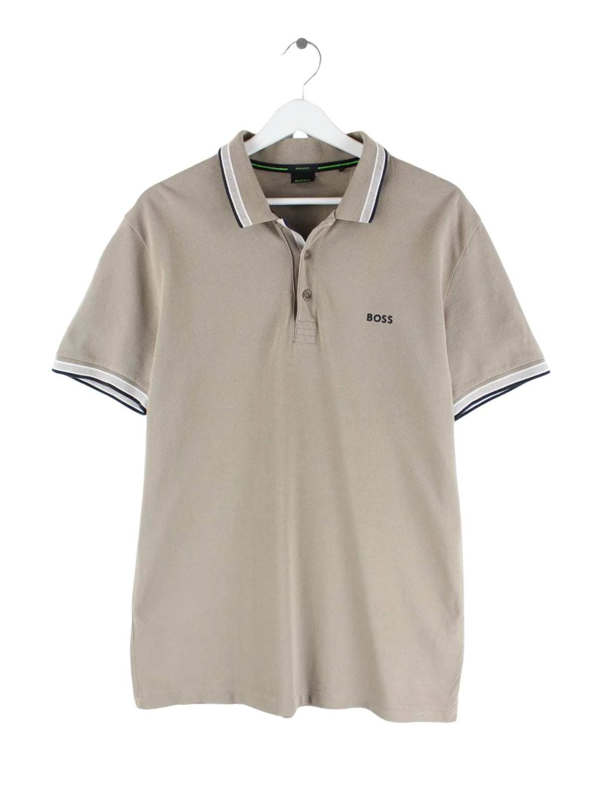 Beigefarbenes Poloshirt der Brand Hugo Boss in Größe L. Es ist aus Baumwolle gefertigt und in sehr gutem Zustand bei uns zu bekommen.