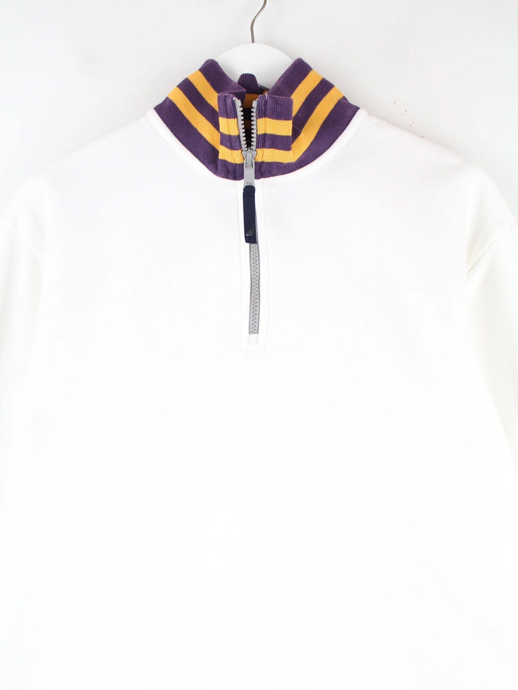 Weißer Sweater mit half Zip aus dem Hause Nautica in Größe M. Er ist aus einer Baumwollmischung hergestellt und in sehr gutem Zustand in Stock.
