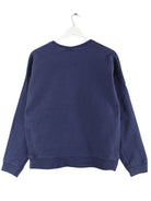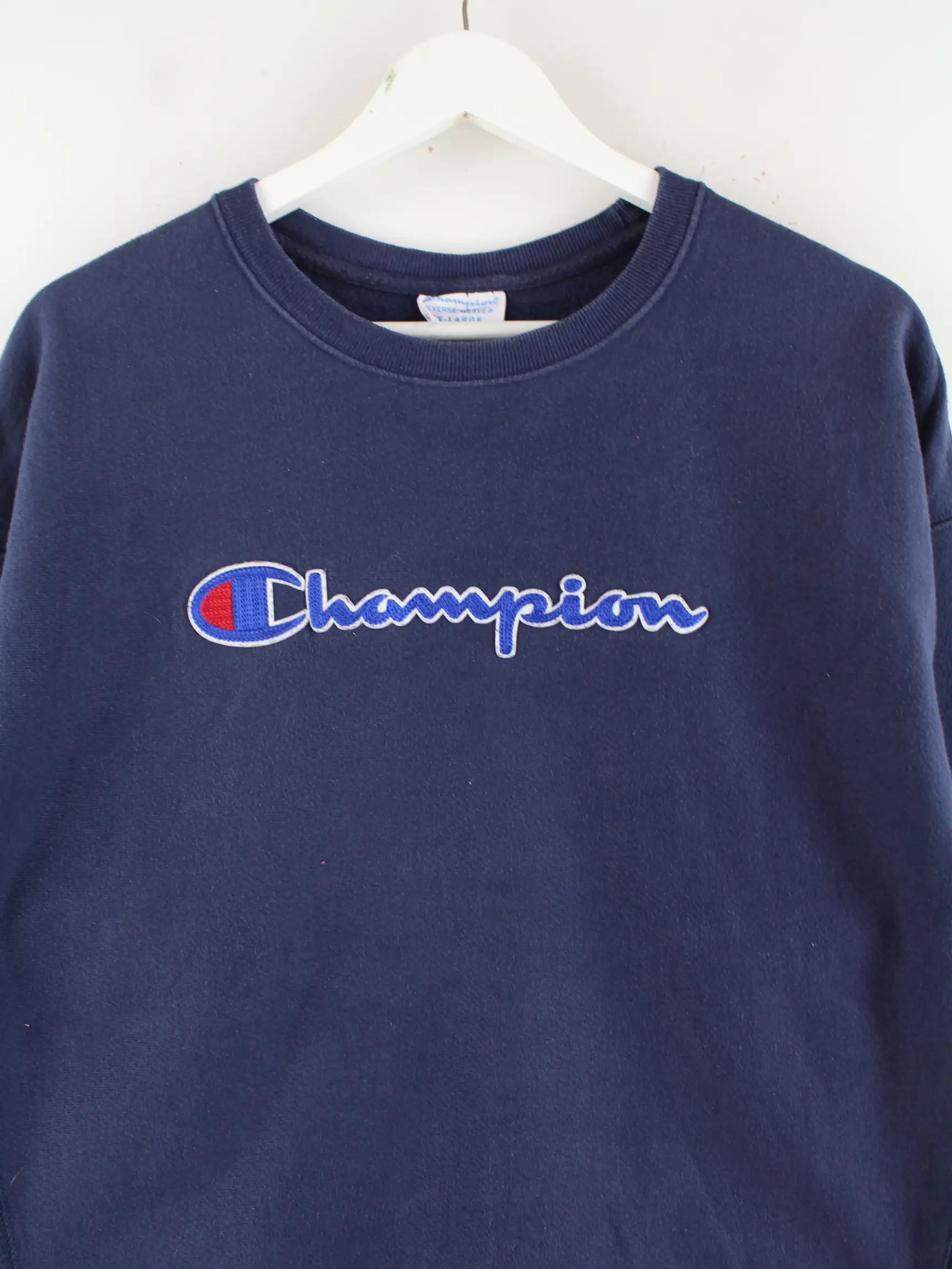 Blauer Sweater mit gestickten Motiven aus dem Hause Champion in Größe M. Er ist aus einer Baumwollmischung produziert und in sehr gutem Zustand vorrätig.