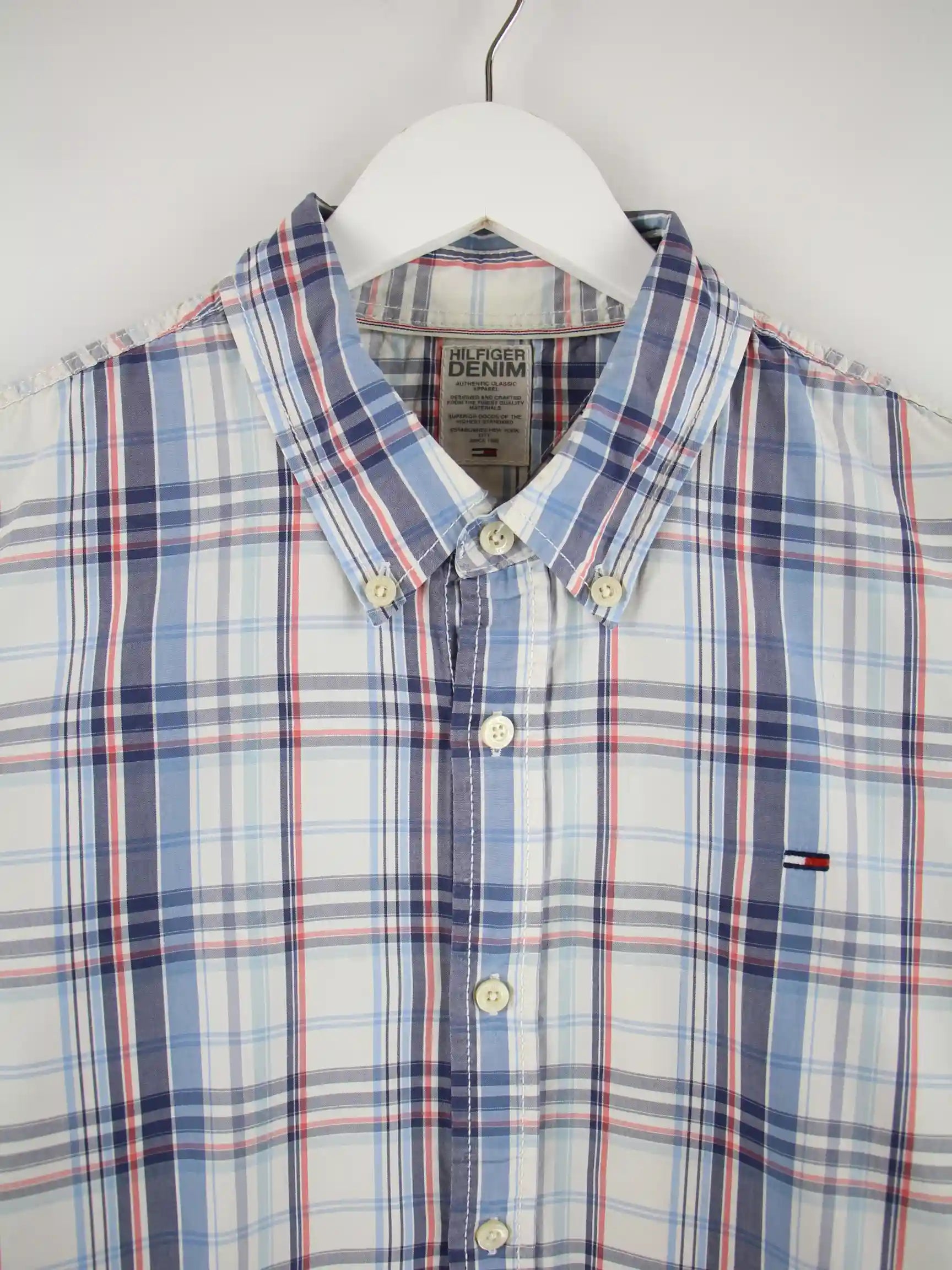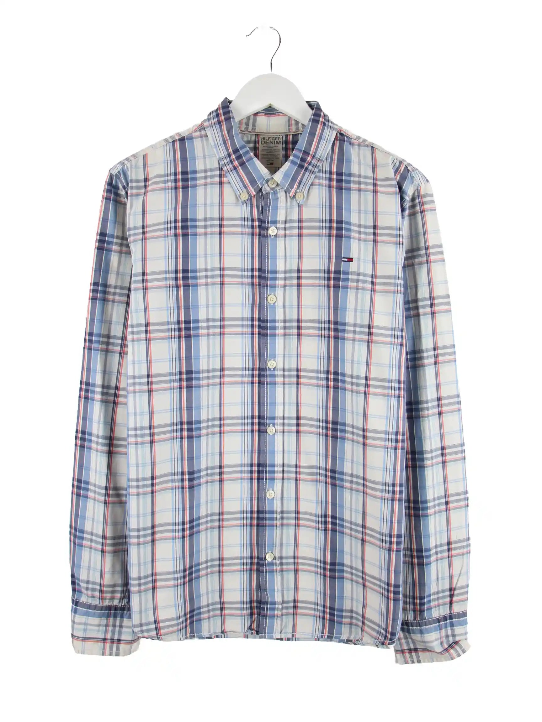 Hemd der Brand Tommy Hilfiger in Größe L. Es ist aus Baumwolle gemacht und in Blau bei uns vorrätig.