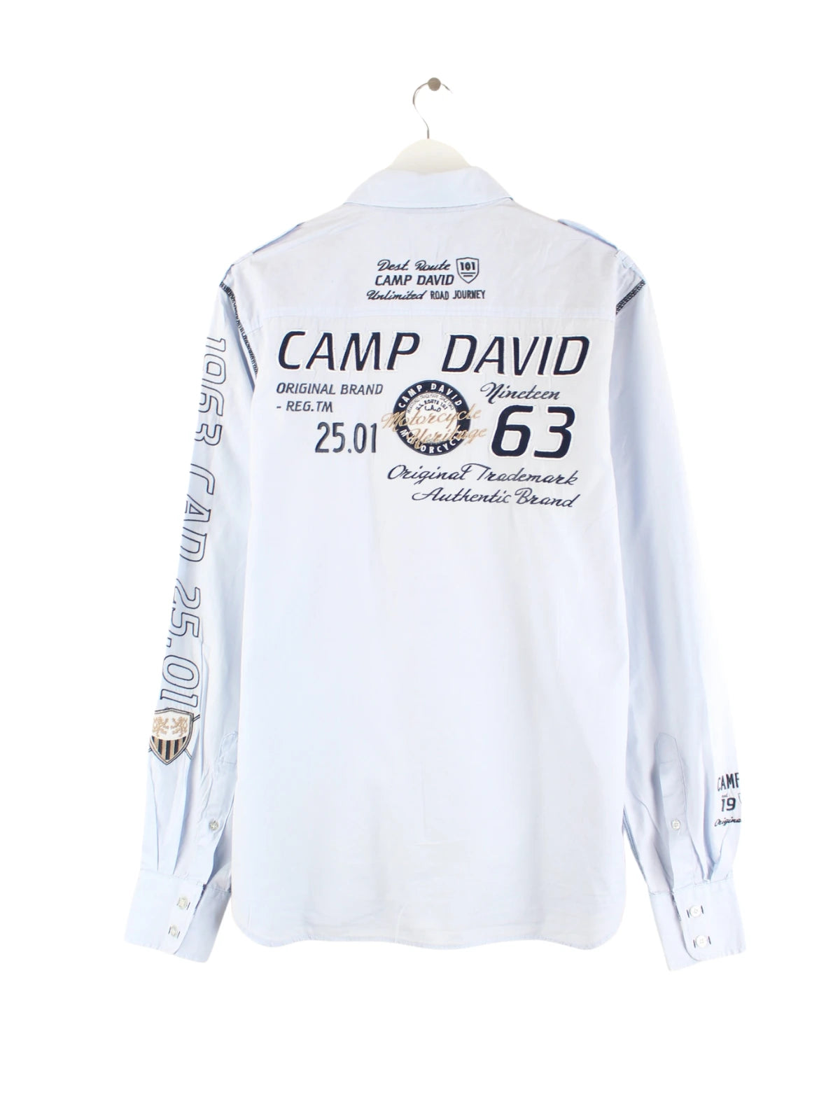 Freizeit Hemd des Labels Camp David mit gesticktem Logo in Größe L. Es ist aus Baumwolle angefertigt und in Blau vorrätig.