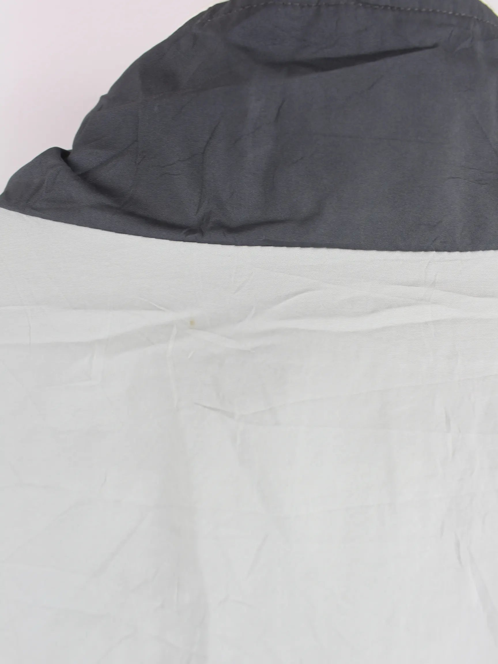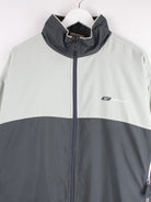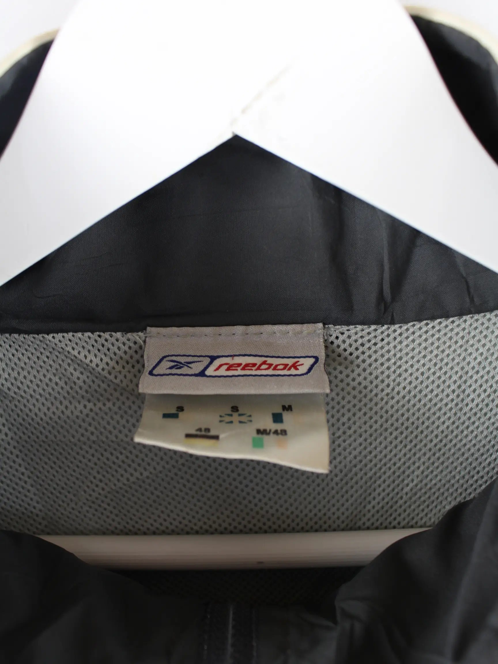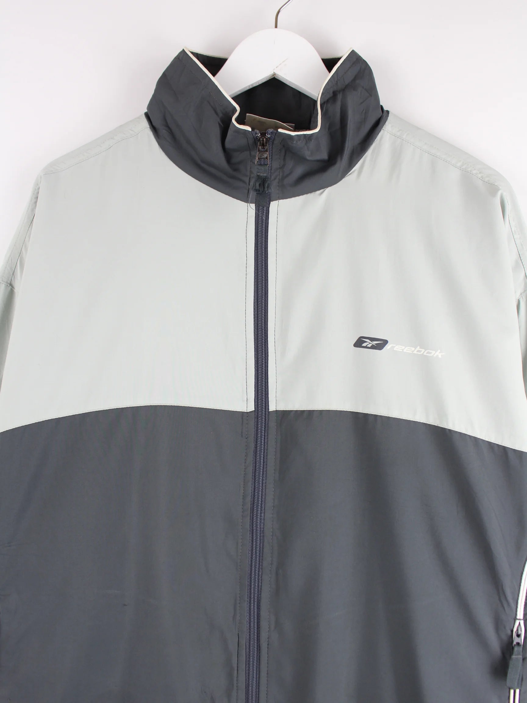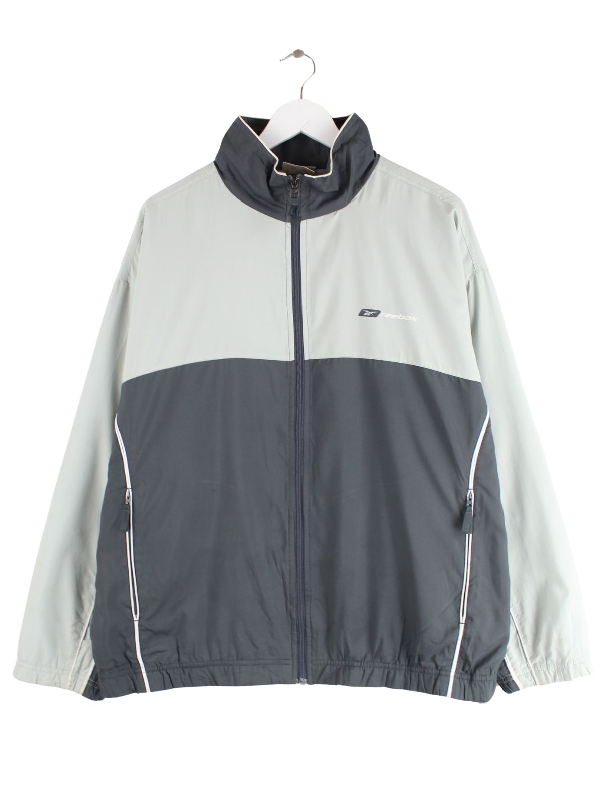 Graue Trainingsjacke des Labels Reebok in Größe M. Sie ist aus Synthetik produziert und in gutem Zustand bei uns vorrätig.
