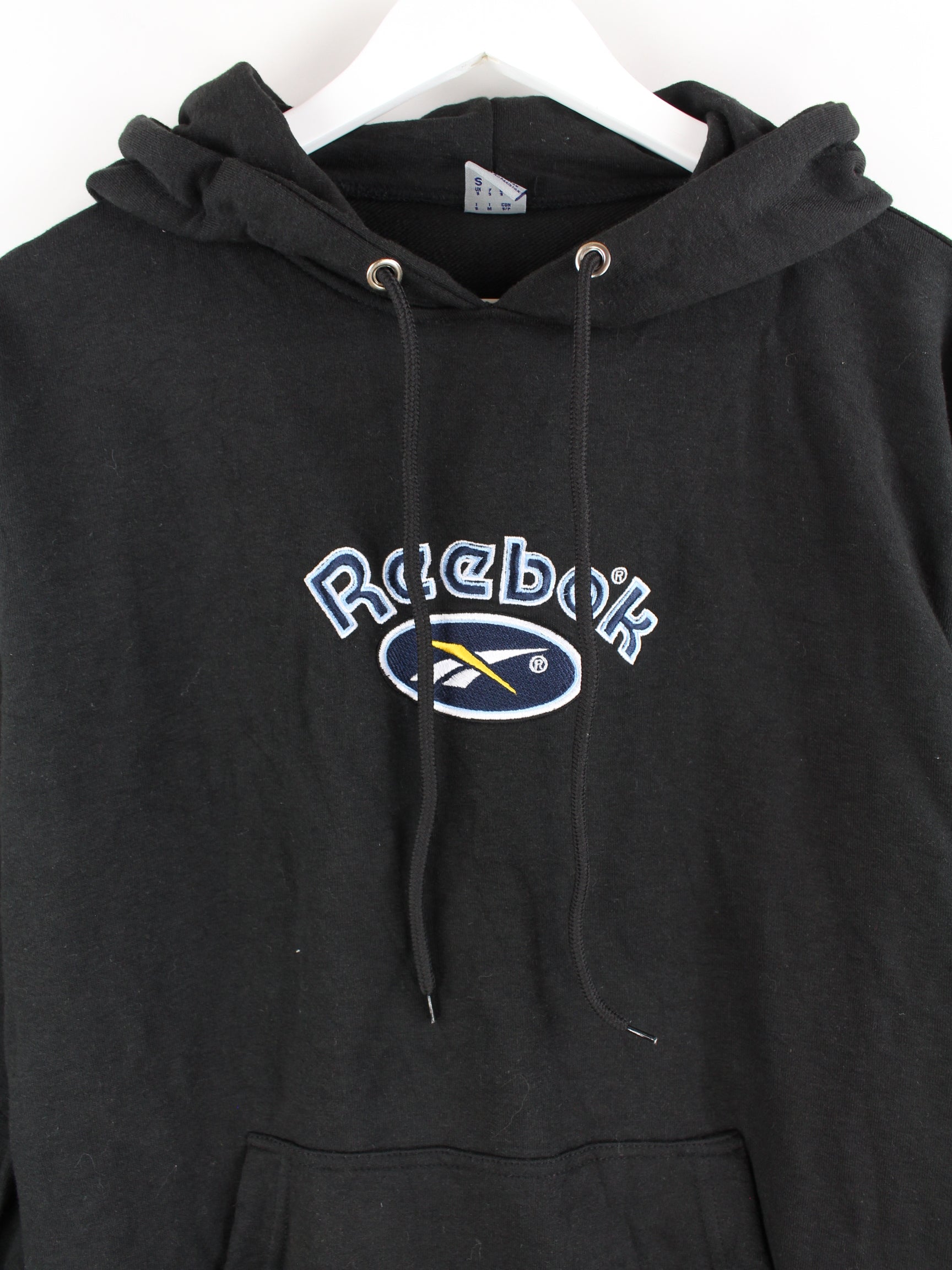 Hoodie von Reebok mit gestickten Motiven in Größe S. Er ist aus einer Baumwollmischung produziert und in Schwarz im Angebot.