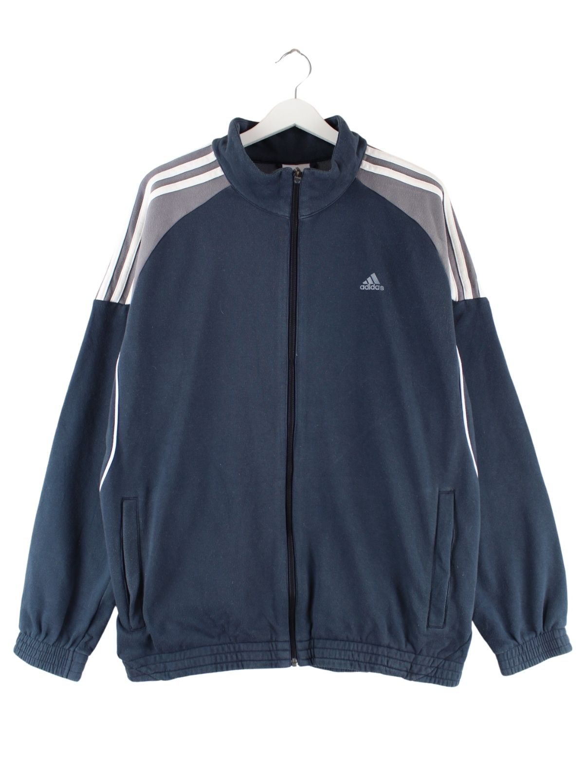 Sweatjacke vom Brand Adidas in Größe L. Sie ist aus einer Baumwollmischung hergestellt und in Blau auf Lager.