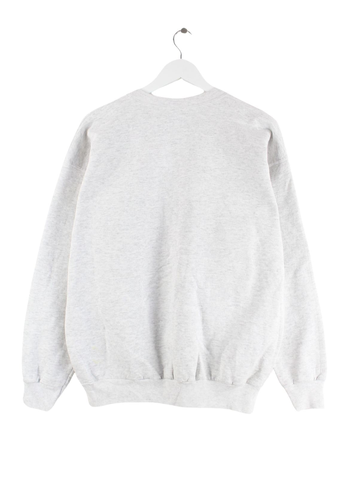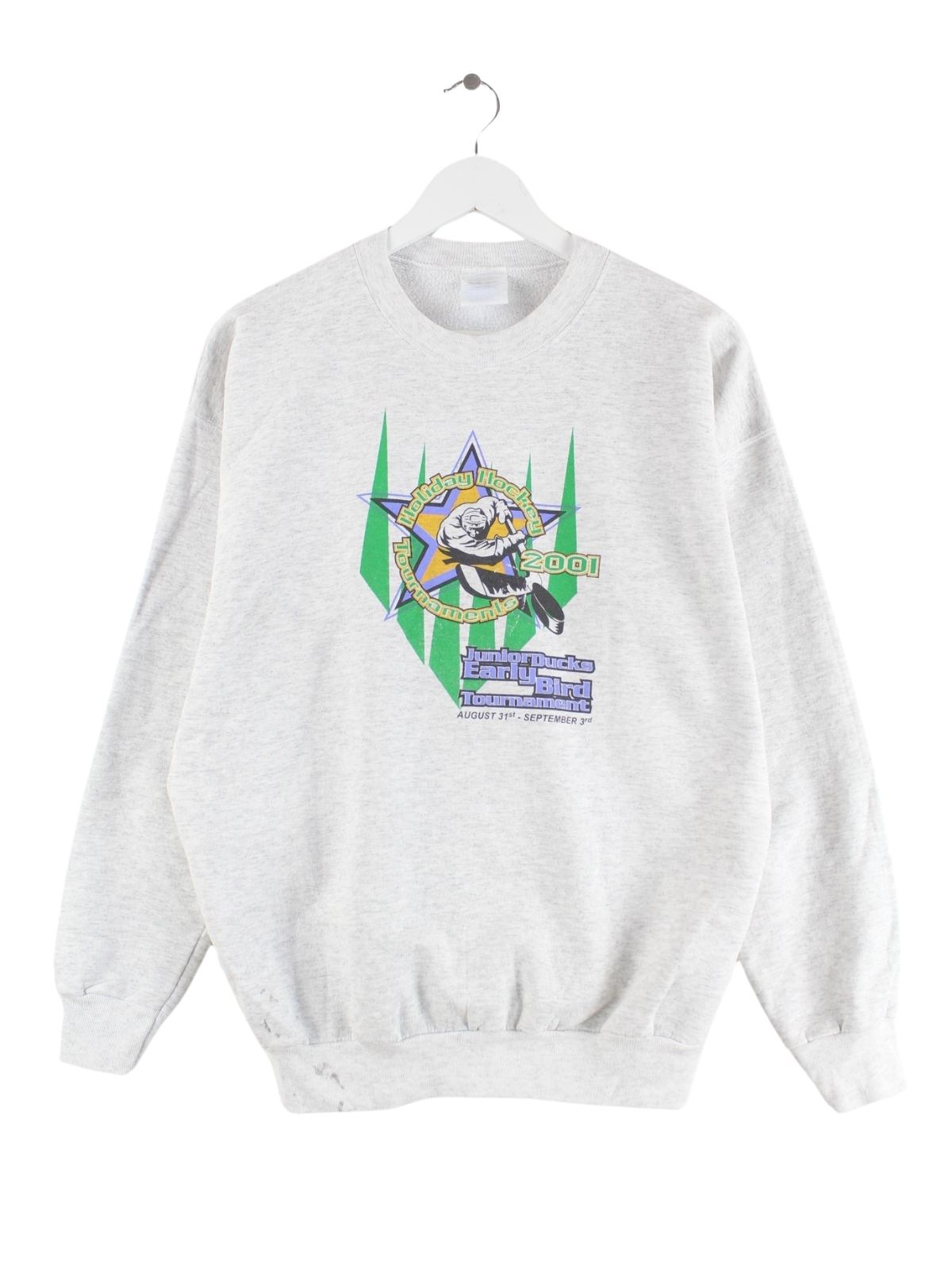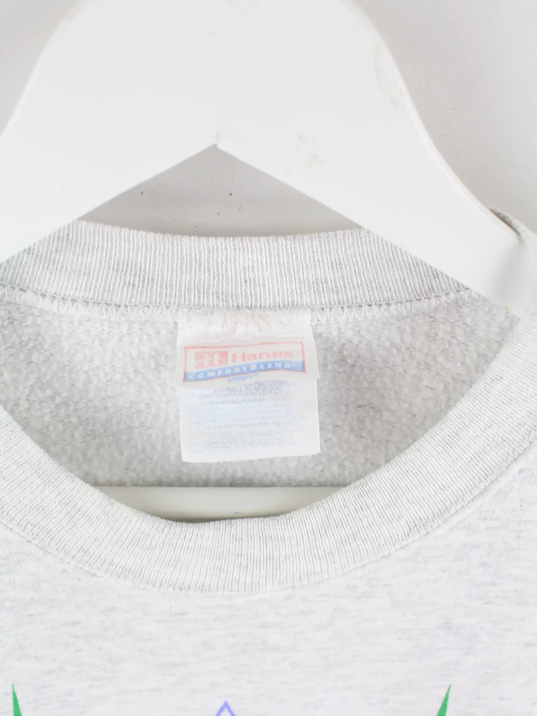 Grauer Sweater vom Label Hanes in Größe L. Er ist aus einer Baumwollmischung produziert. Den Zustand würden wir als 'In Ordnung' bezeichnen (vergl. Bilder).Mit tollem Hockey Print.