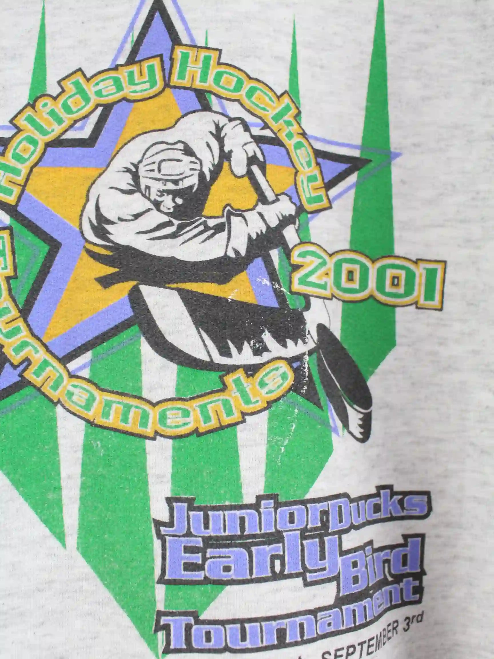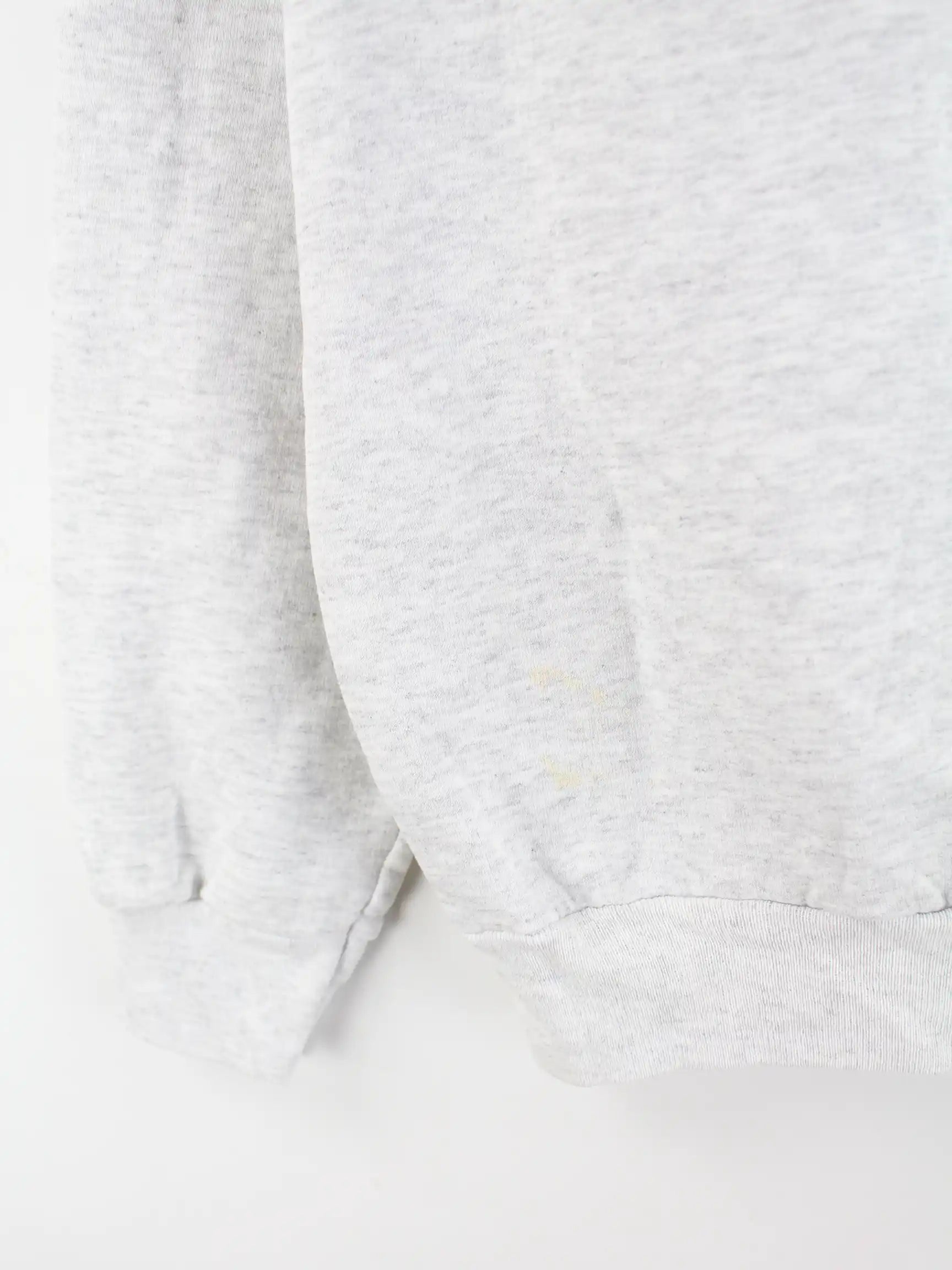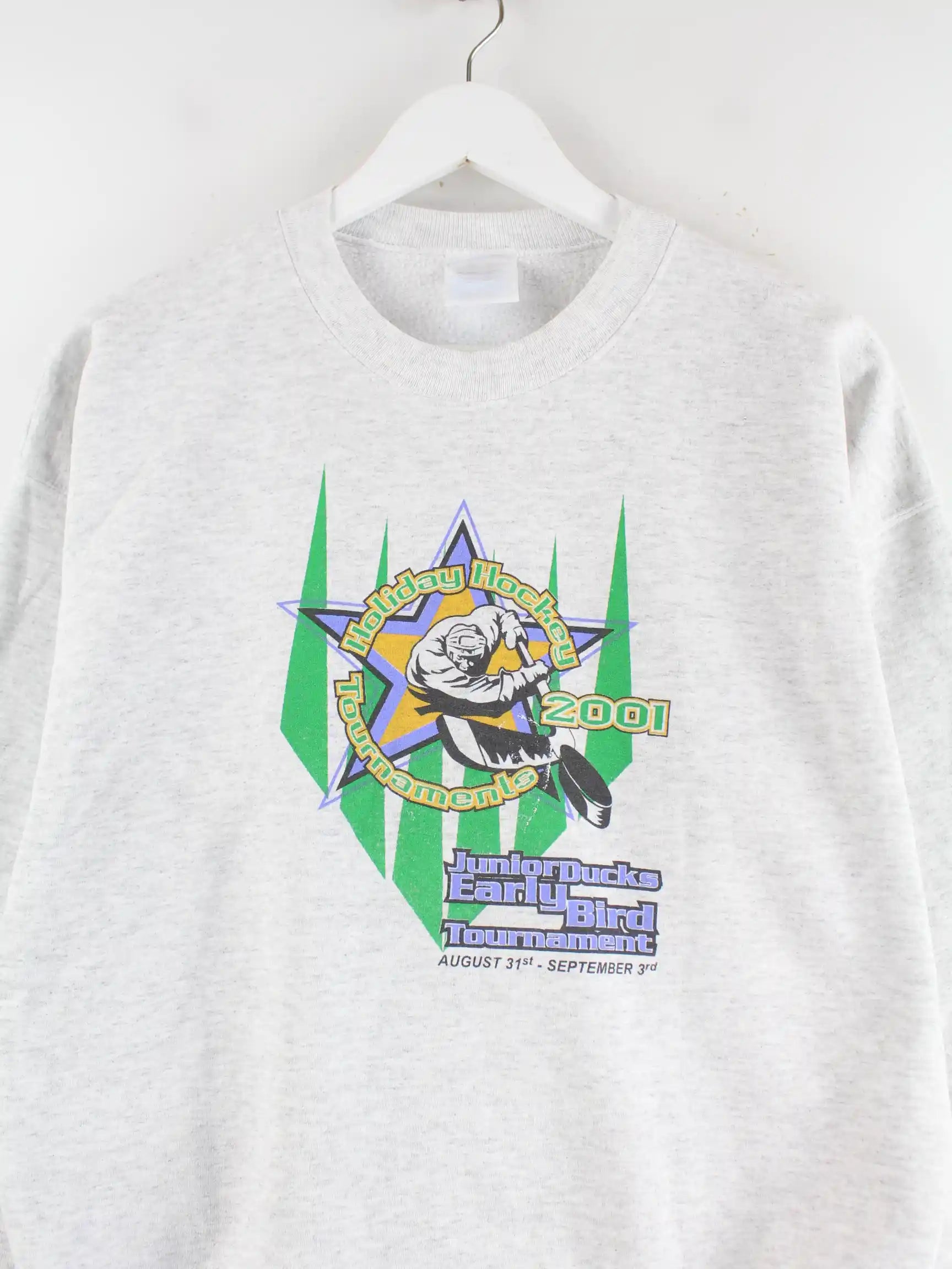 Grauer Sweater vom Label Hanes in Größe L. Er ist aus einer Baumwollmischung produziert. Den Zustand würden wir als 'In Ordnung' bezeichnen (vergl. Bilder).Mit tollem Hockey Print.