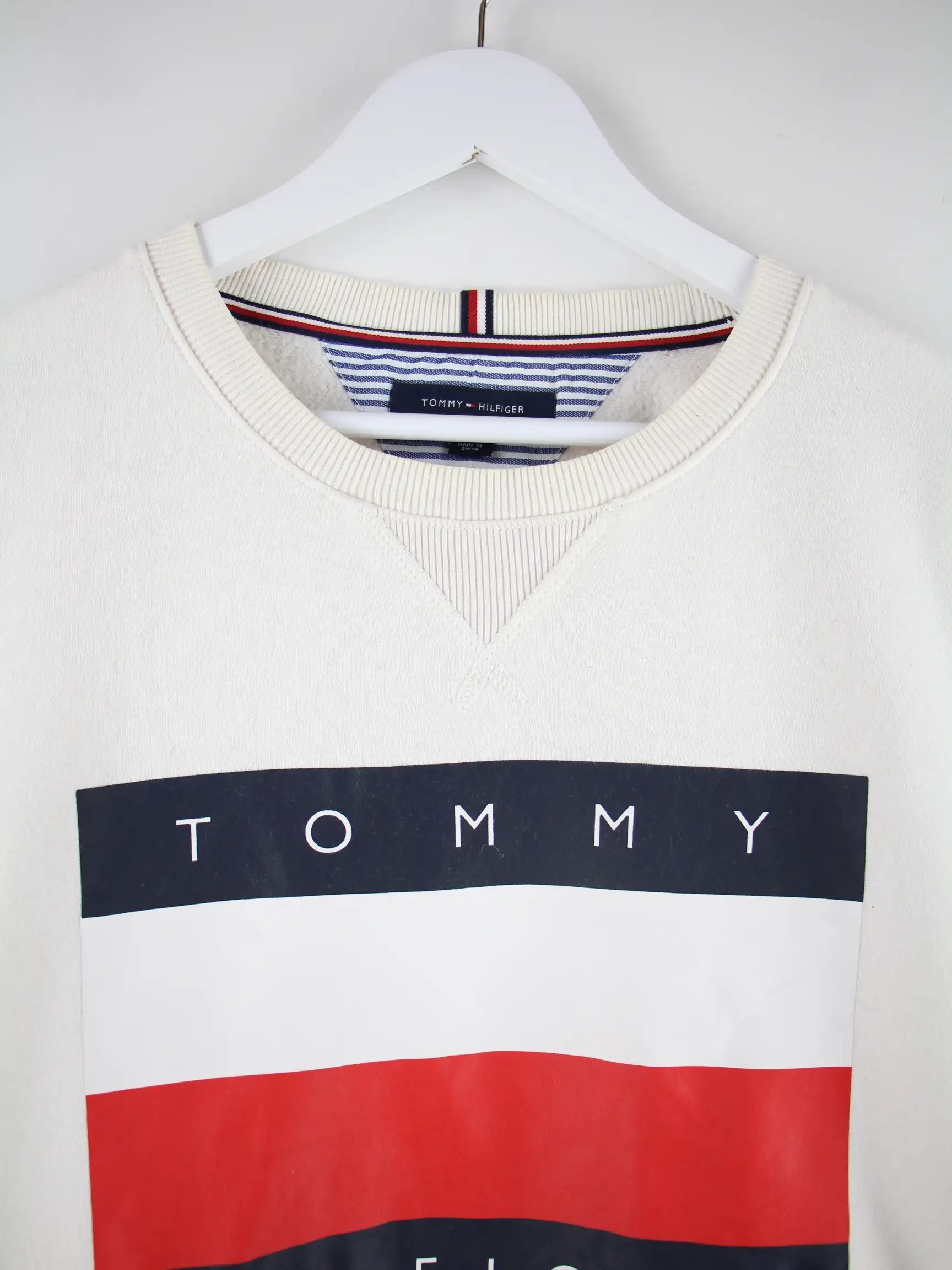 Sweater der Marke Tommy Hilfiger in Größe XXL. Er ist aus einer Baumwollmischung angefertigt und in Weiß zu haben. Mit chiquem Logo Print.
