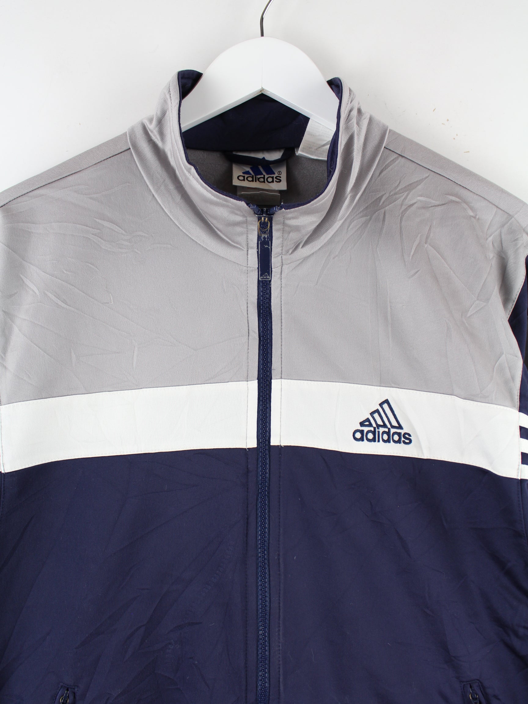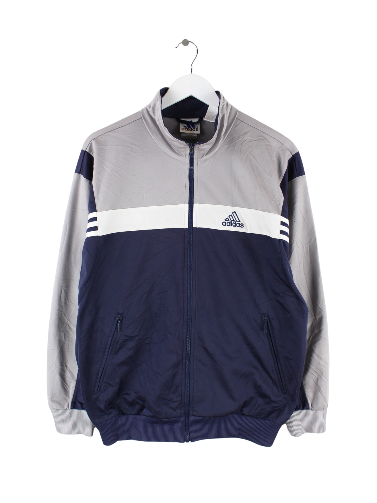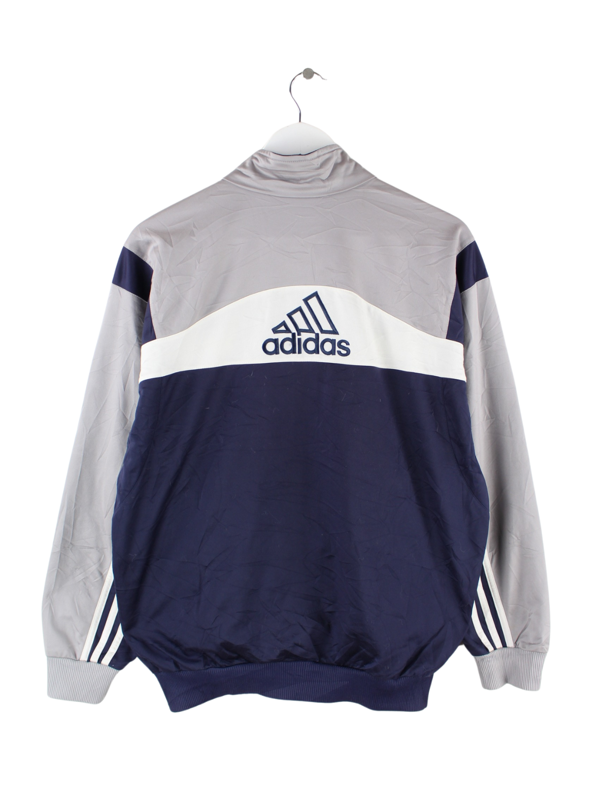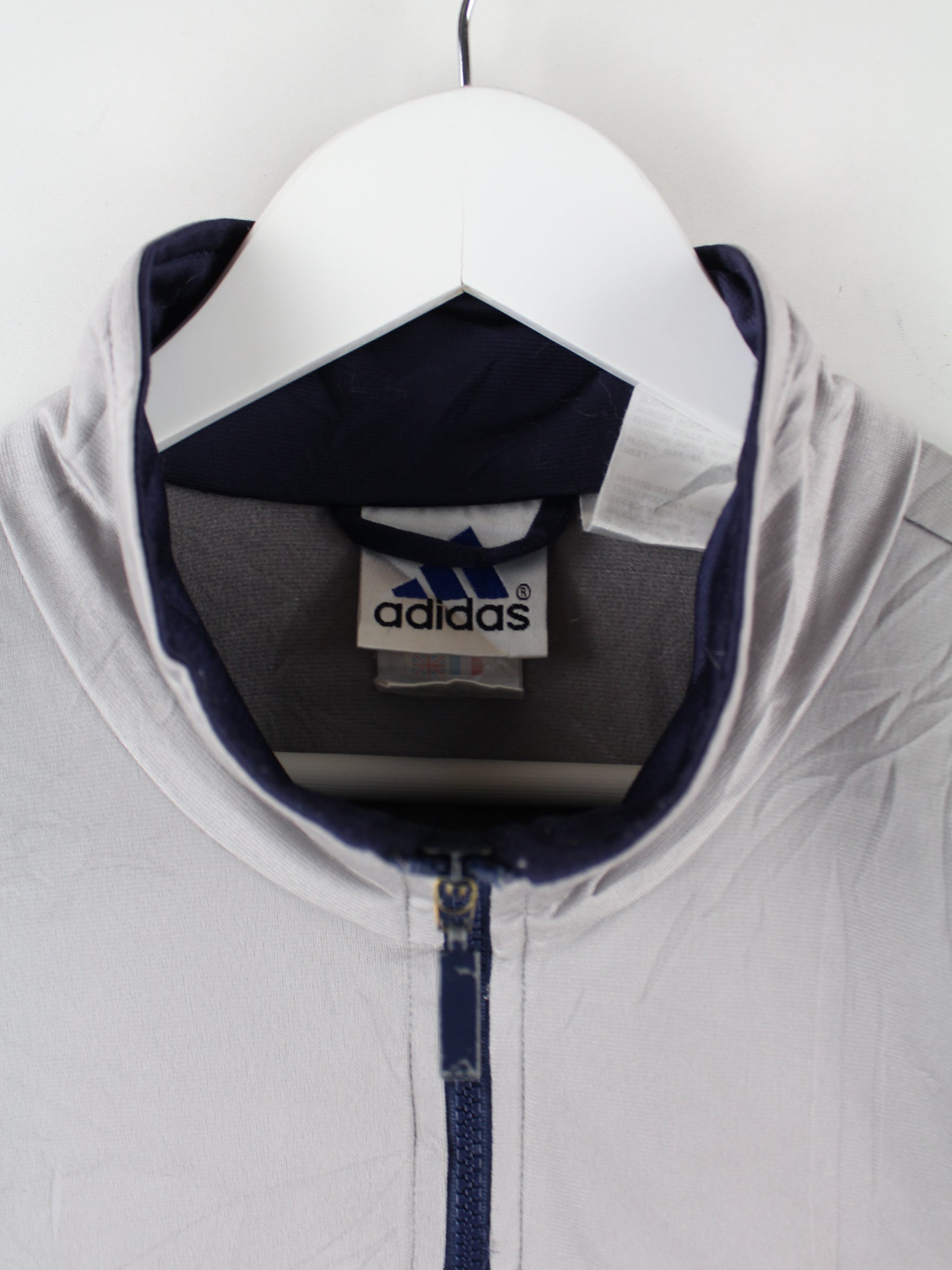 Trainingsjacke vom Label Adidas in Größe M aus den 90'ern. Sie ist aus Synthetik gemacht und in Grau im Bestand.