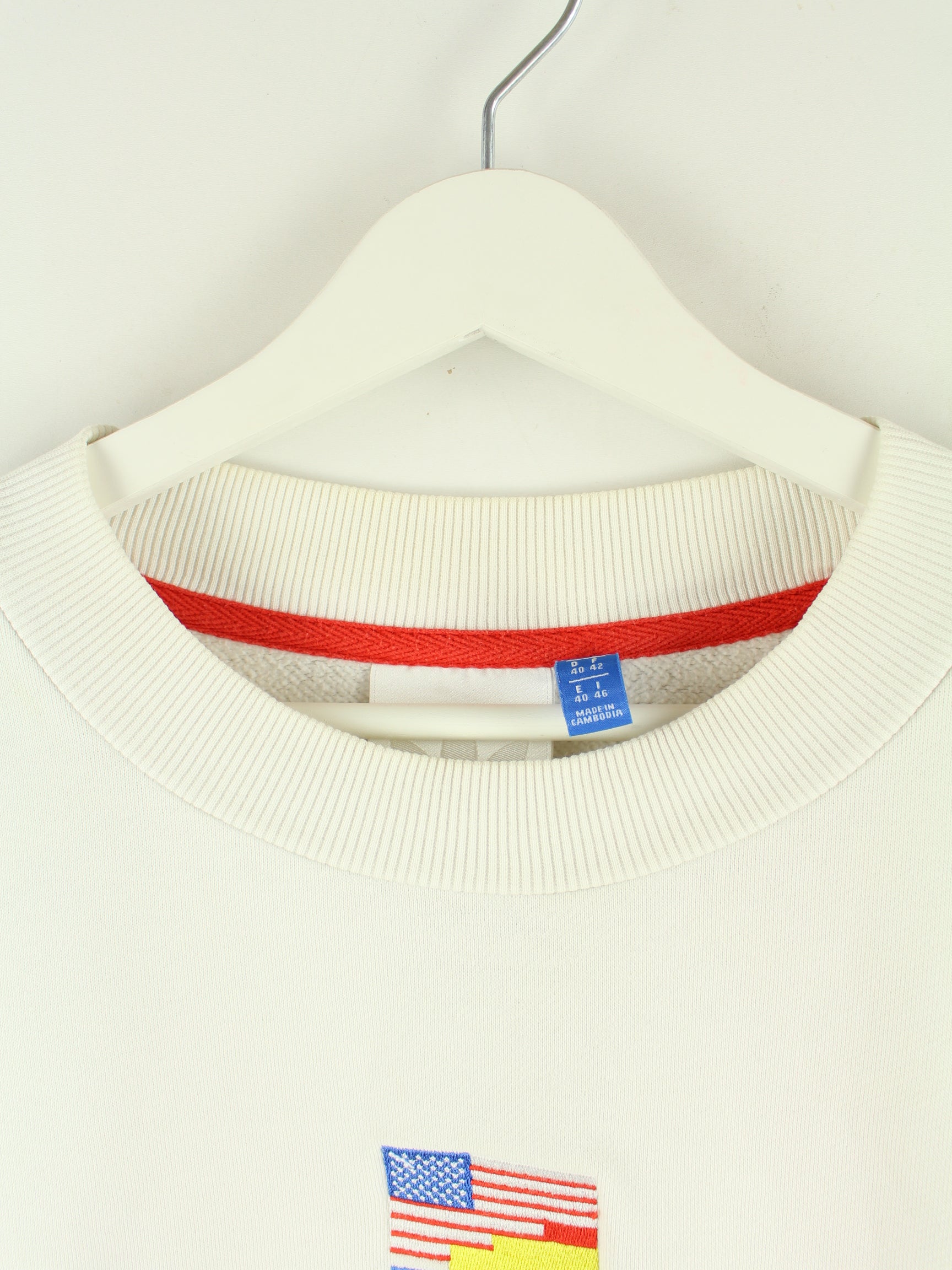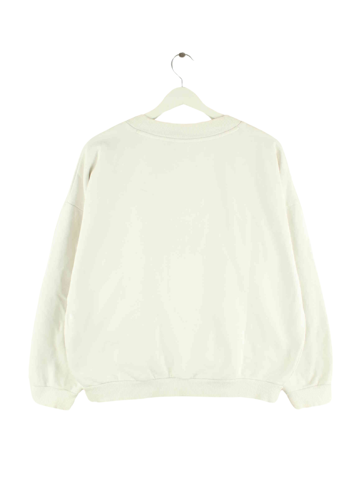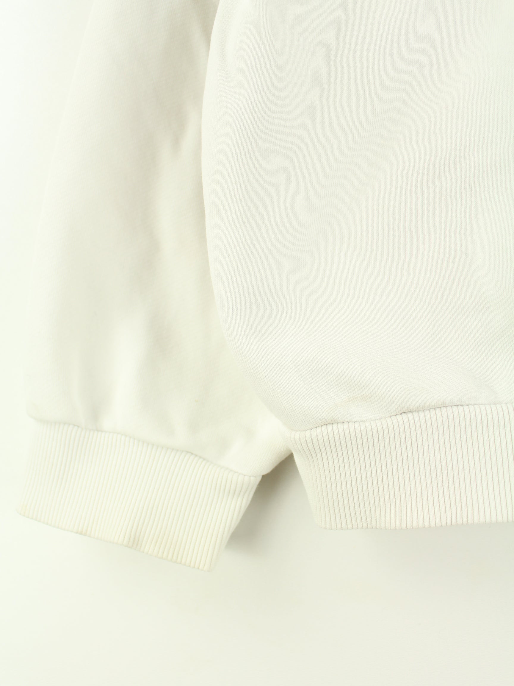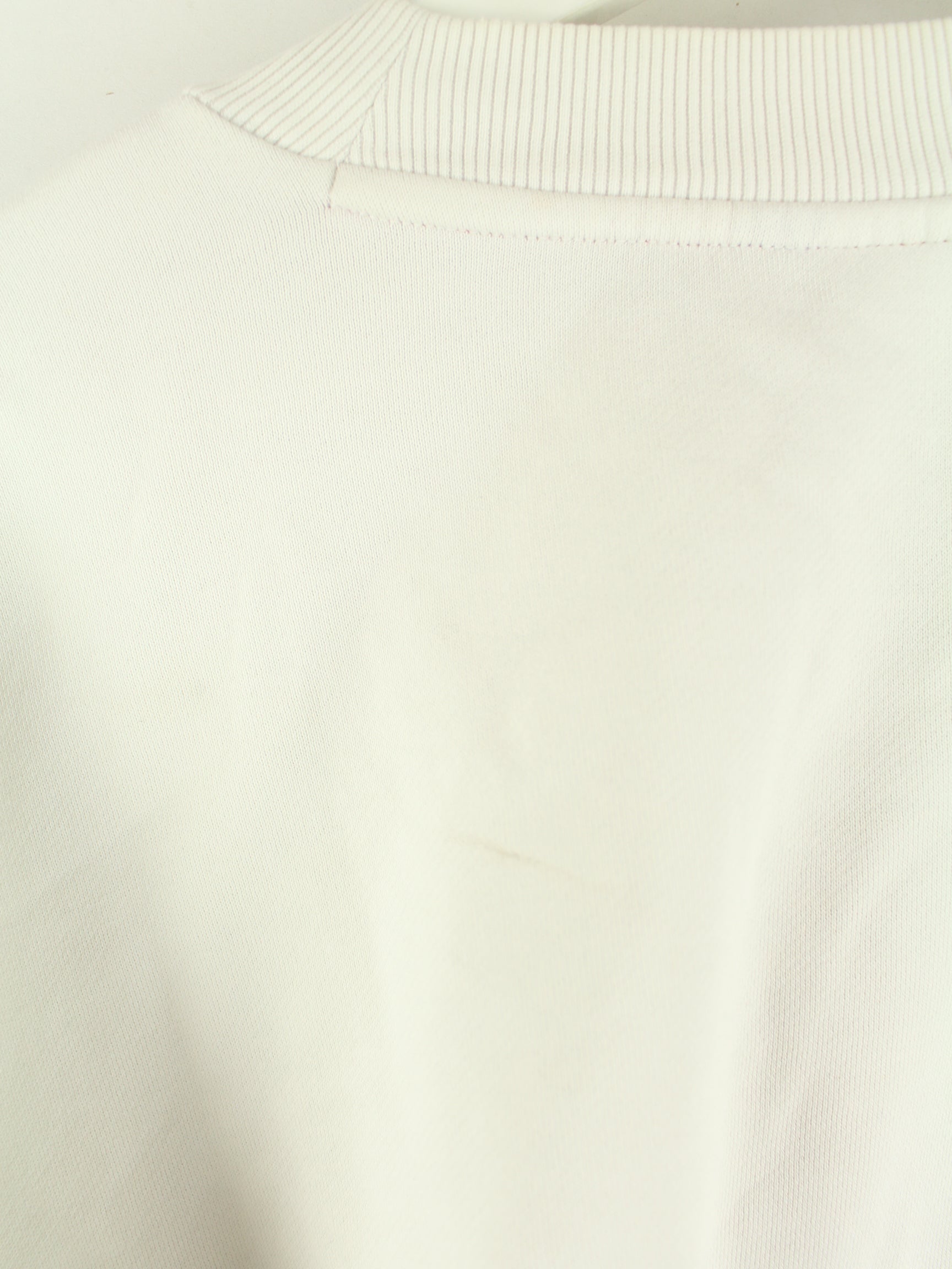 Weißer Sweater mit gestickten Motiven vom Label Adidas in Größe M. Er ist aus einer Baumwollmischung gemacht und in gutem Zustand zu haben.