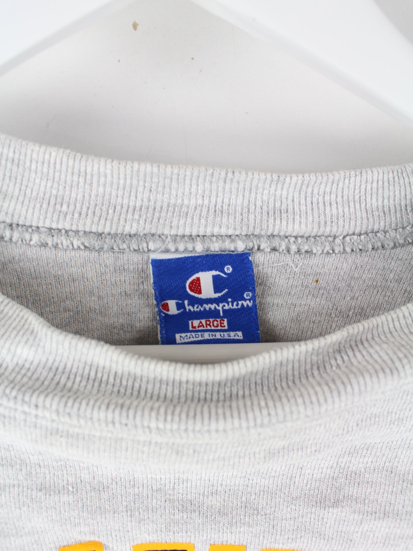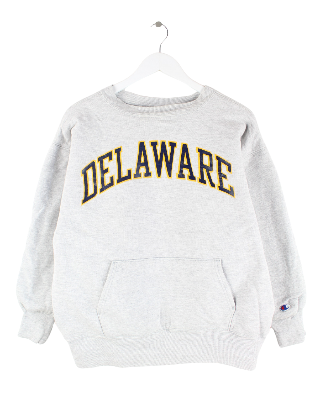 Sweater der Marke Champion in Größe XXS. Er ist aus einer Baumwollmischung und in Grau bei uns vorrätig. Mit tollem Delaware Print.