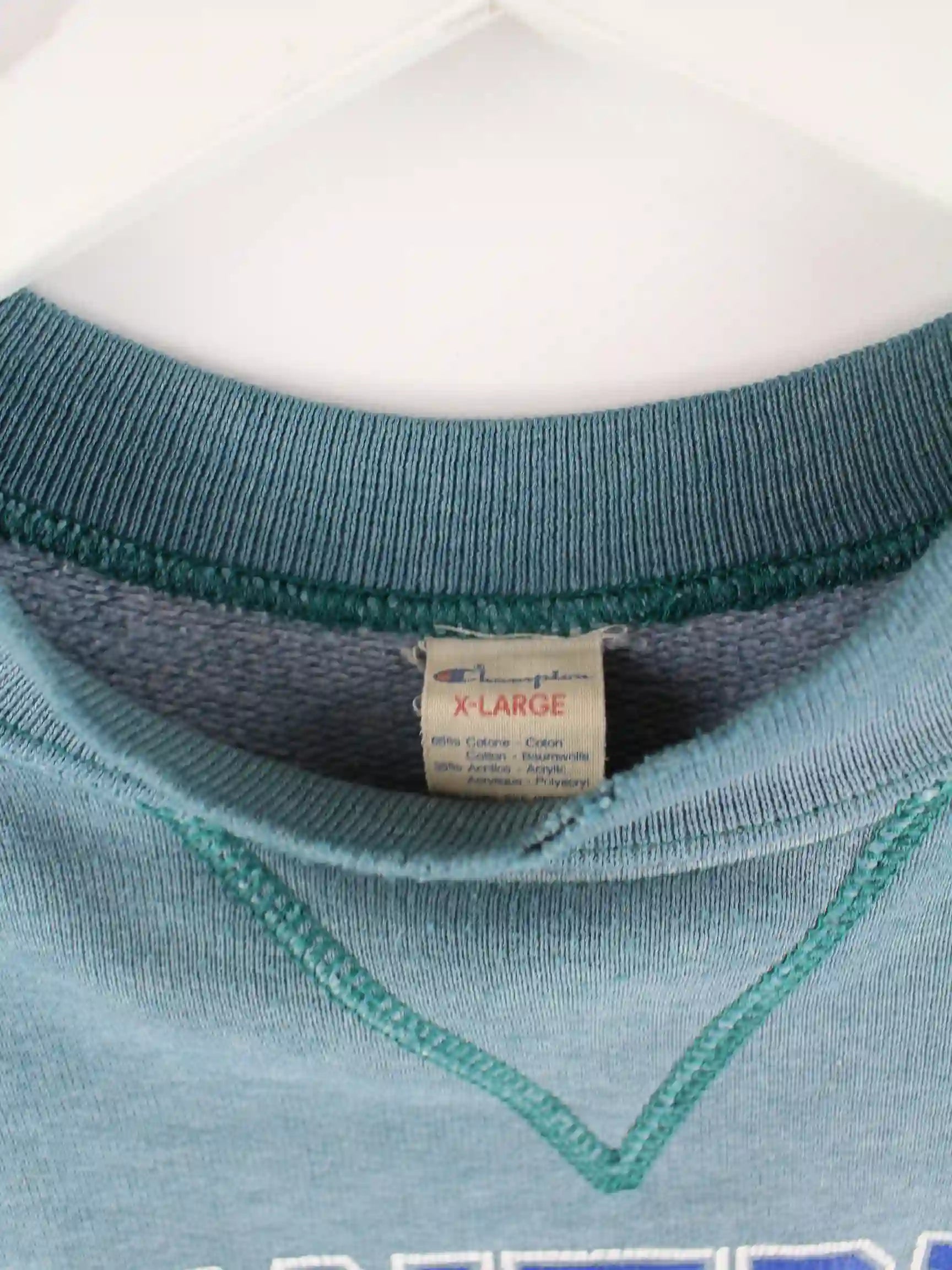 Grüner Sweater vom Label Champion aus den 90'ern in Größe XL. Er ist aus einer Baumwollmischung gefertigt. Den Zustand würden wir als 'In Ordnung' bezeichnen (vergl. Bilder).