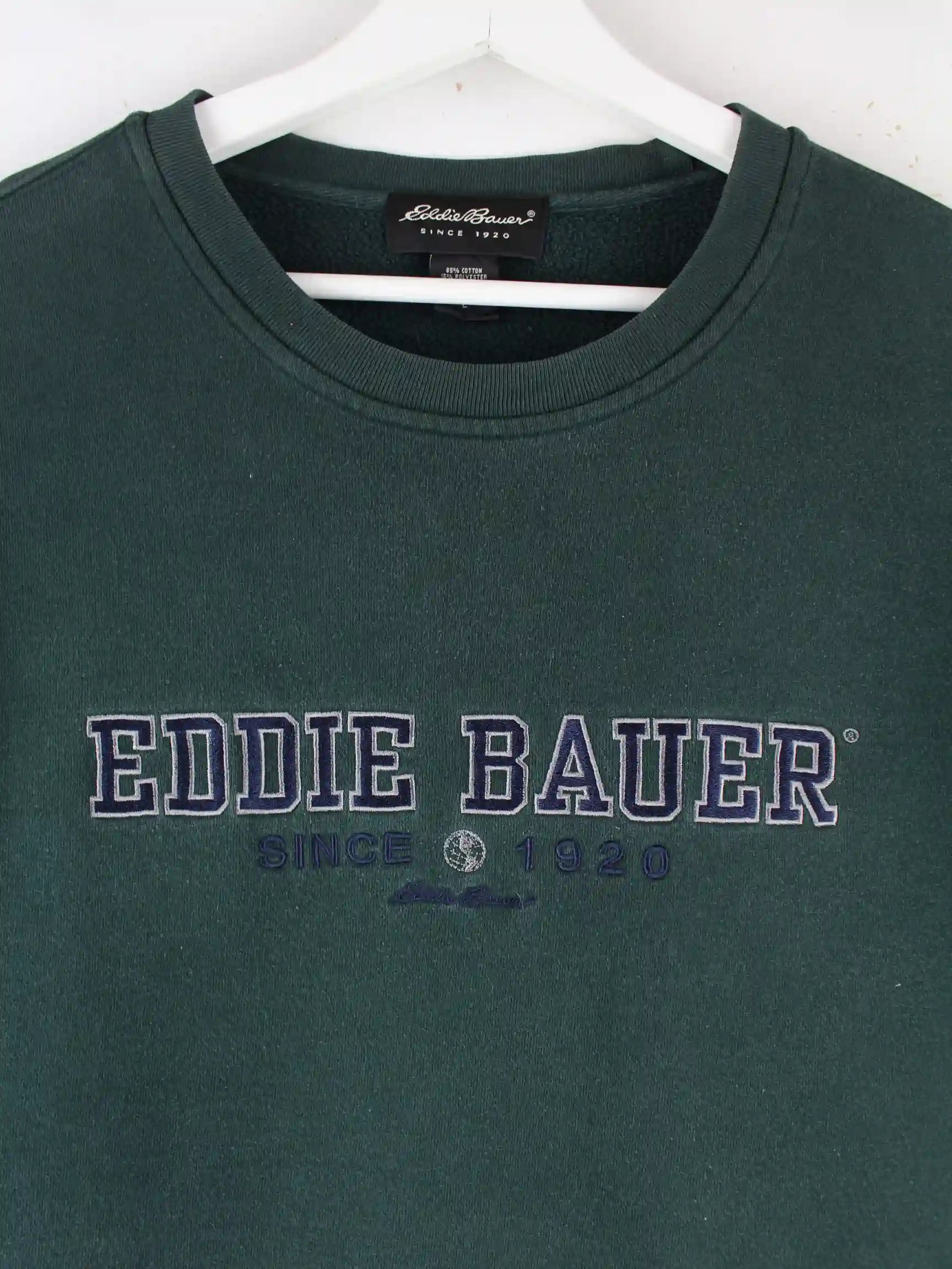 Grüner Sweater mit gesticktem Logo aus dem Hause Eddie Bauer in Größe L. Er ist aus Baumwolle gefertigt und in sehr gutem Zustand bei uns vorrätig.