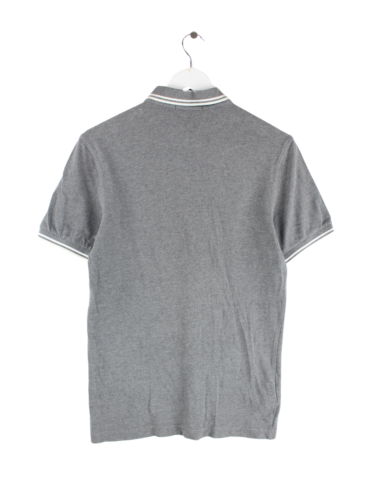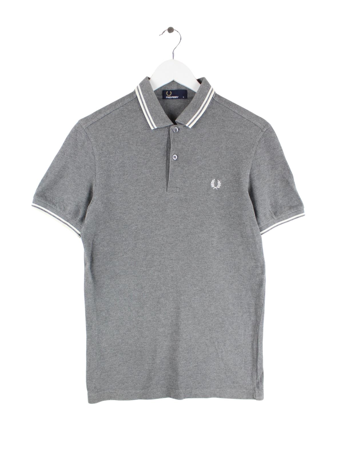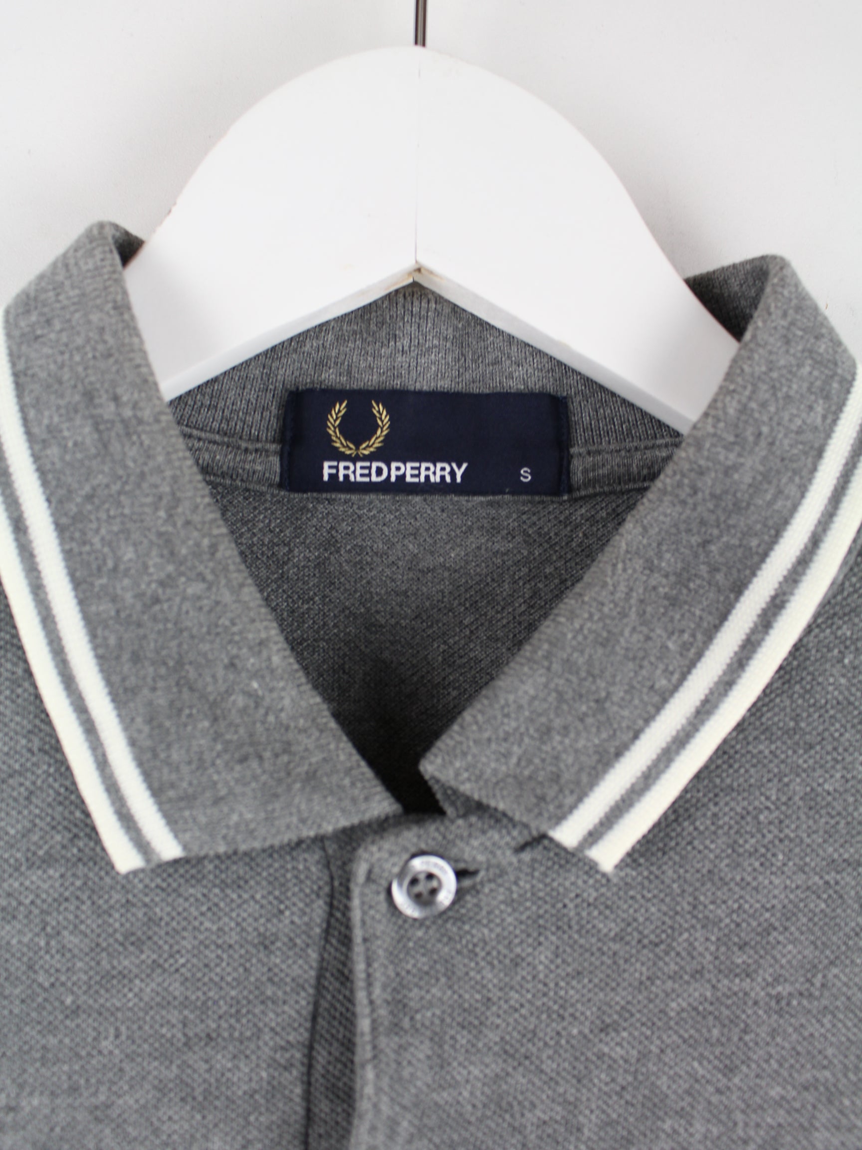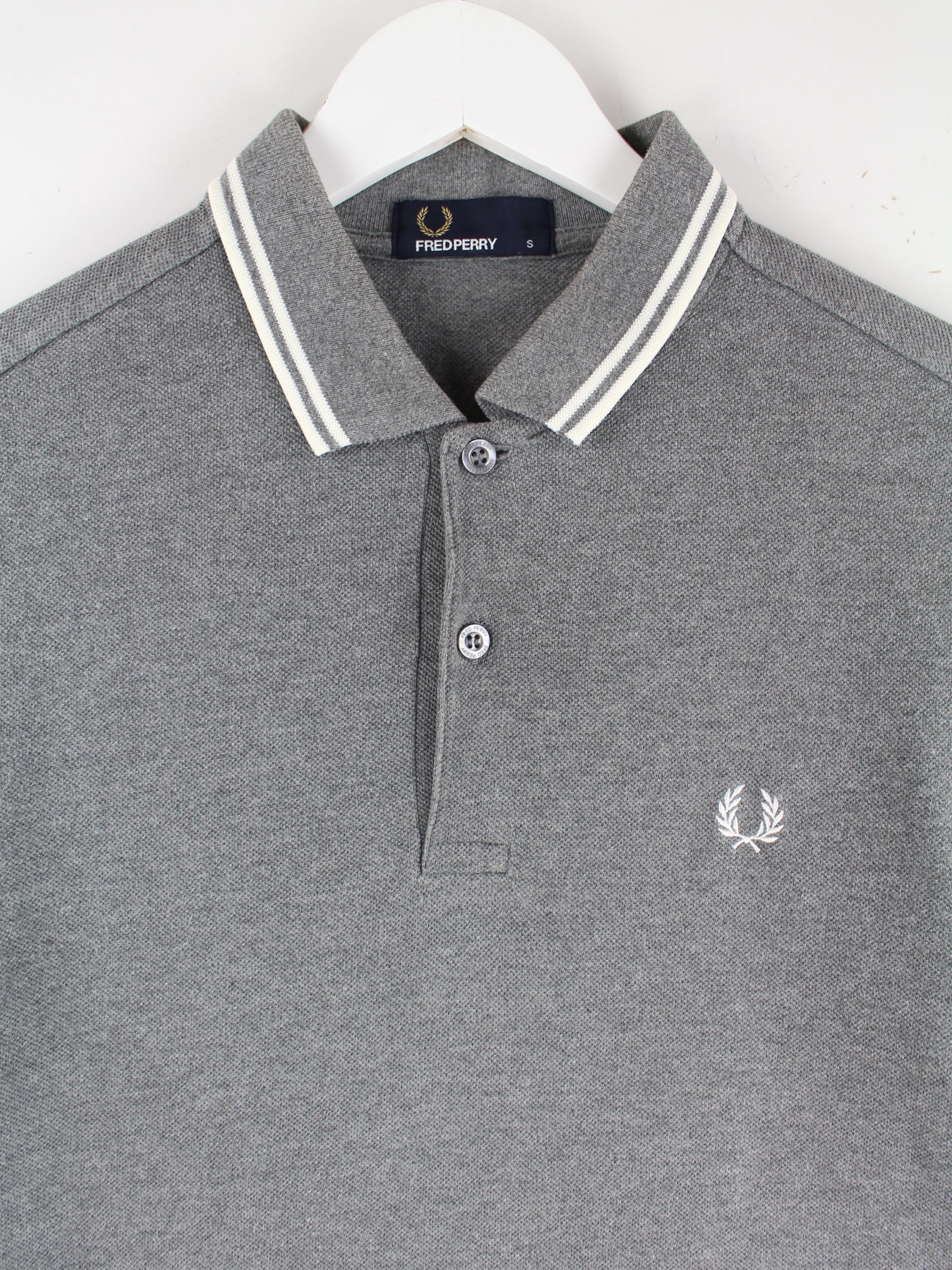 Graues Poloshirt vom Brand Fred Perry in Größe S. Es ist aus Baumwolle angefertigt und in sehr gutem Zustand im Bestand.