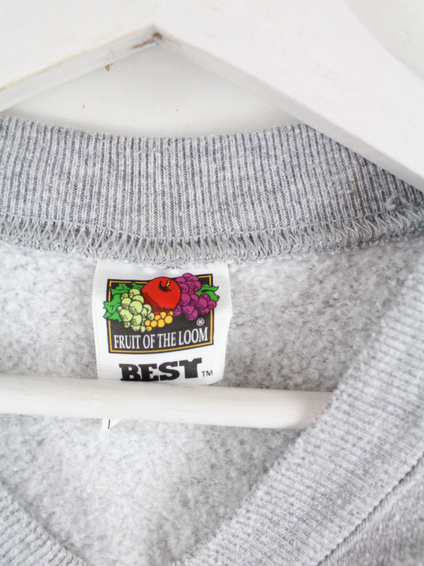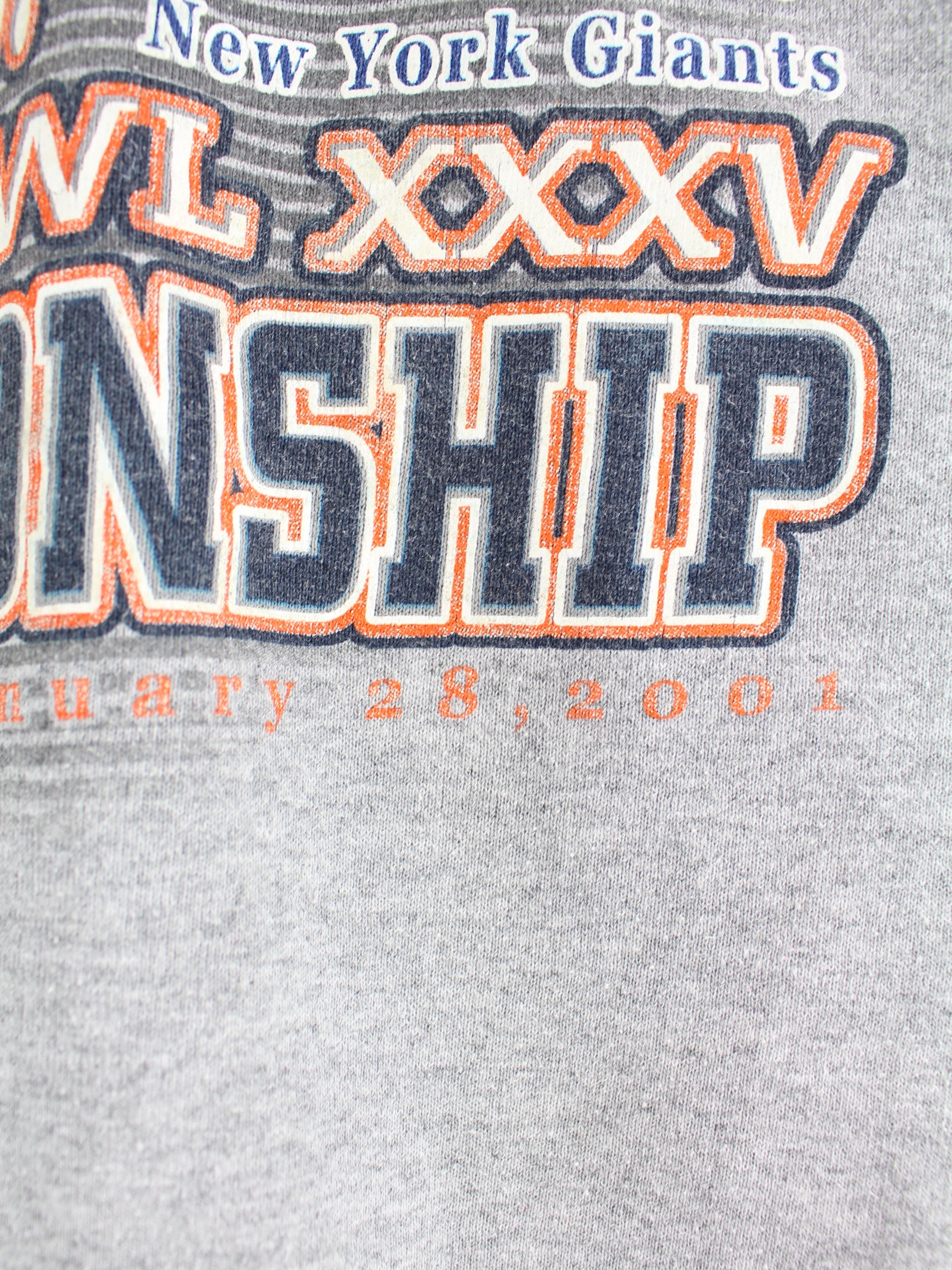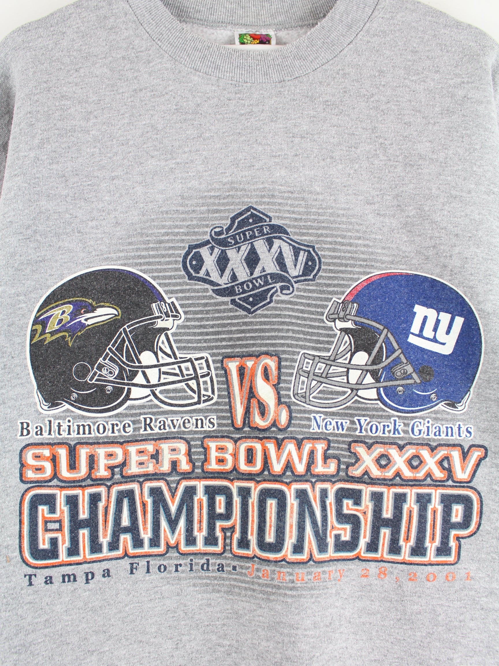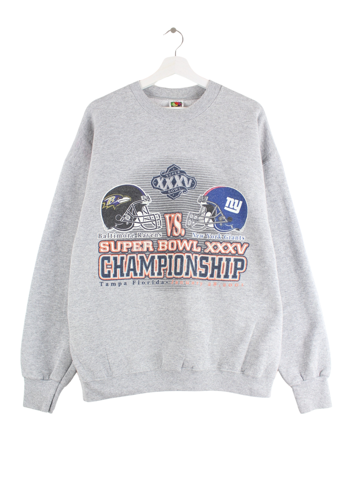 Grauer Sweater des Labels Fruit of the Loom in Größe XL. Er ist aus einer Baumwollmischung angefertigt und in sehr gutem Zustand im Bestand. Mit seltenem Super Bowl Ravens vs. Giants Print aus dem Jahr 2001.