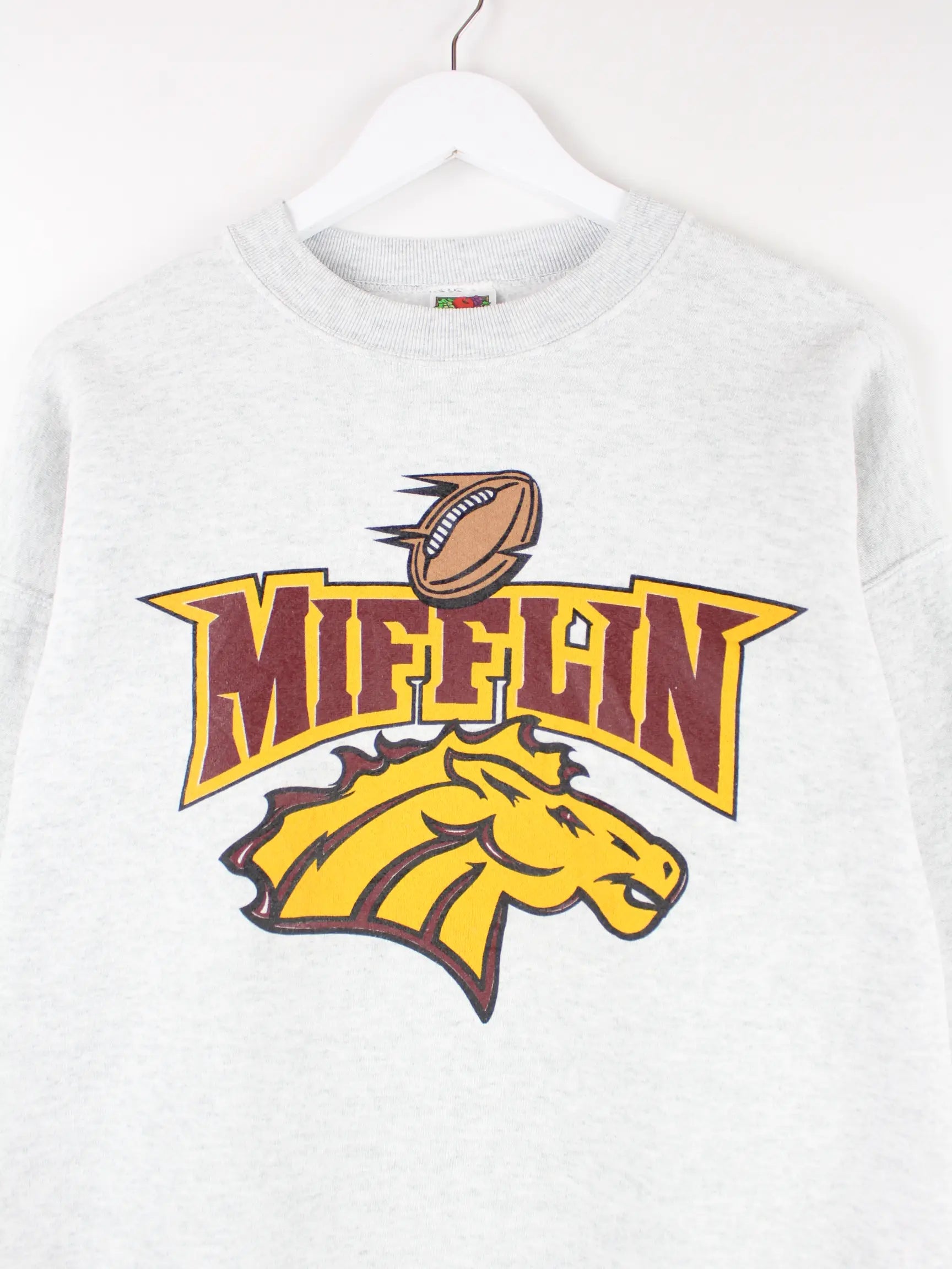 Sweater der Marke Fruit of the Loom in Größe L aus den 90'ern. Er ist aus einer Baumwollmischung gemacht und in Grau bei uns zu bekommen. Mit schönem Mifflin Print.