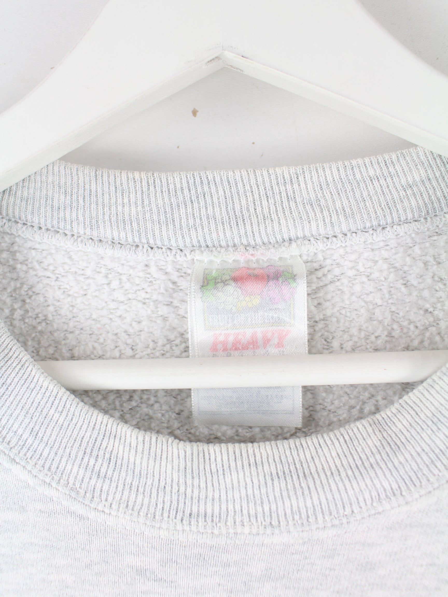 Sweater vom Label Fruit of the Loom in Größe XL aus den 90'ern. Er ist aus einer Baumwollmischung gefertigt und in Grau im Angebot. Mit schönem Rebels Print.