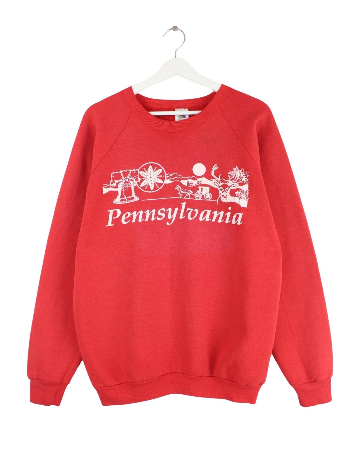 Sweater vom Brand Fruit of the Loom in Größe L aus den 90'ern. Er ist aus einer Baumwollmischung gemacht und in Rot im Angebot. Mit schönem Pennsylvania Print.