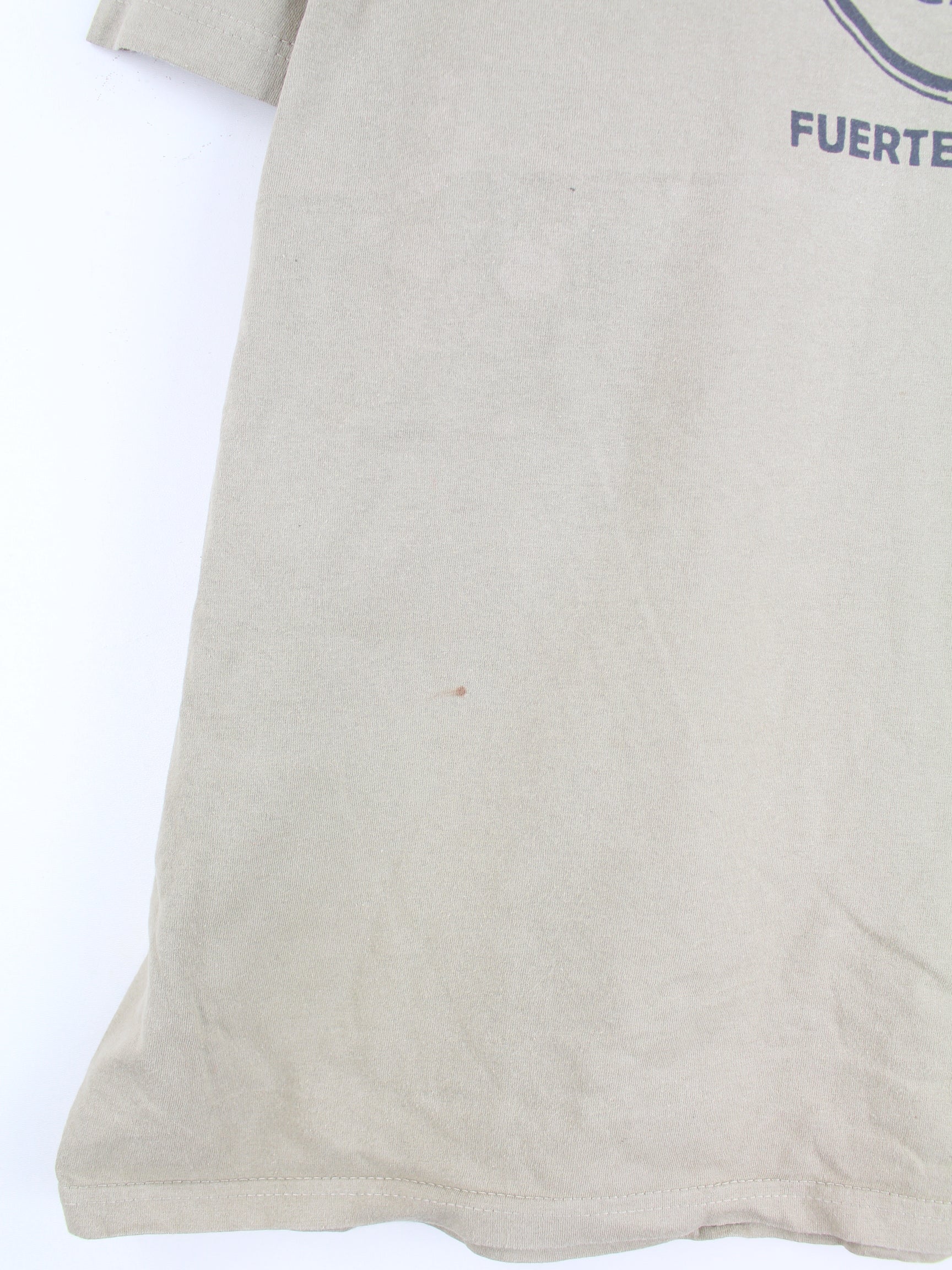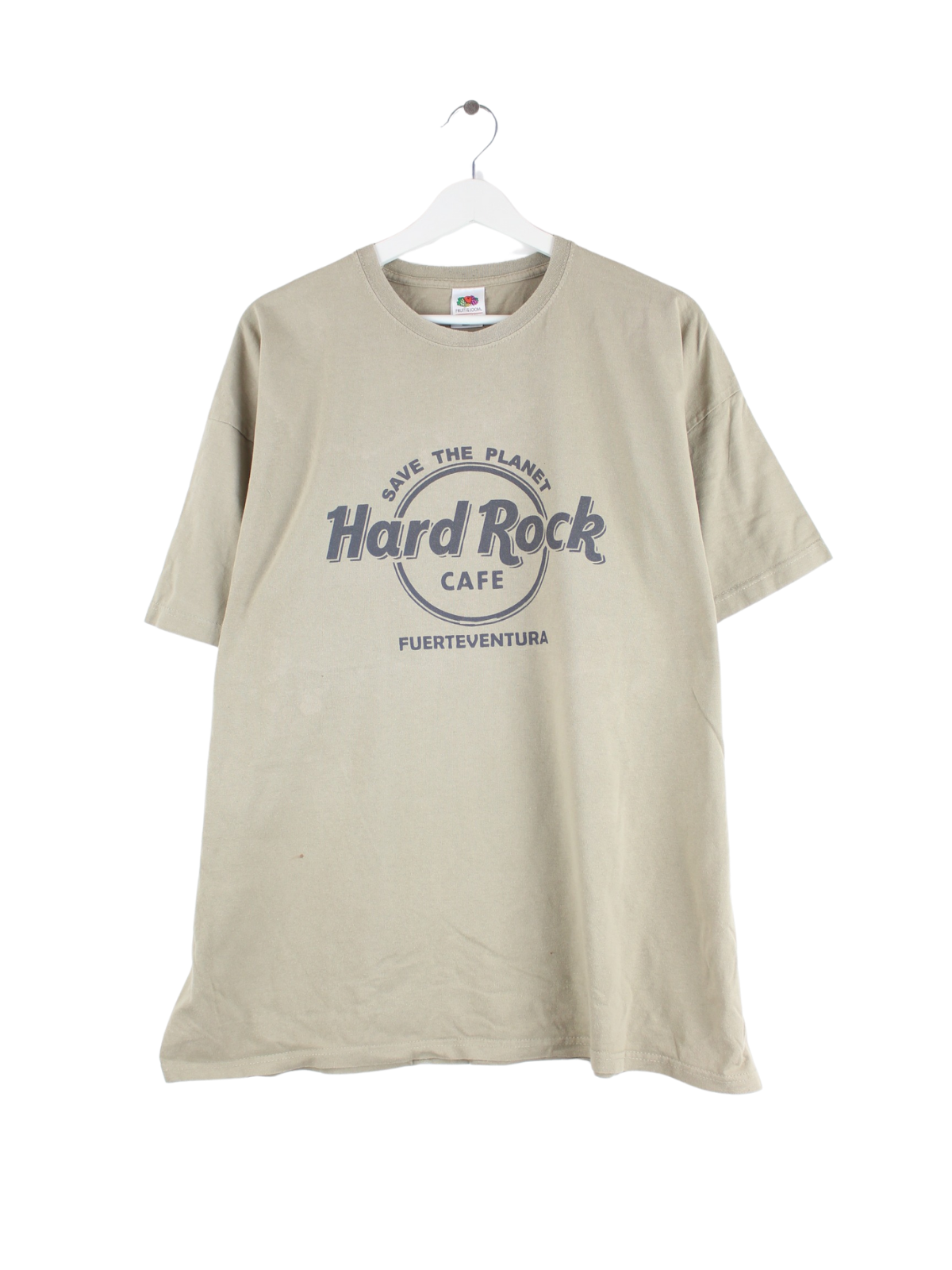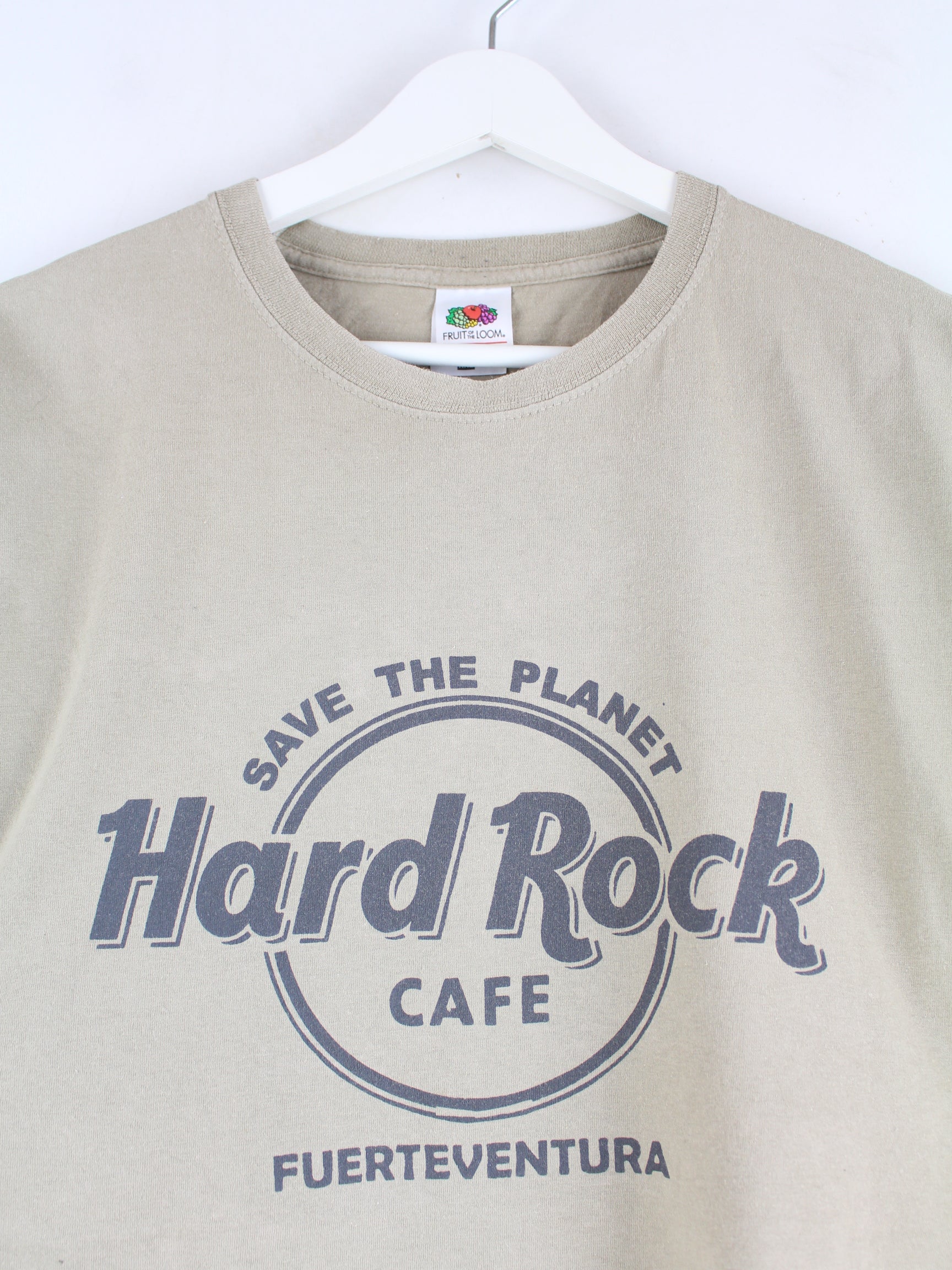 Beigefarbenes T-Shirt der Brand Fruit of the Loom in Größe XXL. Es ist aus Baumwolle produziert und in gutem Zustand zu bekommen. Mit chiquem Fuerteventura Print.