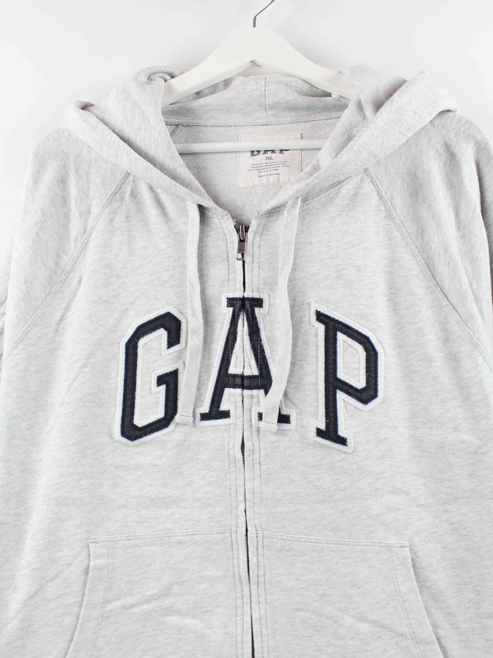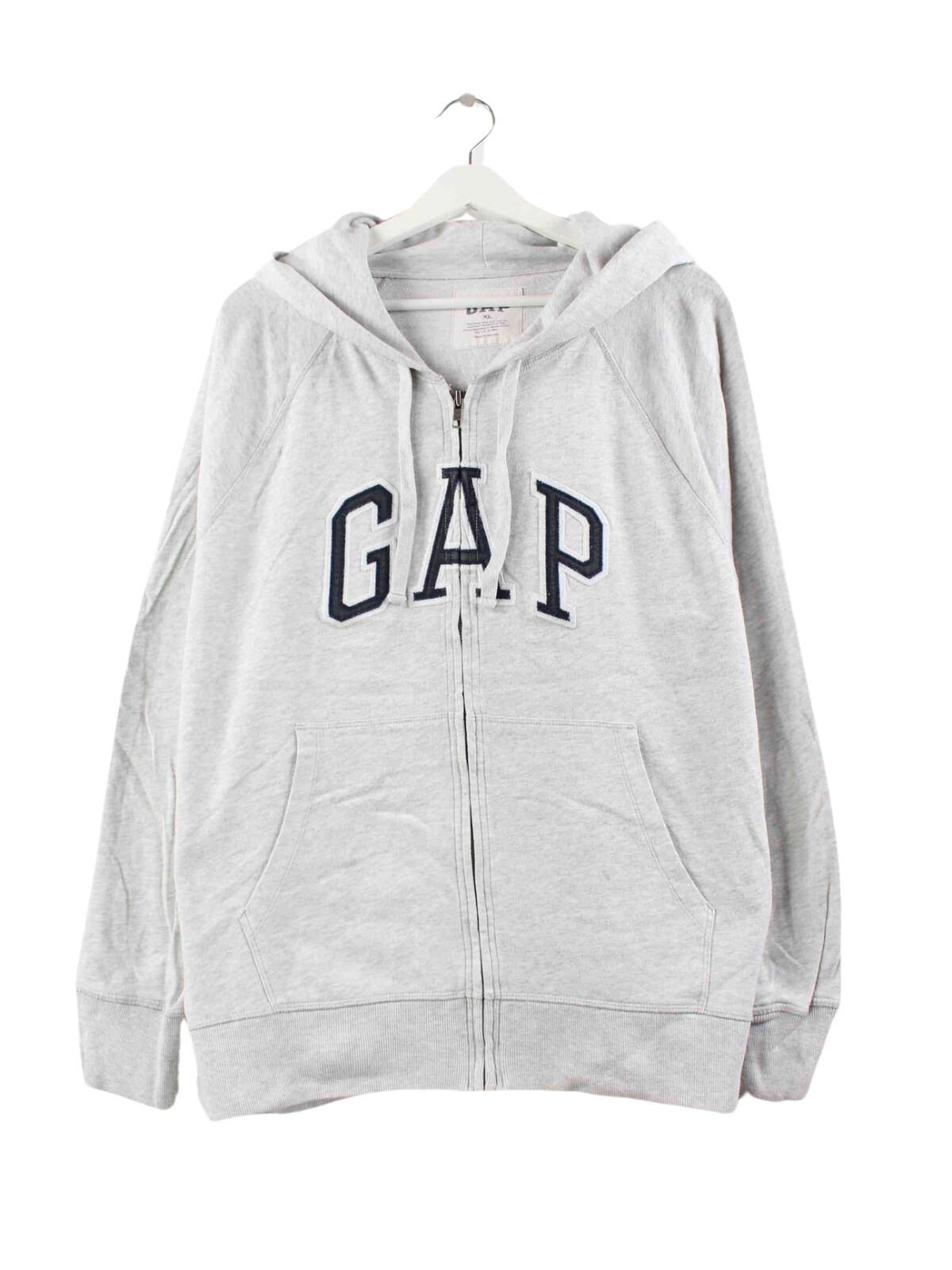 Grauer Hoodie mit aufgesticktem Logo und Reißverschluß der Marke GAP in Größe L. Er ist aus einer Baumwollmischung und in gutem Zustand lieferbar.