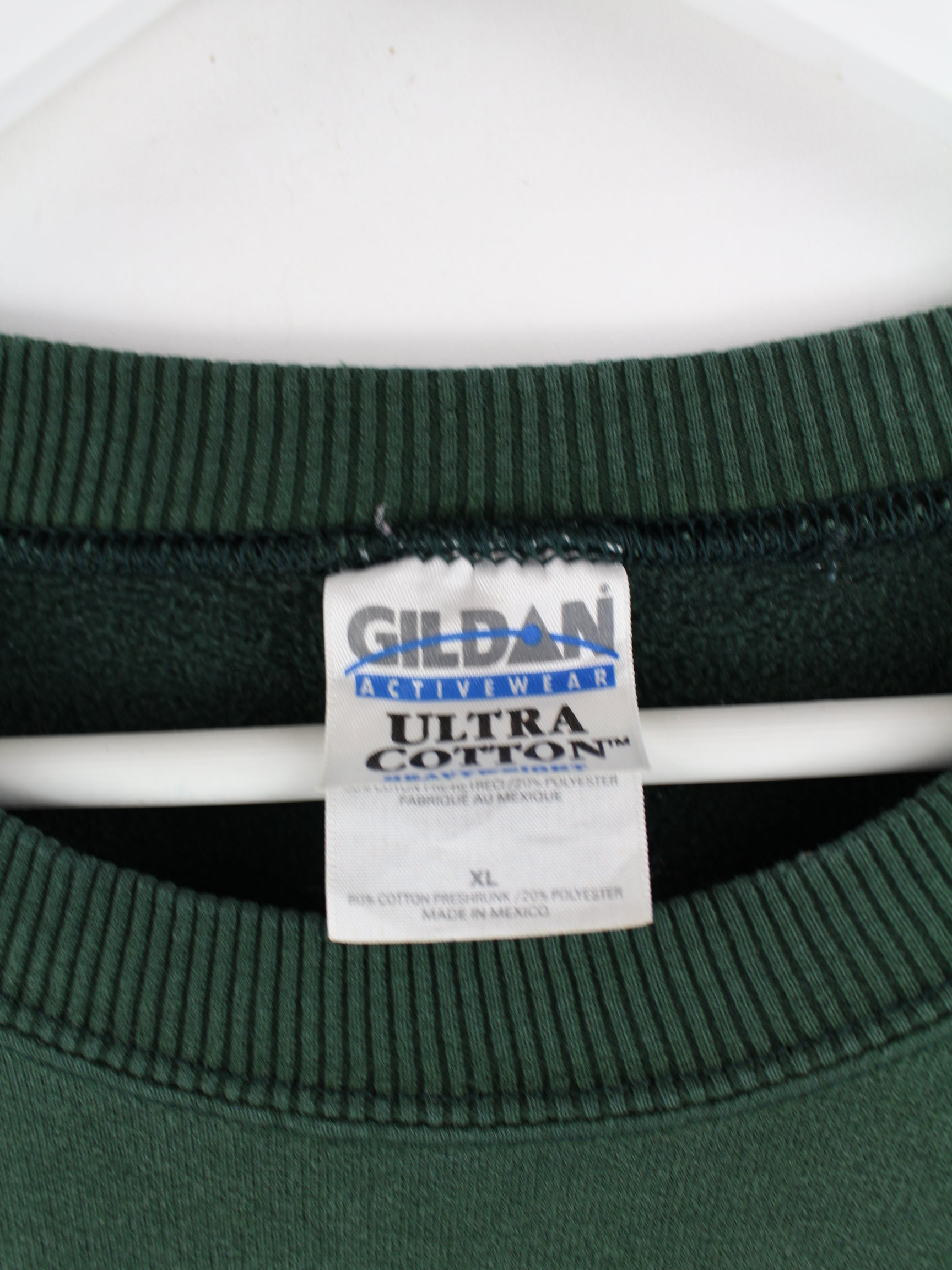 Grüner Sweater mit Stick der Marke Gildan aus den 90'ern in Größe XL. Er ist aus einer Baumwollmischung angefertigt und in gutem Zustand zu haben.