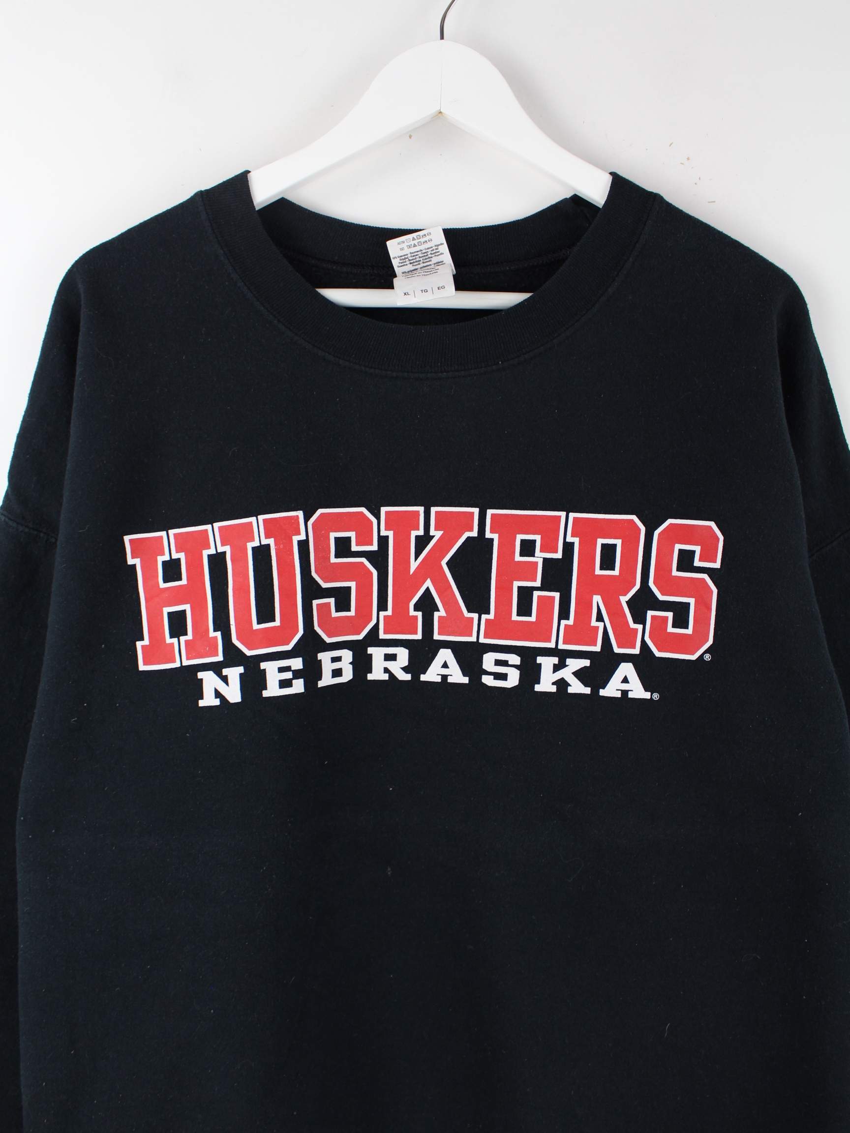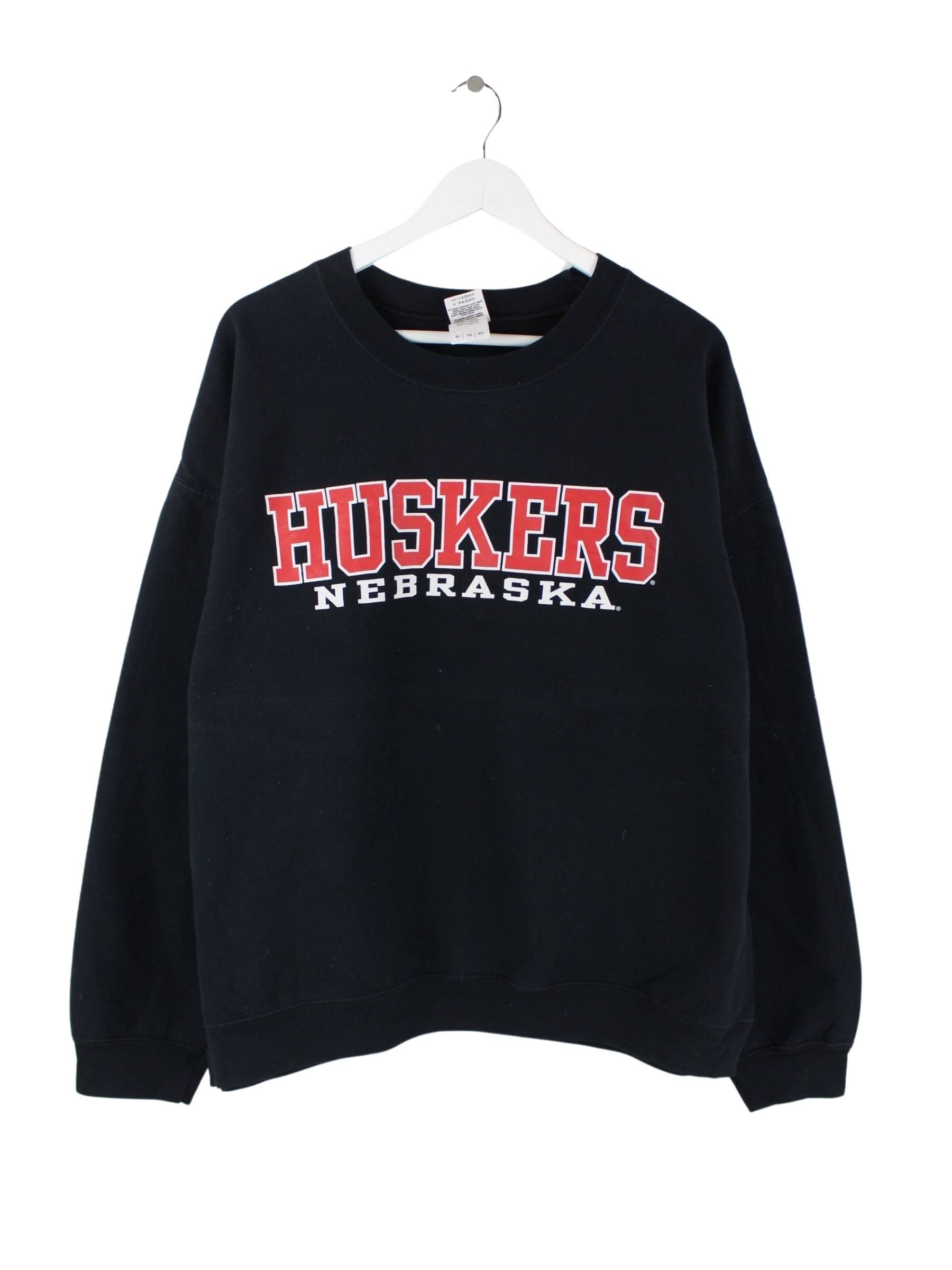 Schwarzer Sweater des Labels Gildan in Größe XL. Er ist aus einer Baumwollmischung angefertigt und in sehr gutem Zustand auf Lager. Mit chiquem Huskers Print.
