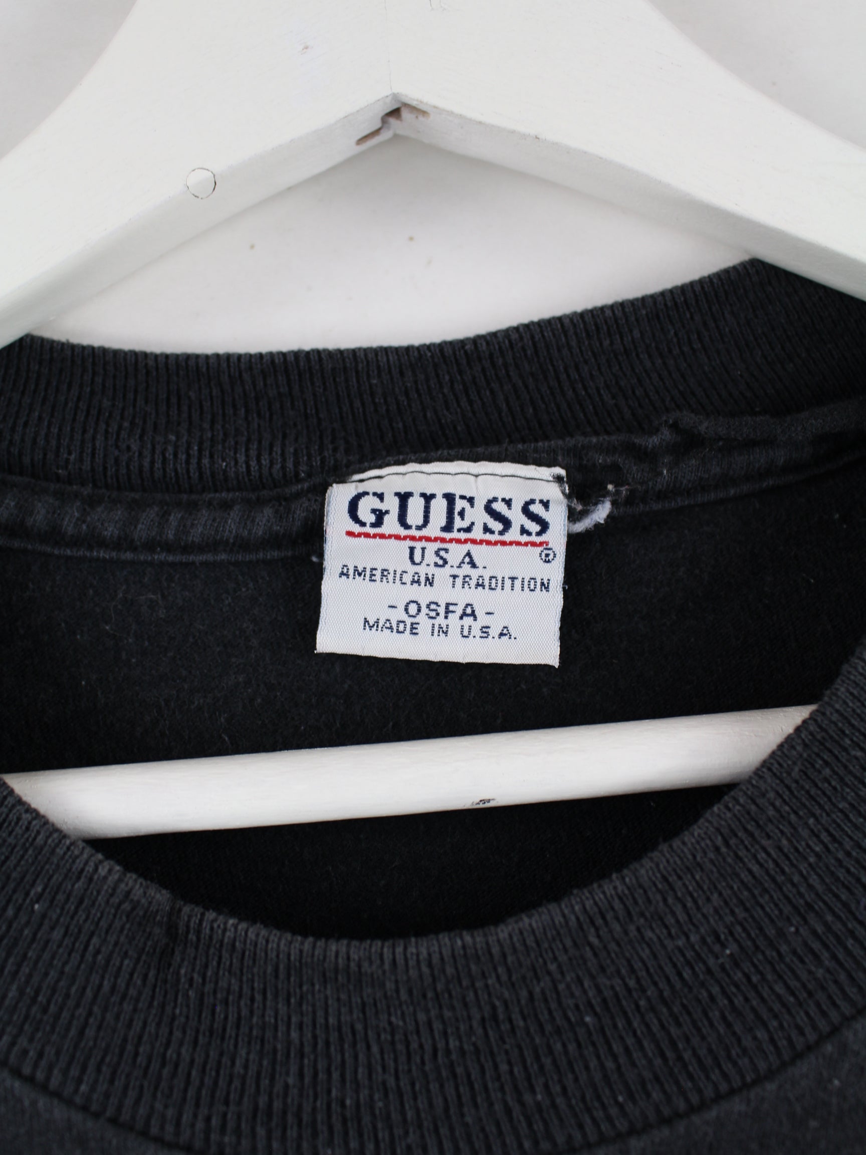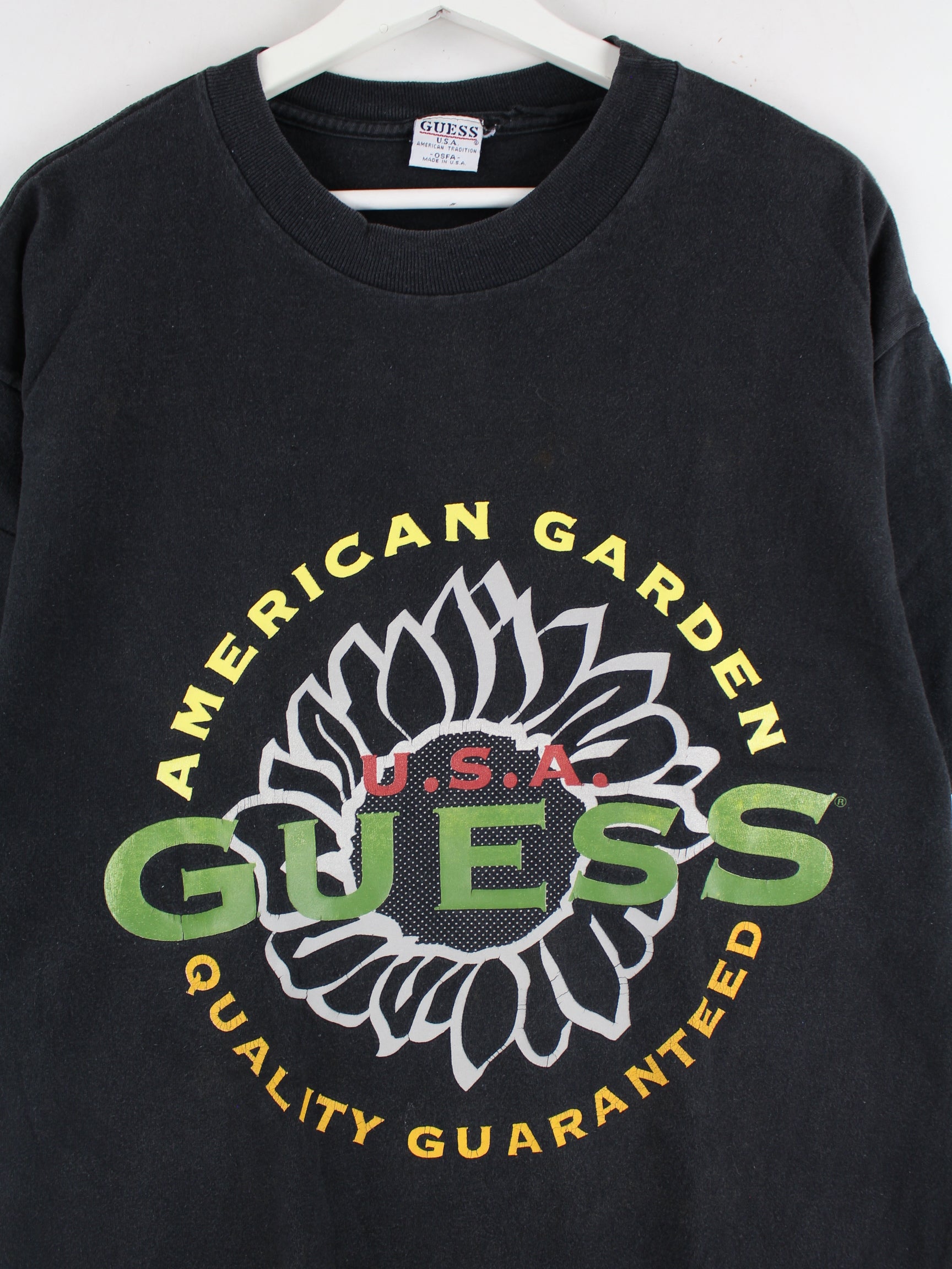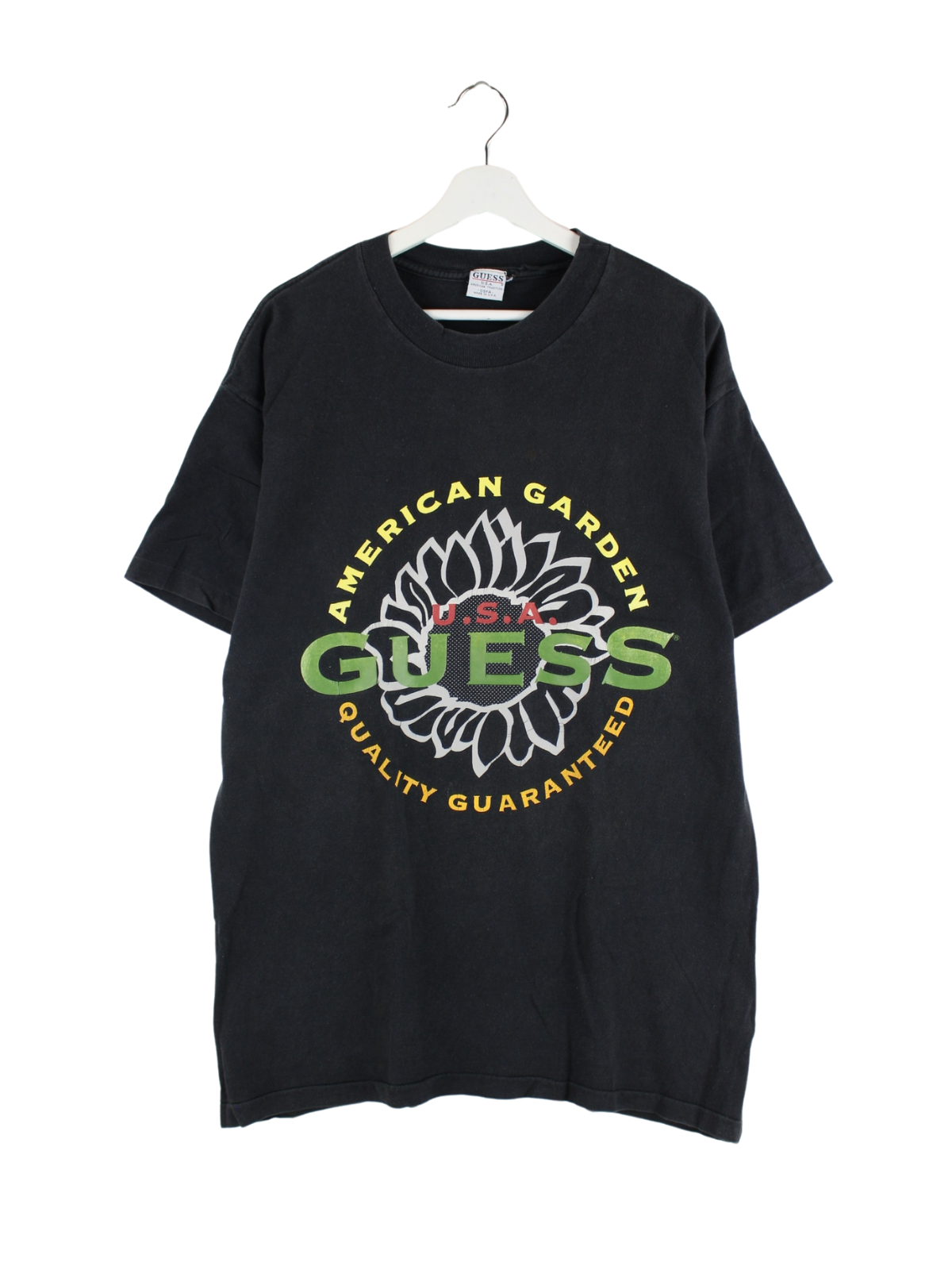 T-Shirt der Marke Guess in Größe XL aus den 90'ern. Es ist aus Baumwolle und in Schwarz vorrätig. Mit schönem Vintage Print.