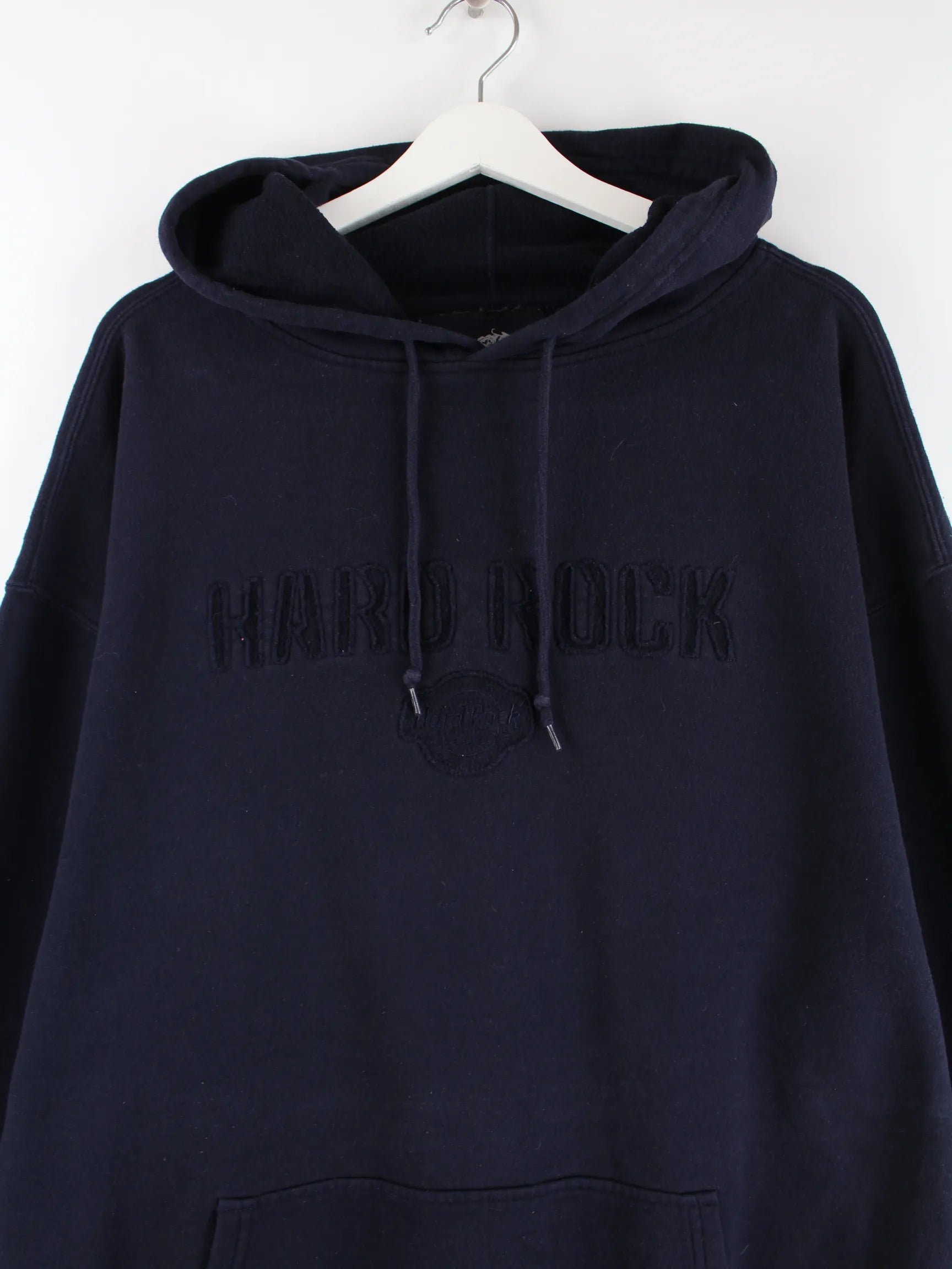 Hoodie der Brand Hard Rock Cafe in Größe 3XL mit großem Logo auf der Brust. Er ist aus einer Baumwollmischung produziert und in Blau auf Lager.