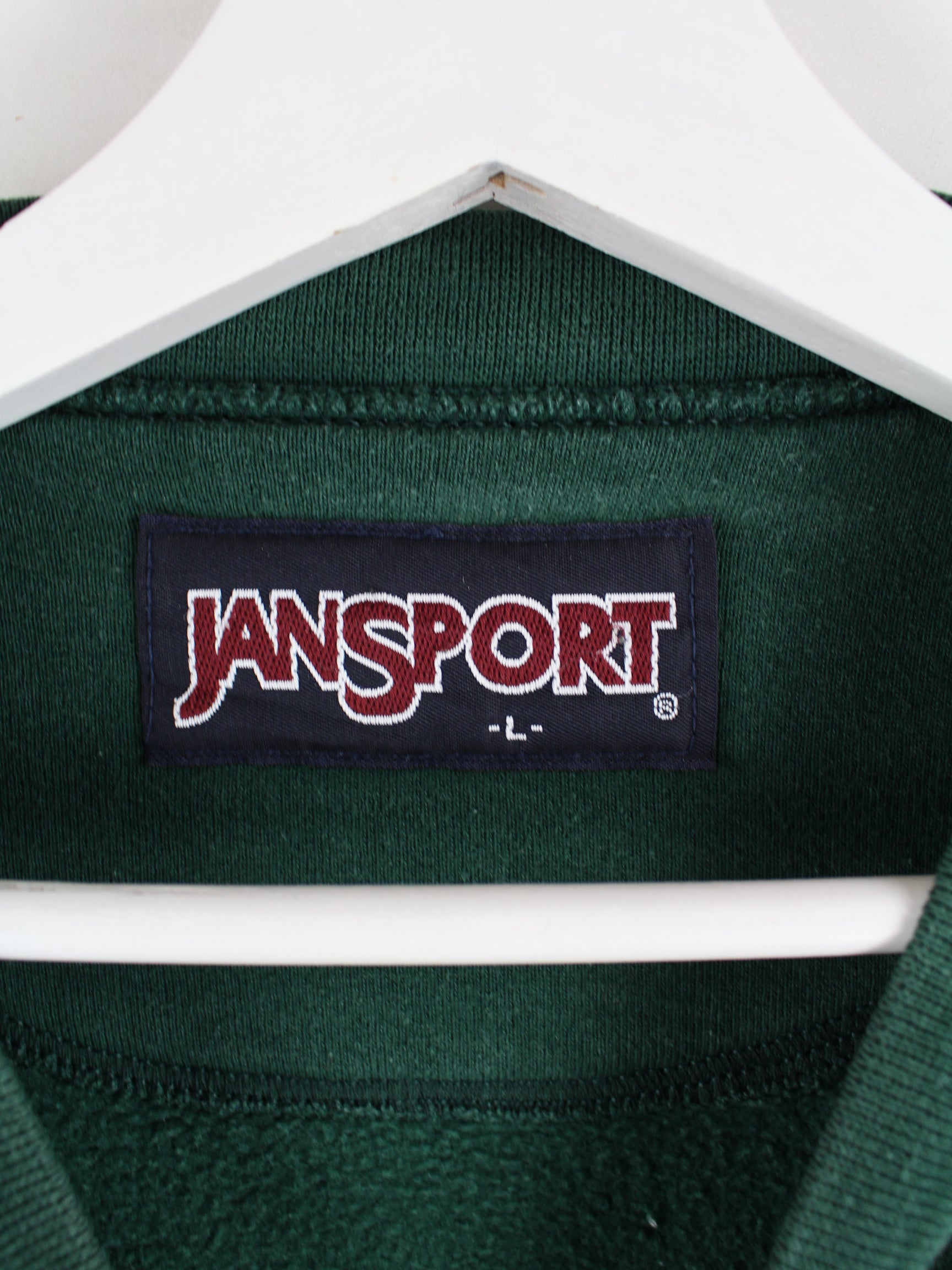 Grüner Sweater mit gestickten Motiven vom Brand Jansport aus den 90'ern in Größe L. Er ist aus einer Baumwollmischung produziert. Den Zustand würden wir als 'In Ordnung' bezeichnen (vergl. Bilder).