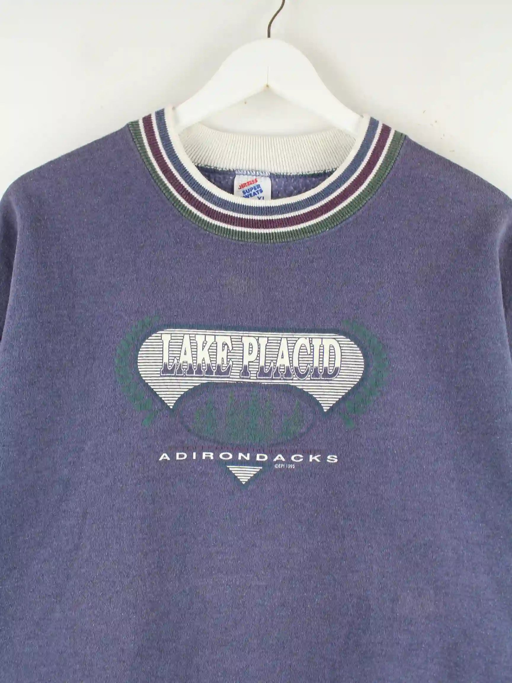 Blauer Sweater des Labels Jerzees in Größe XL. Er ist aus einer Baumwollmischung und in sehr gutem Zustand bei uns zu bekommen. Mit tollem Lake Print.