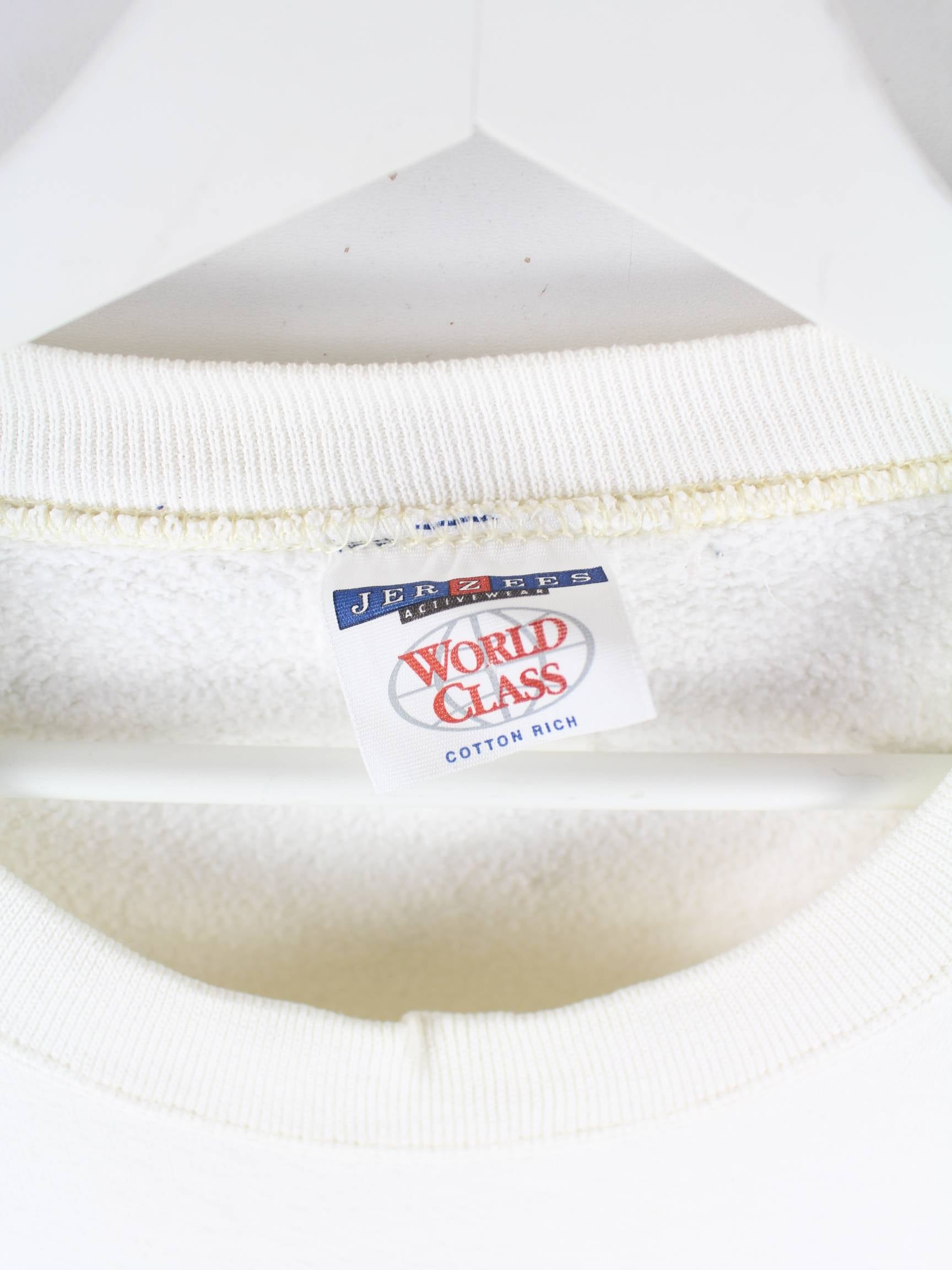 Beigefarbener Sweater mit gesticktem Logo der Brand Jerzees aus den 90'ern in Größe XL. Er ist aus einer Baumwollmischung und in gutem Zustand auf Lager.
