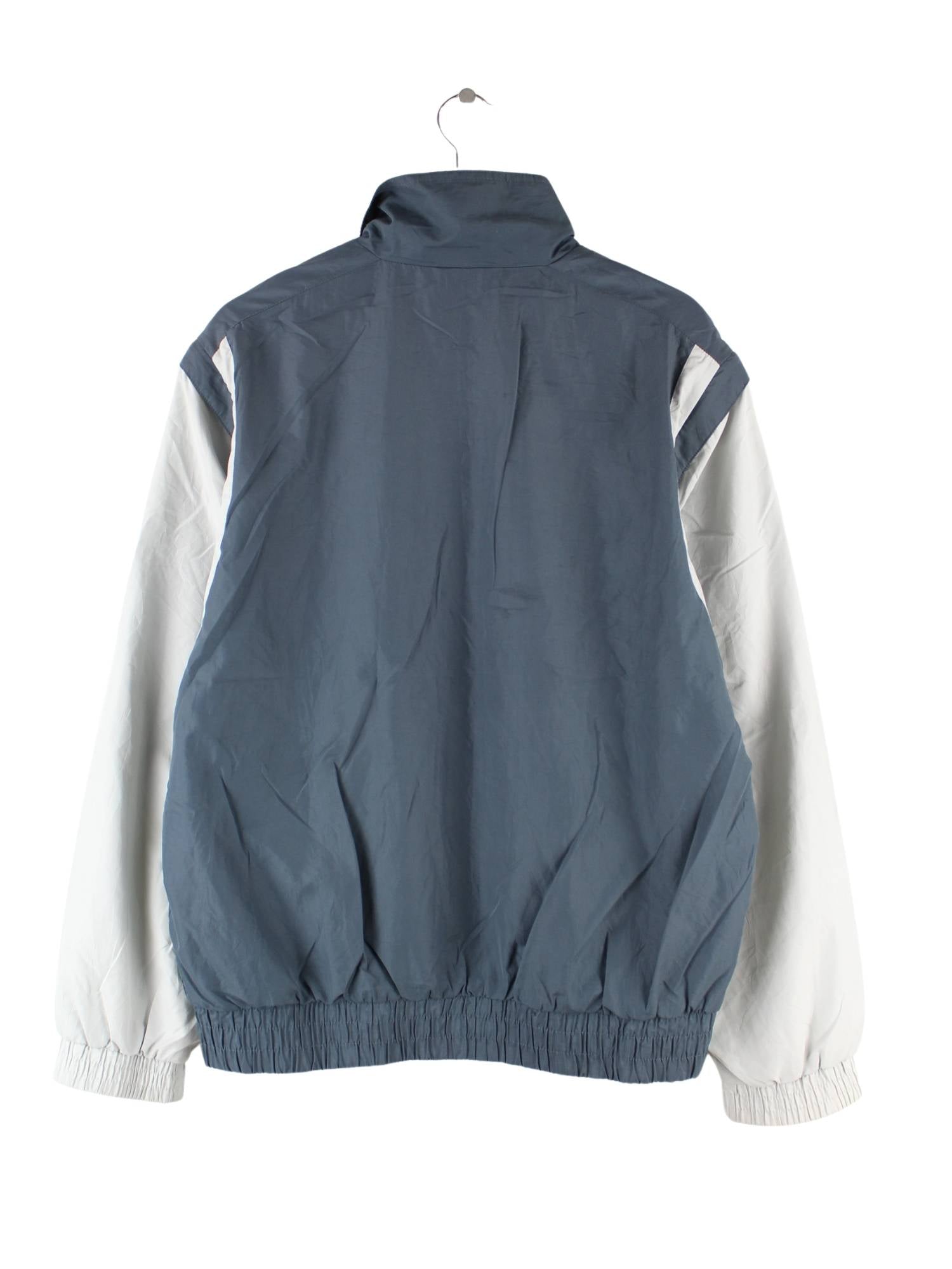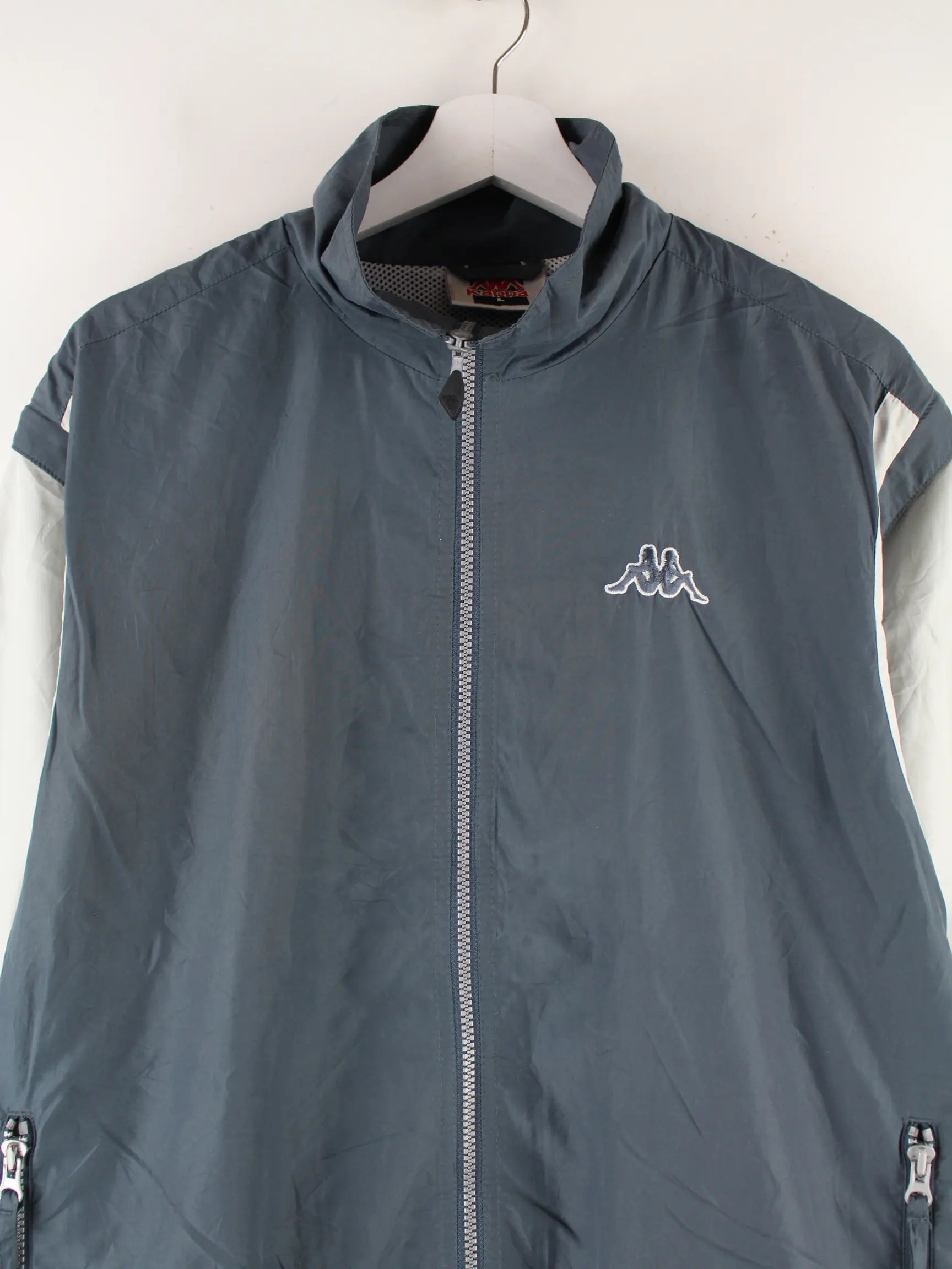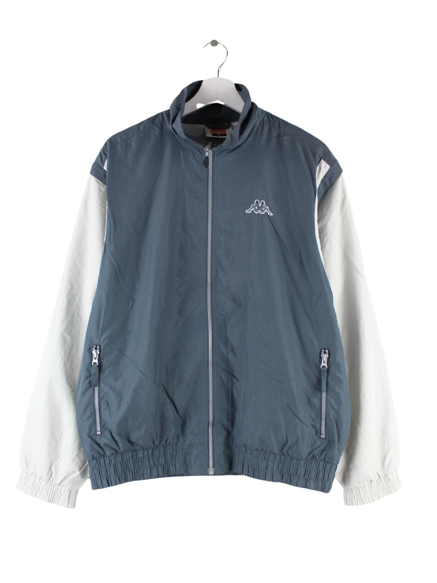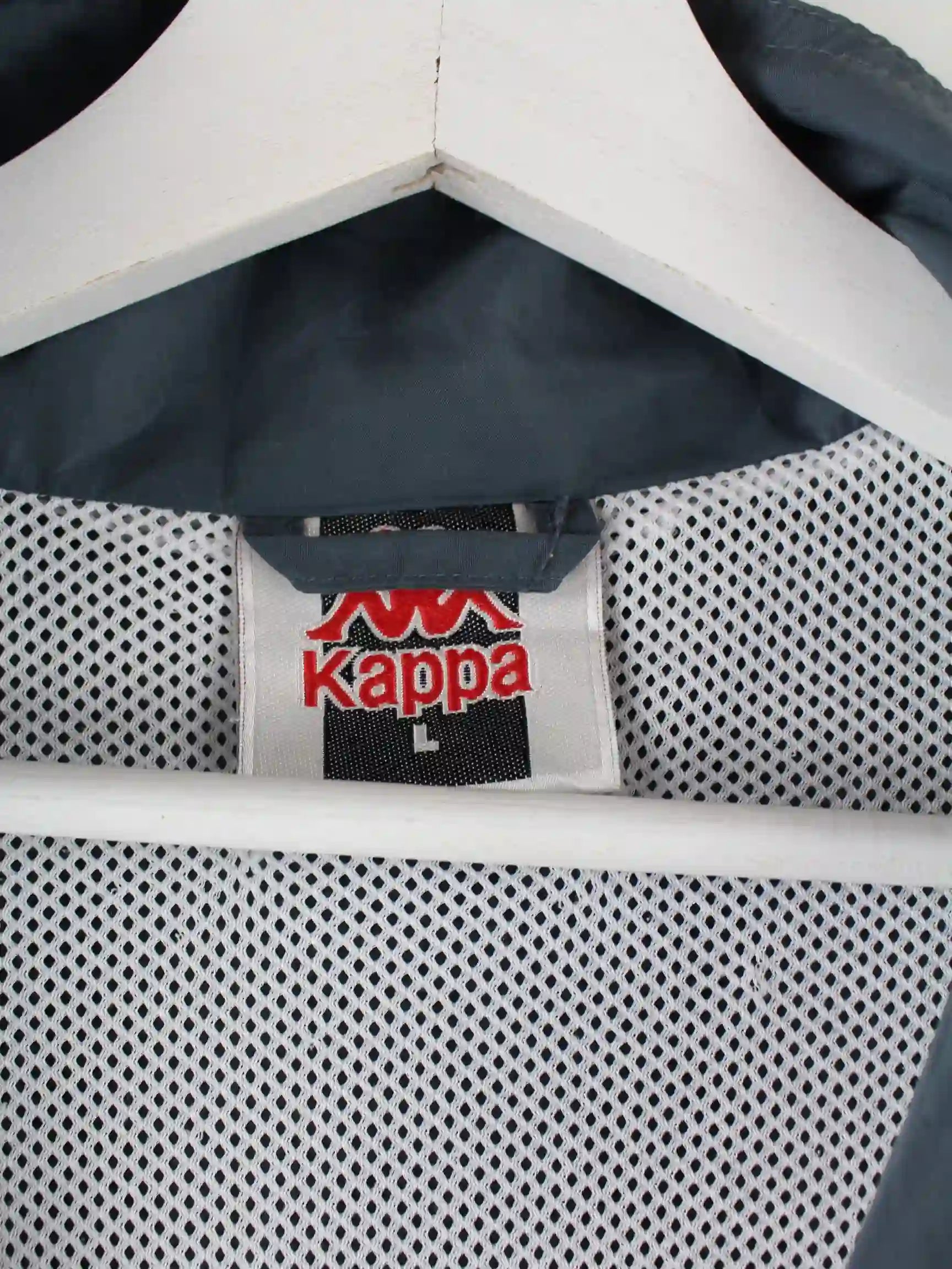 Graue Trainingsjacke aus dem Hause Kappa aus den 90'ern in Größe L. Sie ist aus Synthetik hergestellt und in sehr gutem Zustand vorrätig.