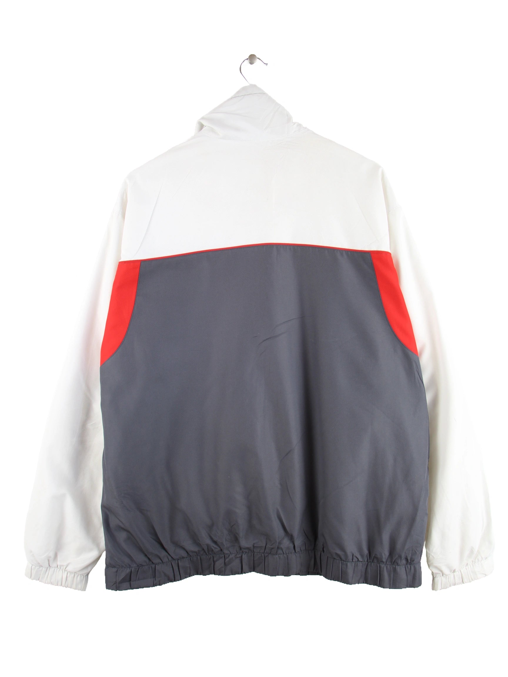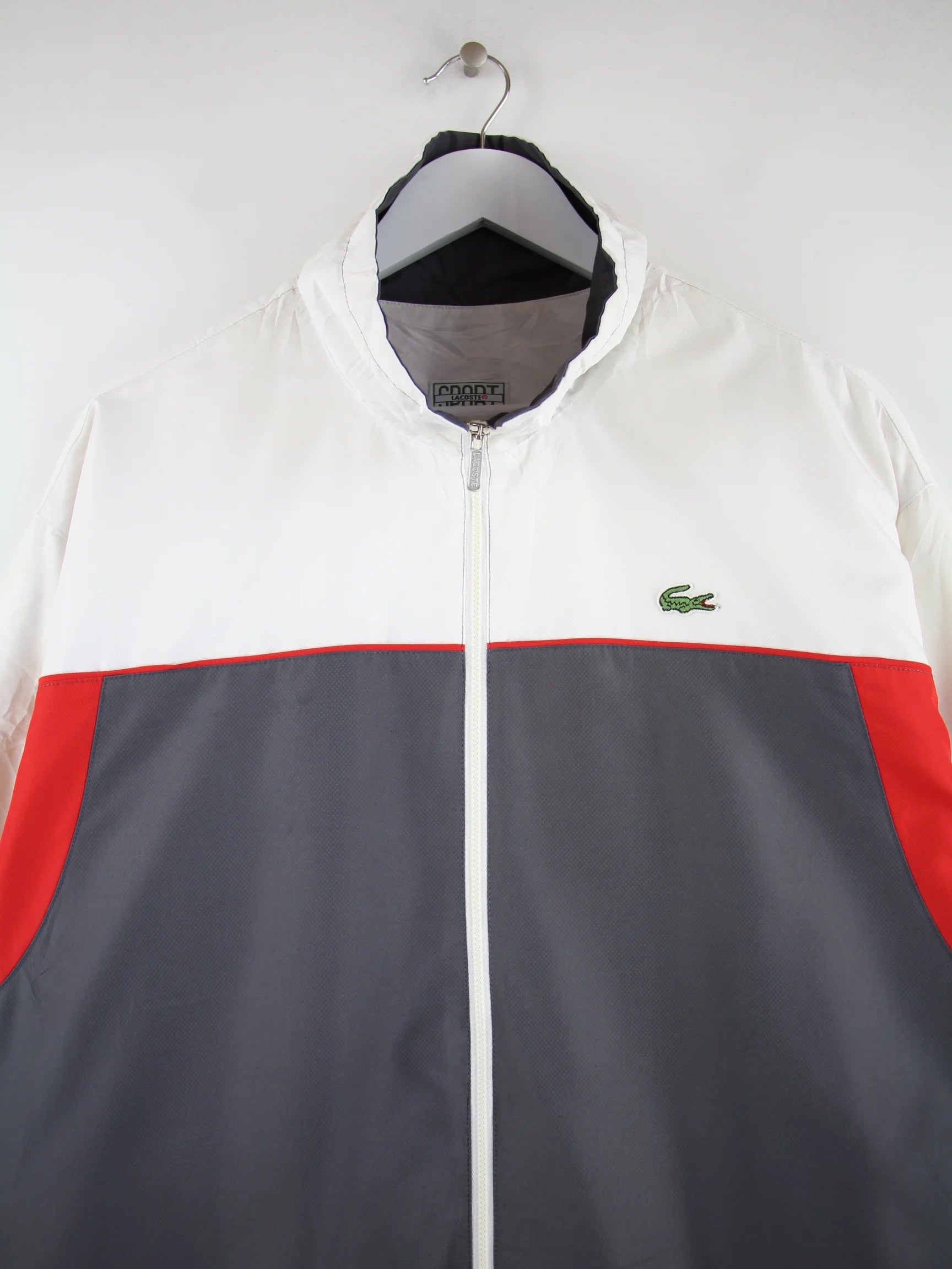 Graue Trainingsjacke vom Brand Lacoste in Größe XL. Sie ist aus Synthetik gefertigt und in gutem Zustand bei uns vorrätig.