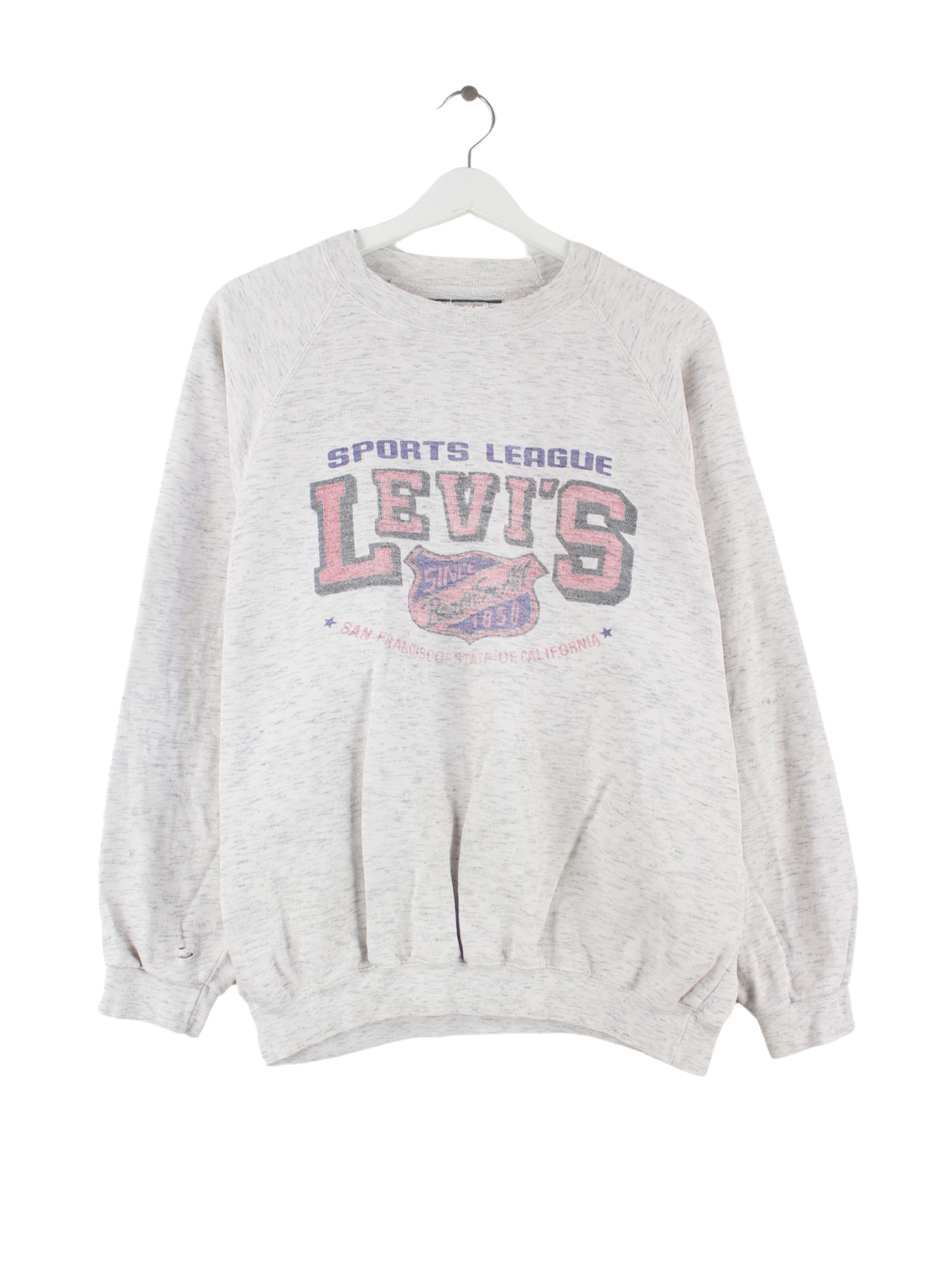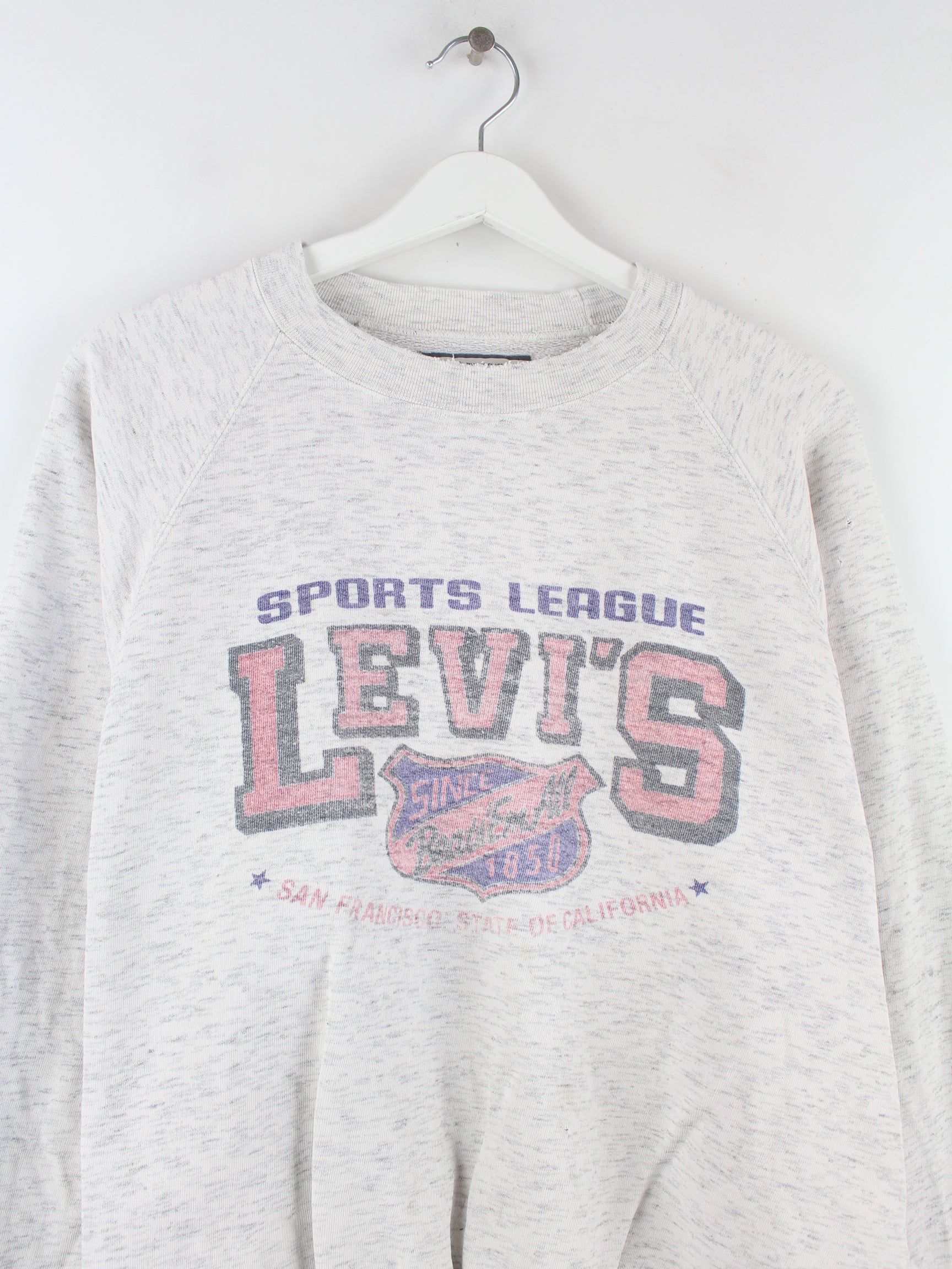 Grauer Sweater von Levi's aus den 80'ern in Größe M. Er ist aus einer Baumwollmischung hergestellt. Den Zustand würden wir als 'In Ordnung' bezeichnen (vergl. Bilder).Mit schönem Vintage Print.