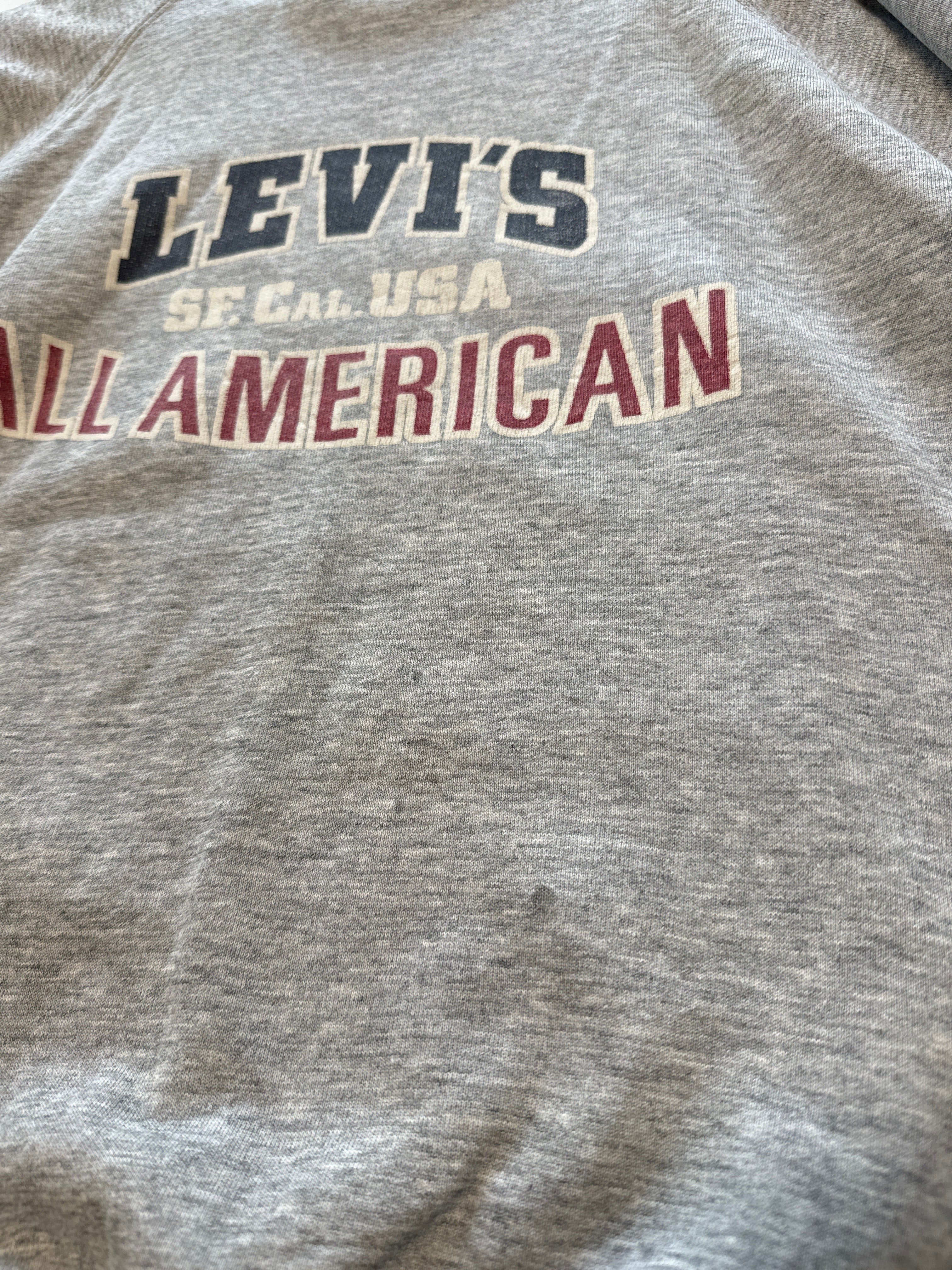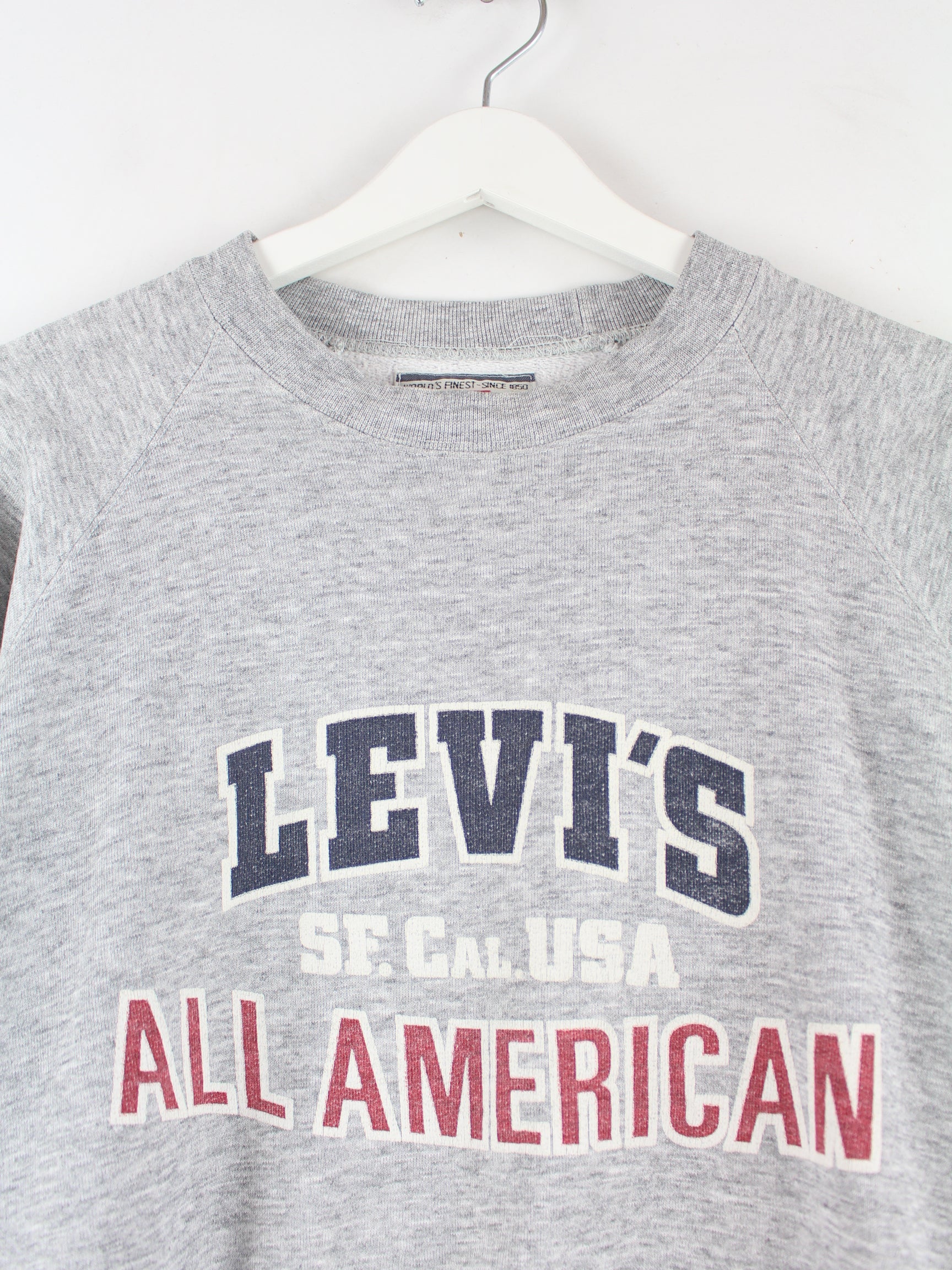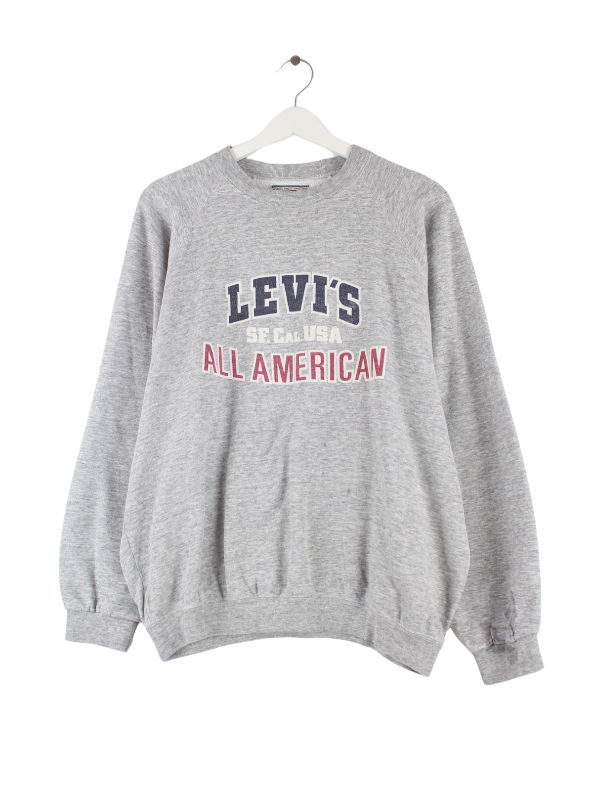 Grauer Sweater vom Brand Levi's aus den 90'ern in Größe L. Er ist aus einer Baumwollmischung gemacht. Den Zustand würden wir als 'In Ordnung' bezeichnen (vergl. Bilder).Mit chiquem Vintage Print.