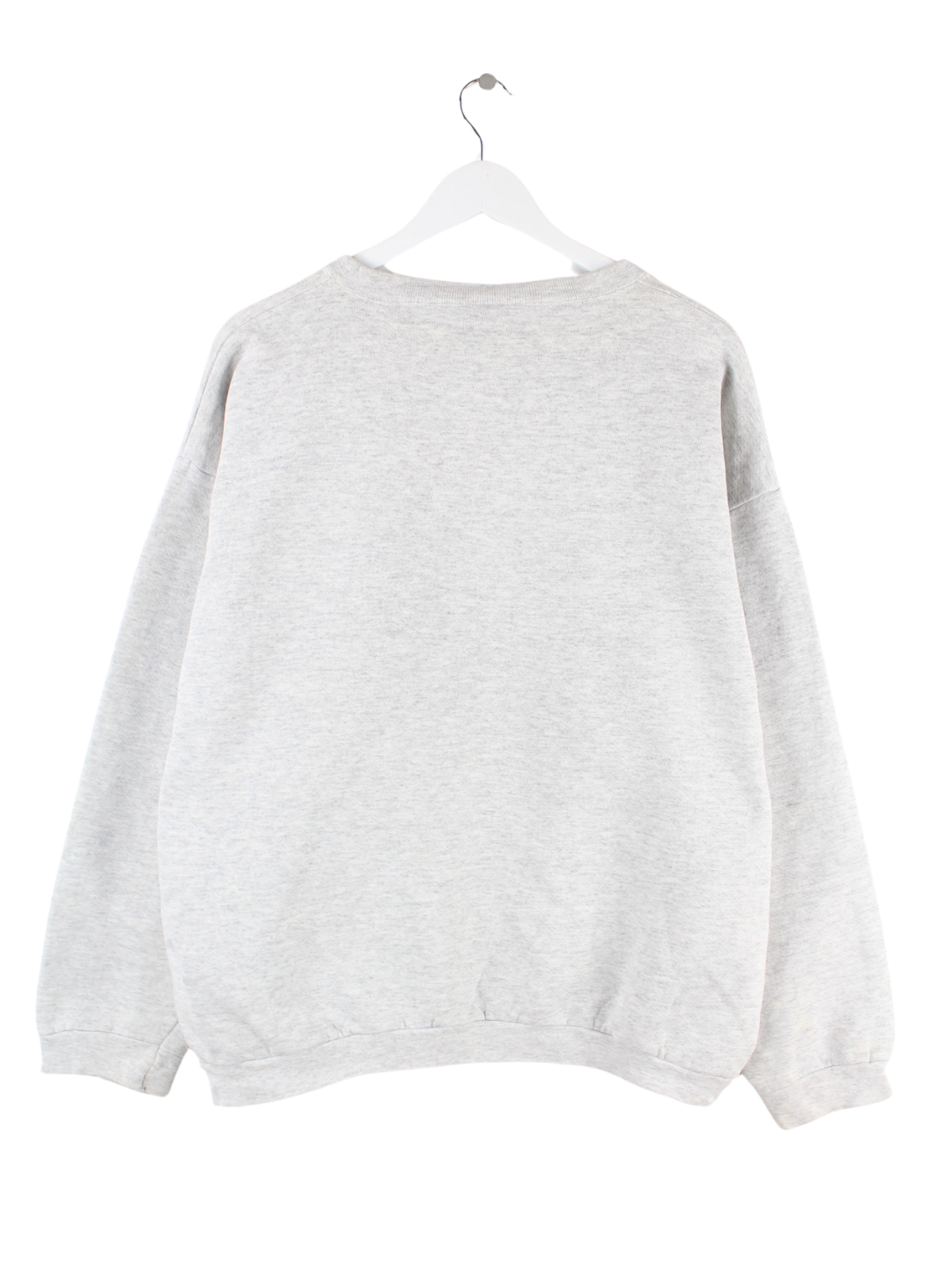 Grauer Sweater mit Stickereien der Marke Logo 7 aus den 90'ern in Größe XL. Er ist aus einer Baumwollmischung und in gutem Zustand in Stock.