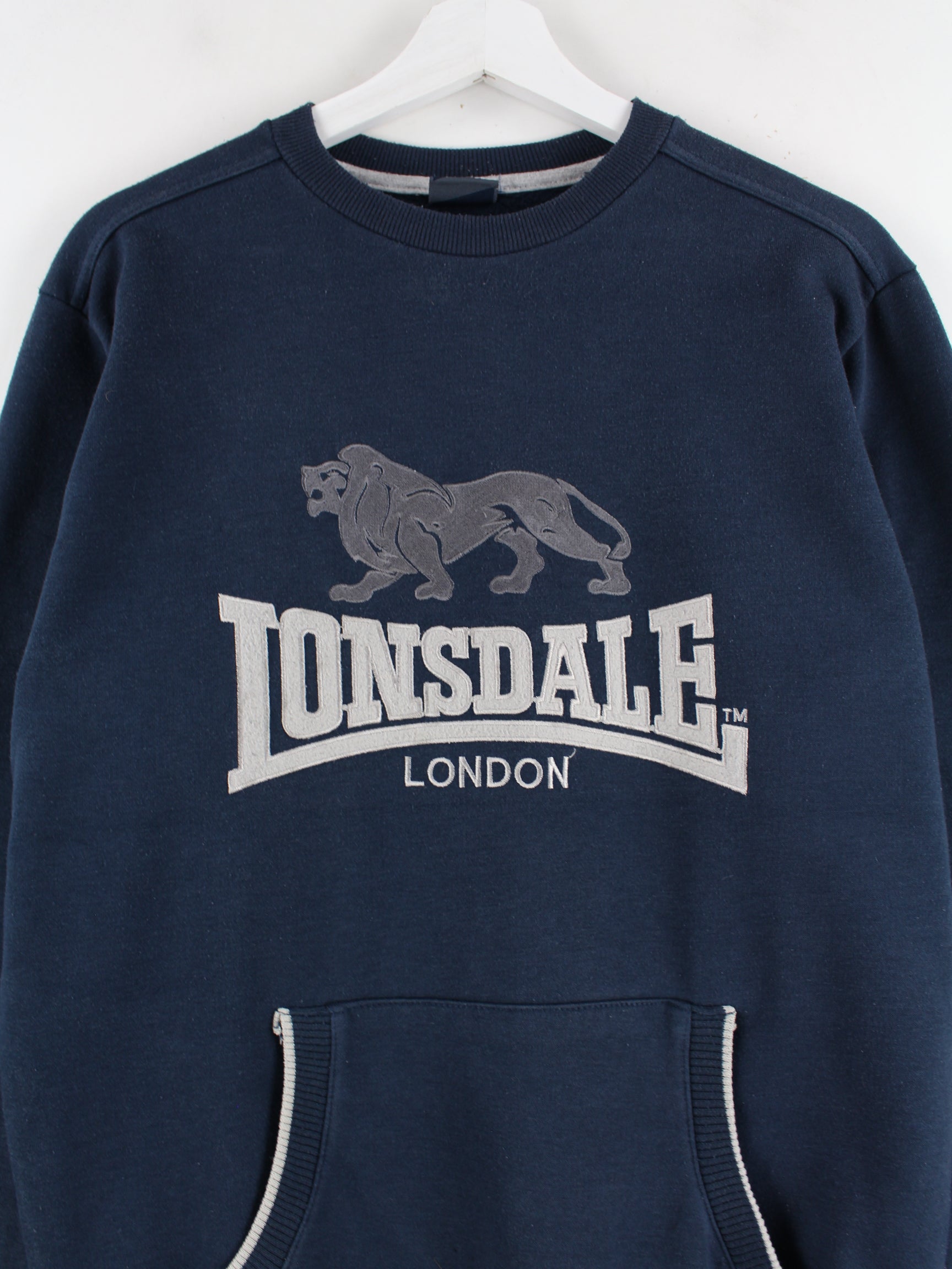 Sweater des Labels Lonsdale mit Stick in Größe XS. Er ist aus einer Baumwollmischung produziert und in Blau lieferbar.