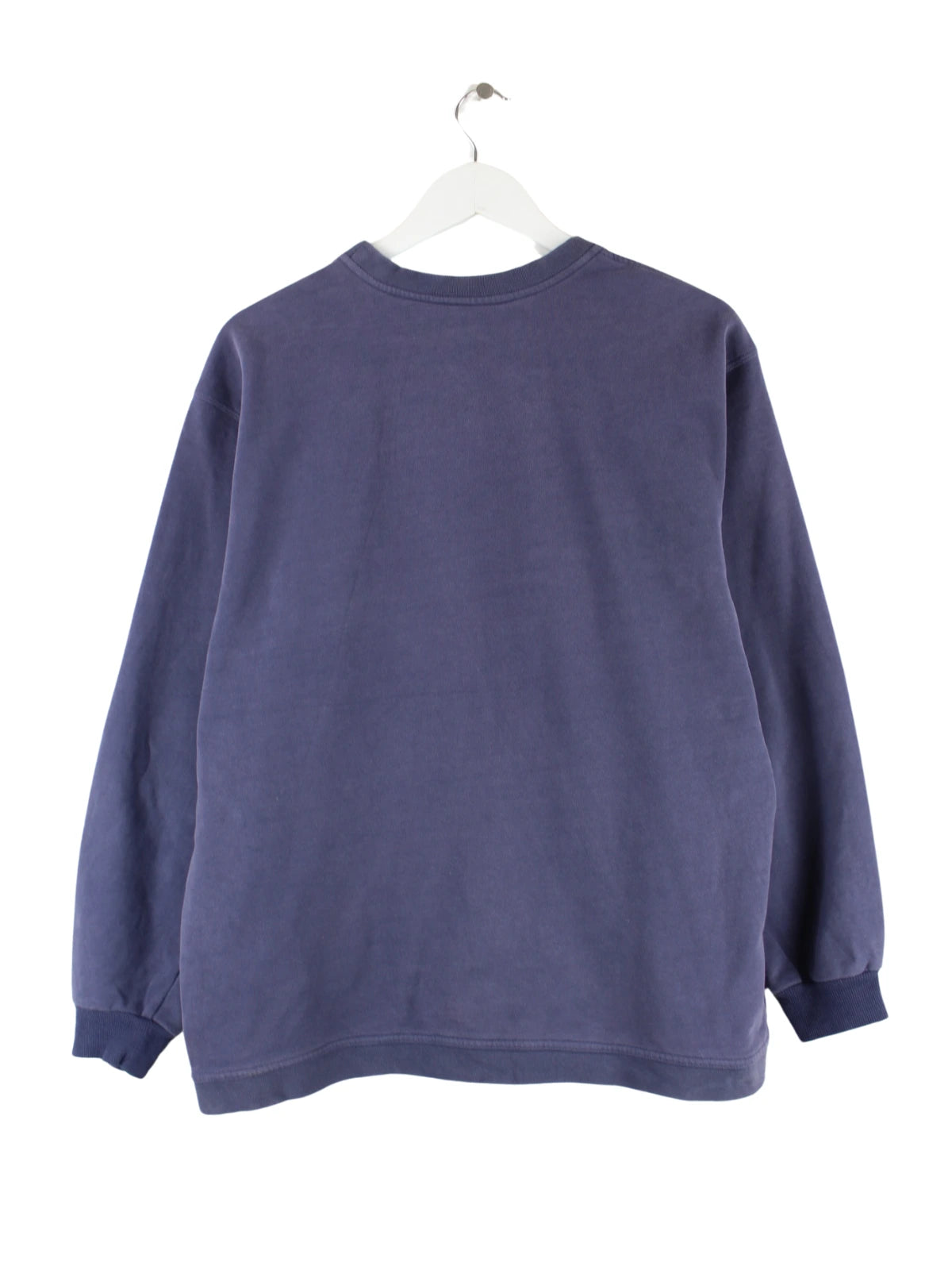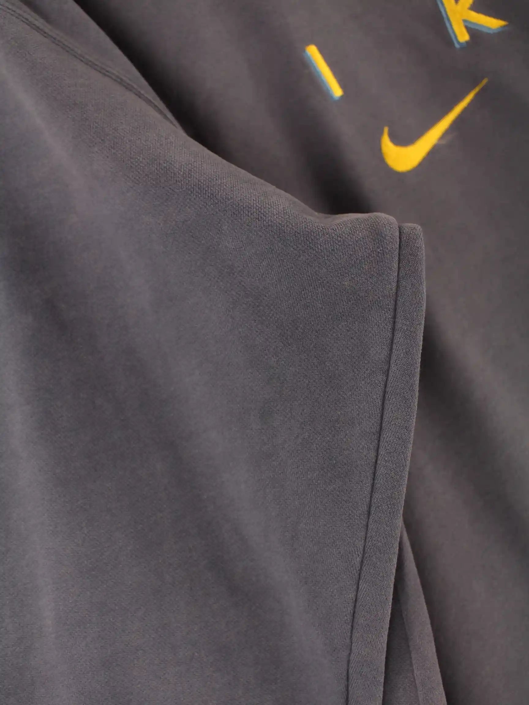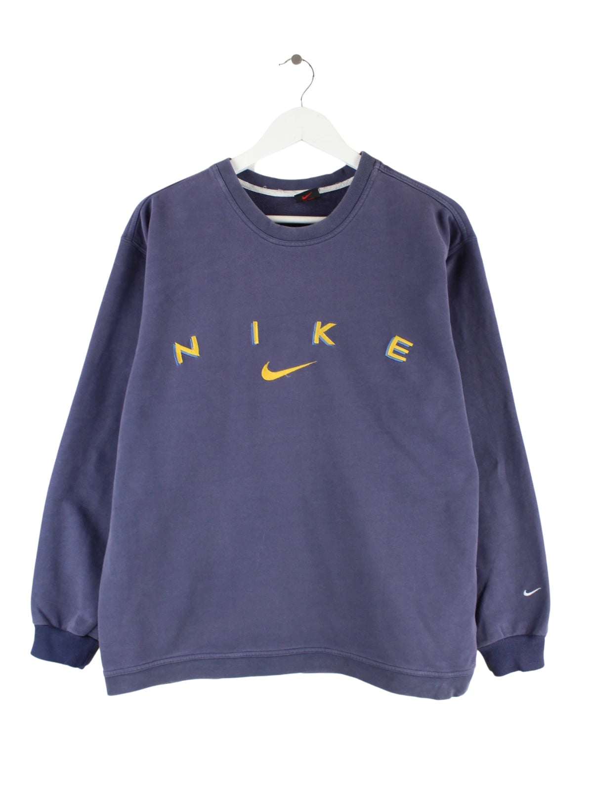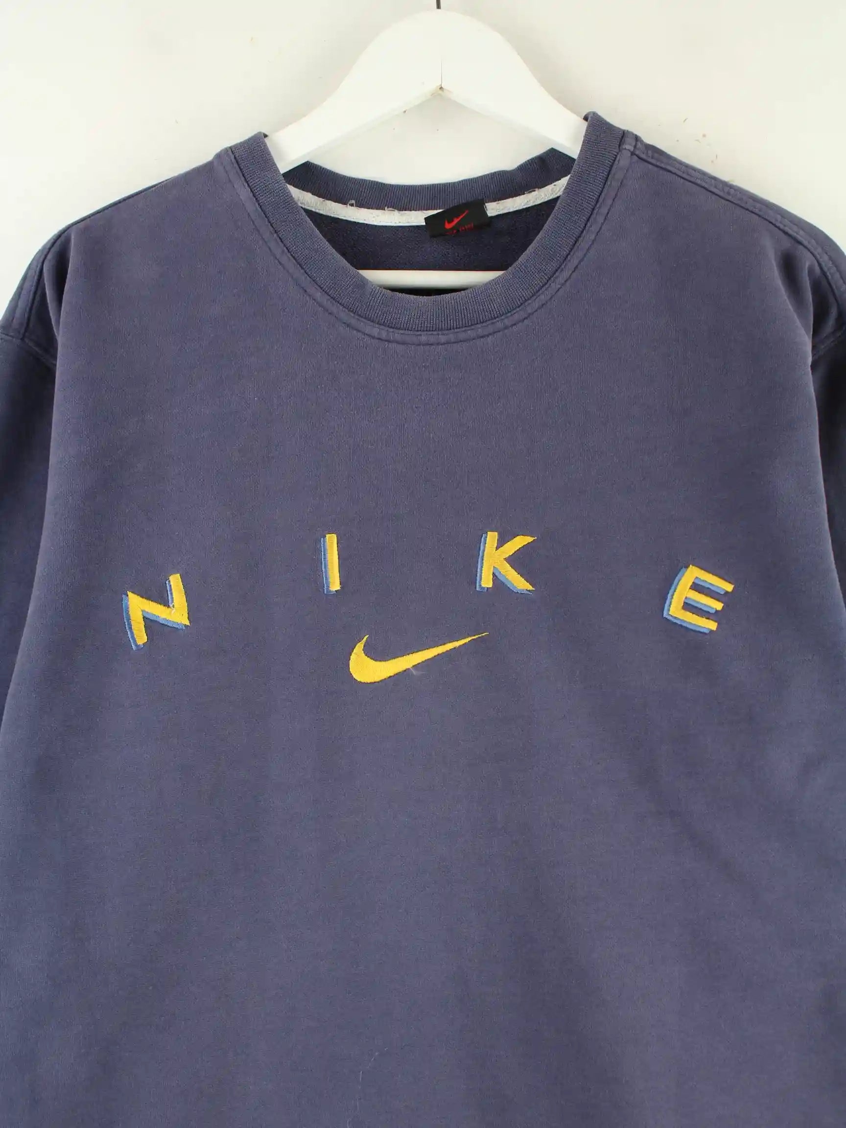 Blauer Sweater mit Stickereien vom Label Nike in Größe M. Er ist aus einer Baumwollmischung hergestellt und in gutem Zustand im Bestand.