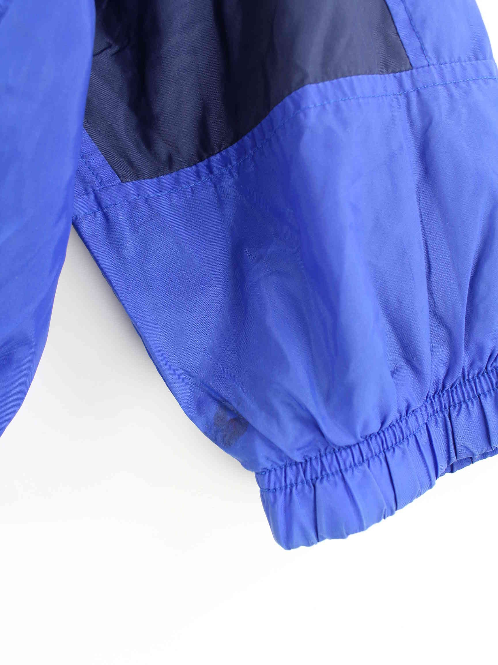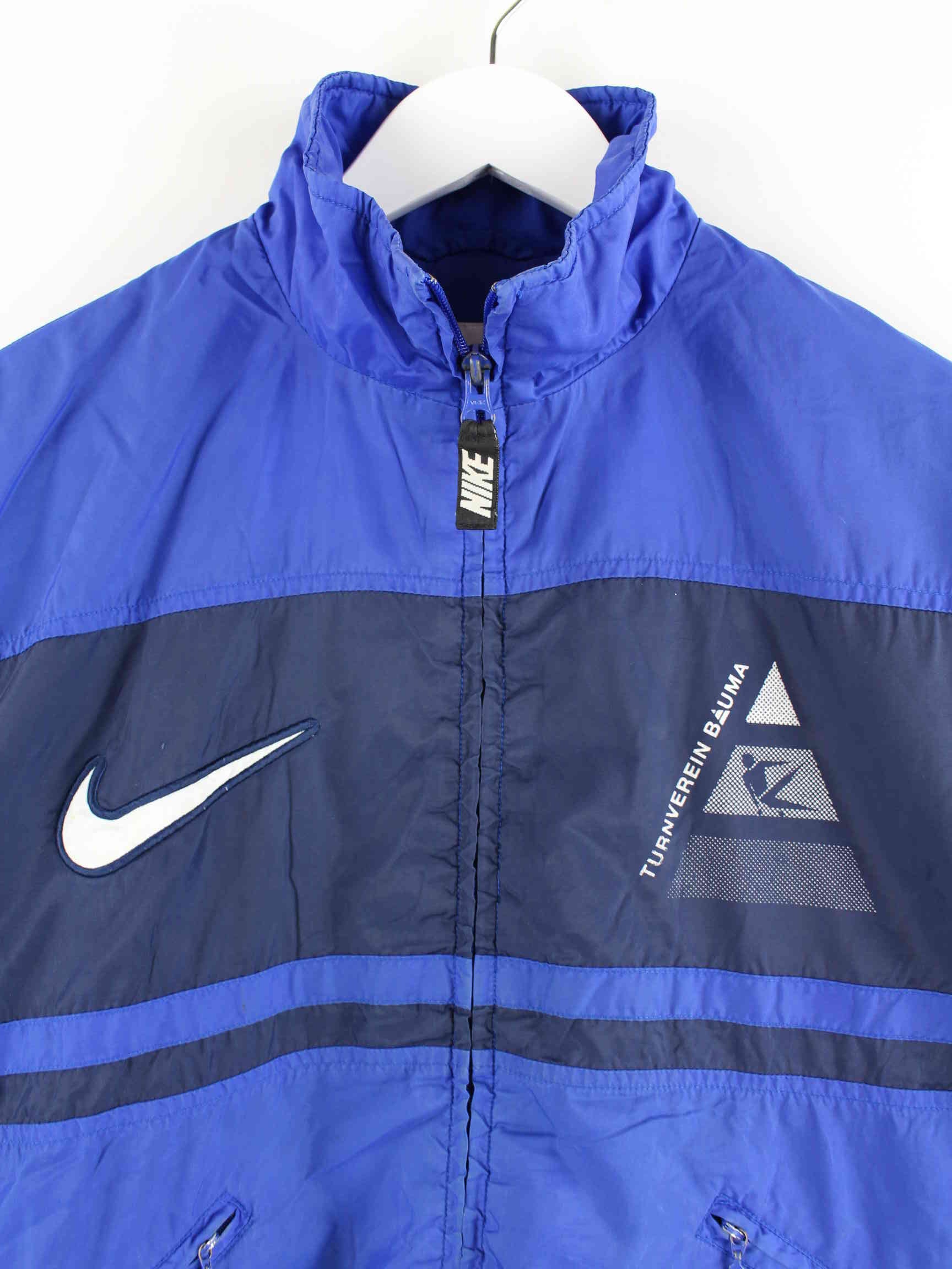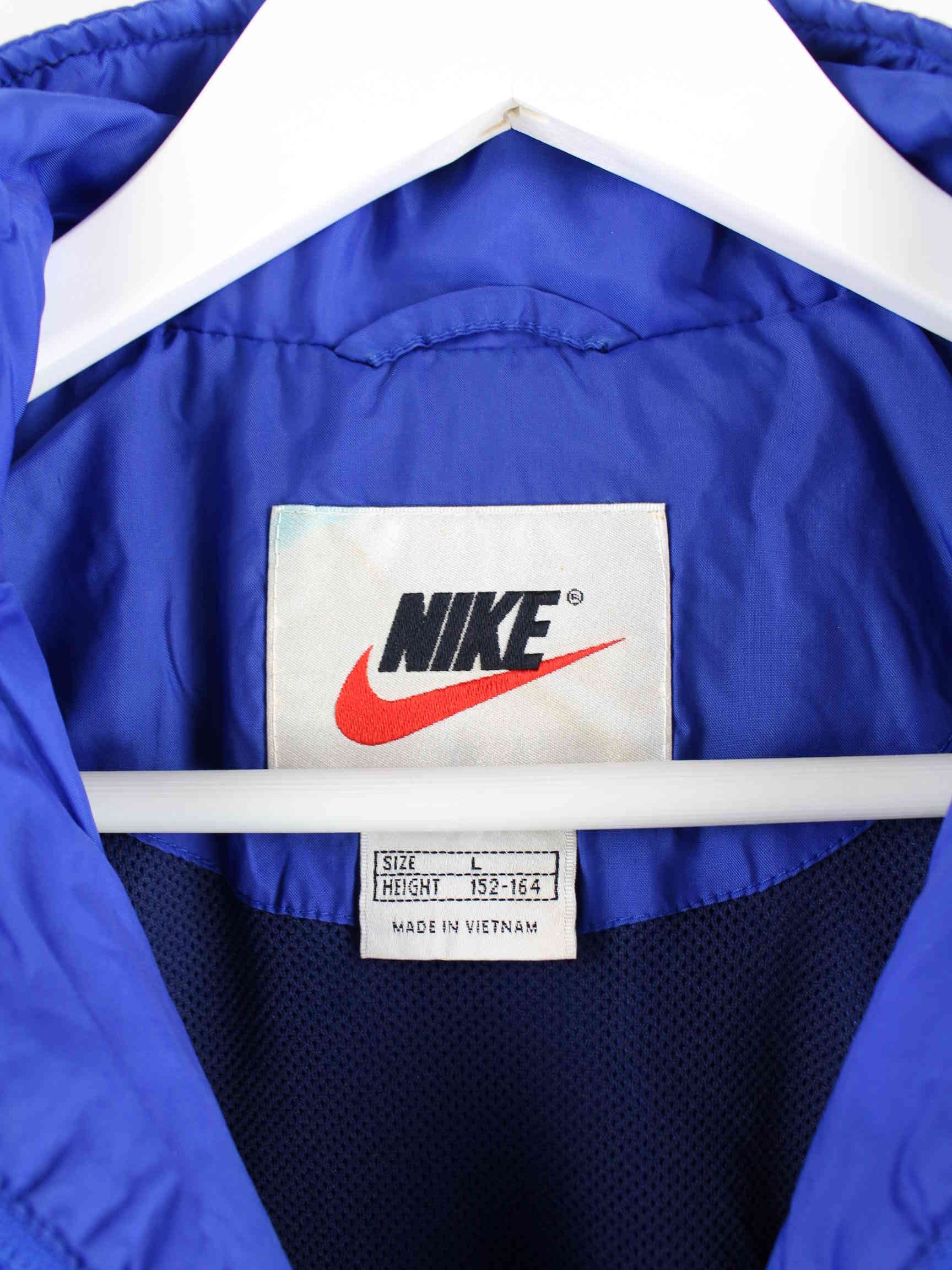 Blaue Trainingsjacke vom Brand Nike aus den 90'ern in Größe XS. Sie ist aus Synthetik produziert und in gutem Zustand bei uns zu bekommen.
