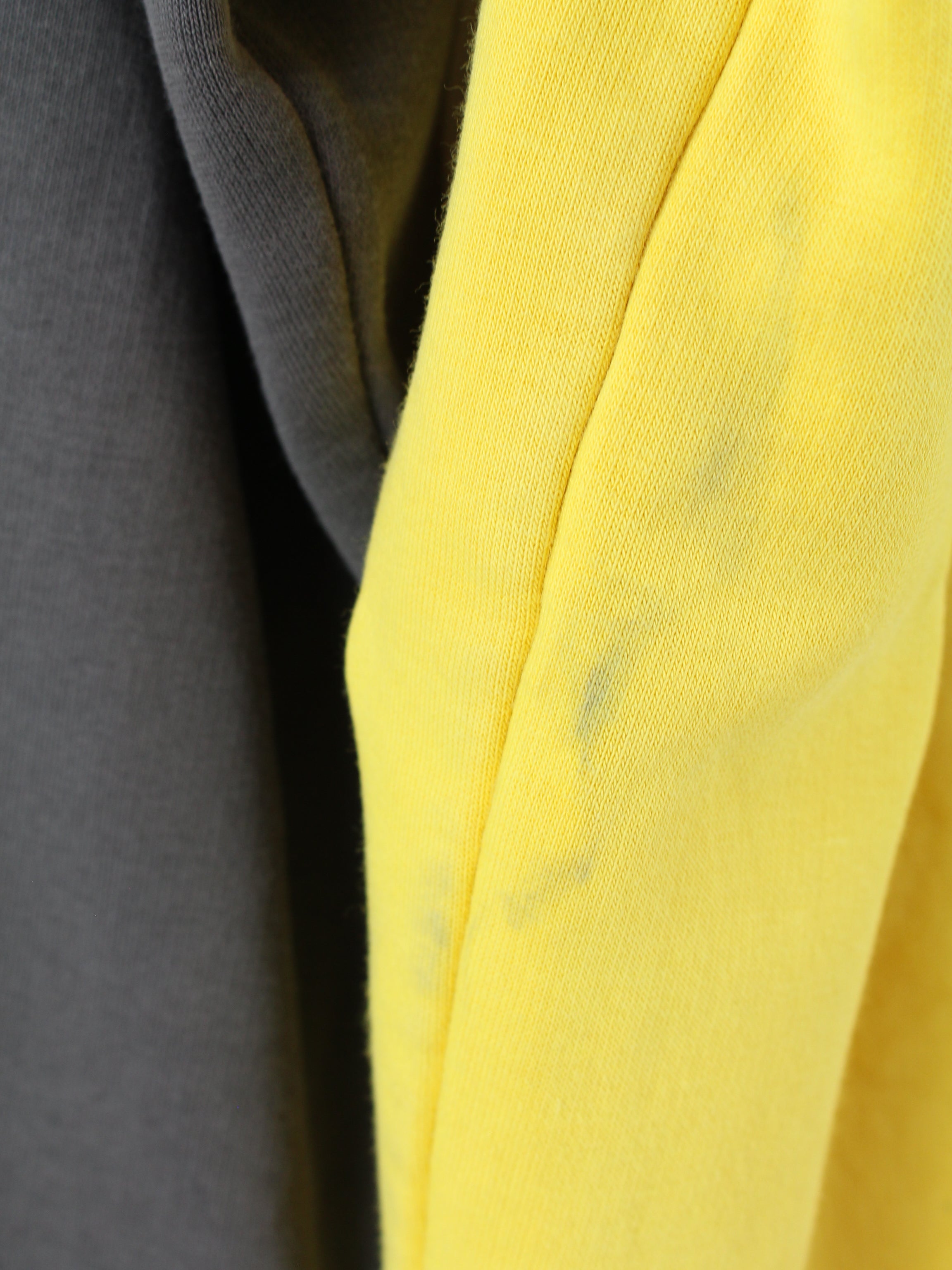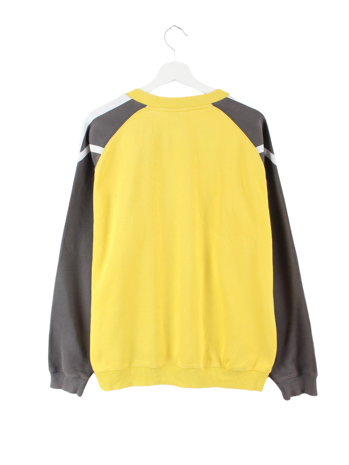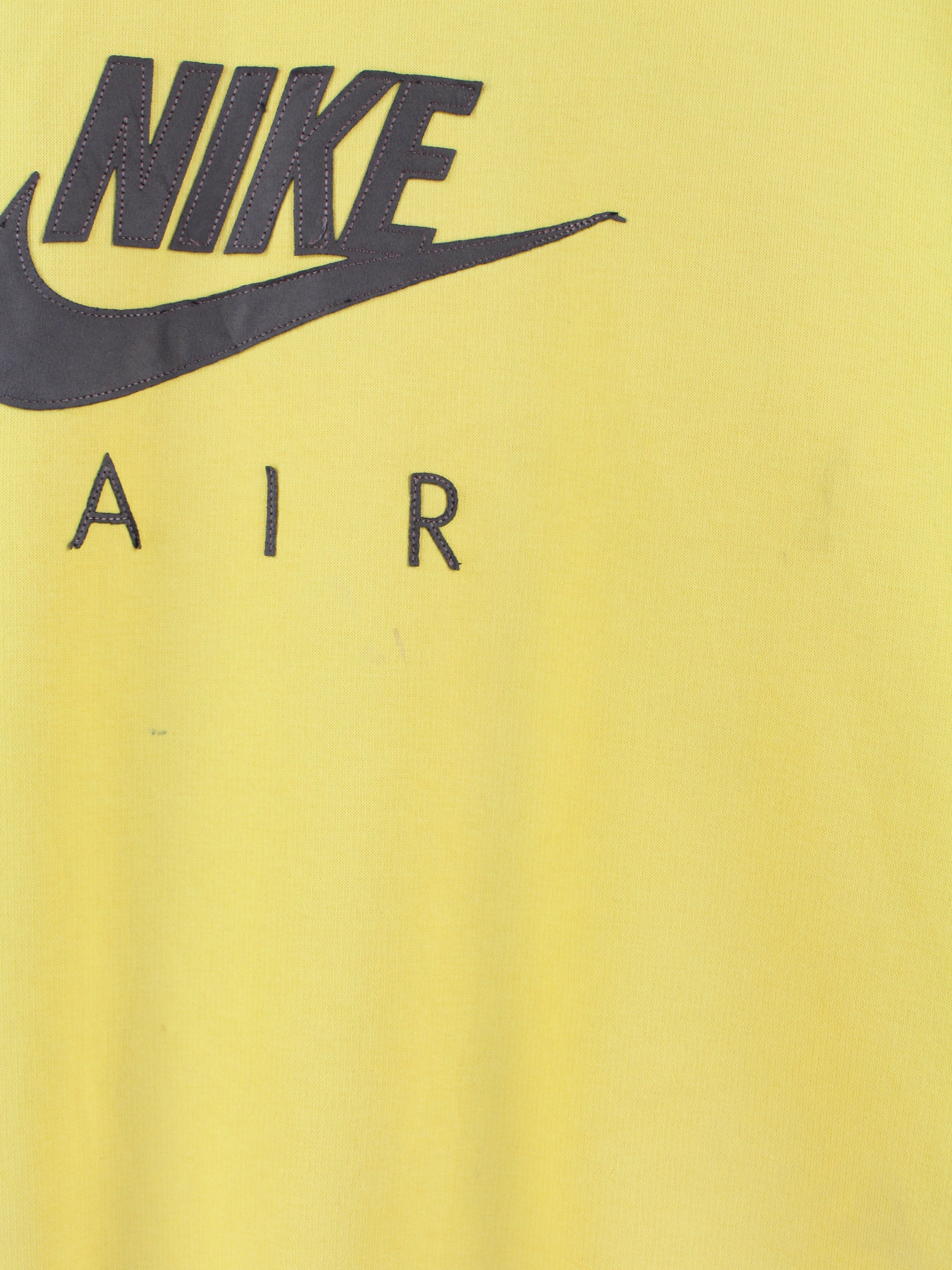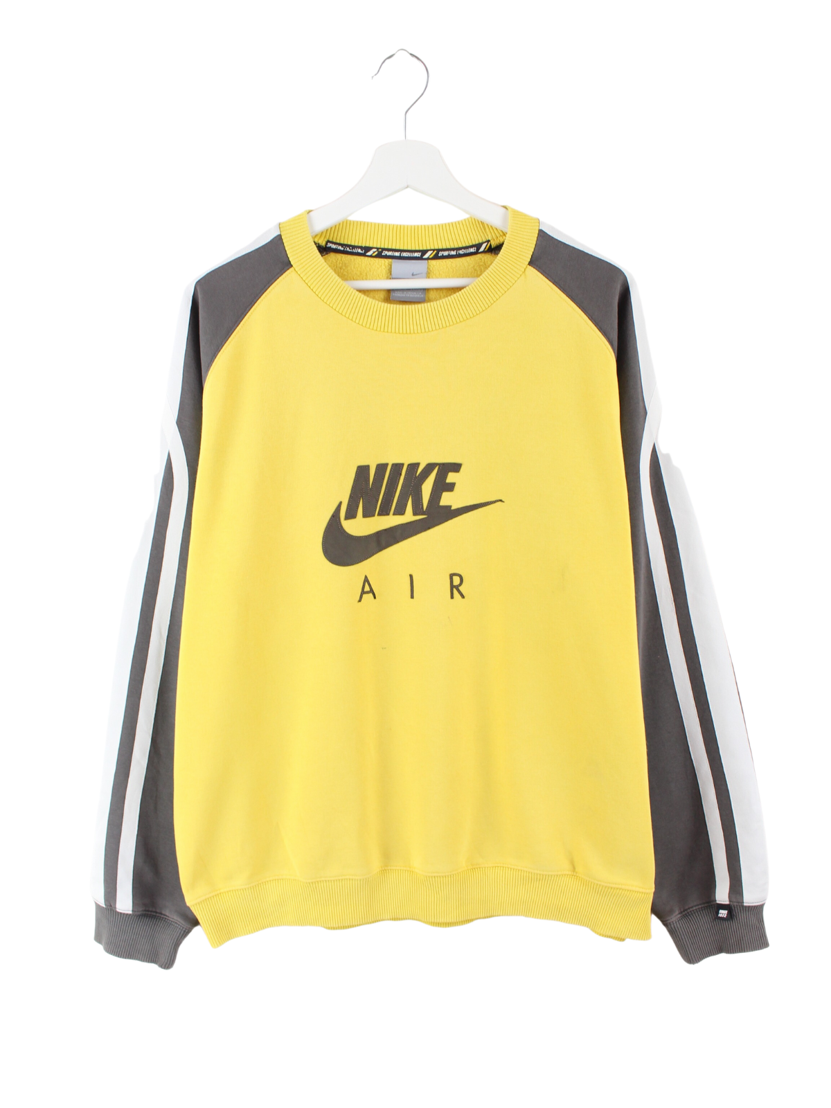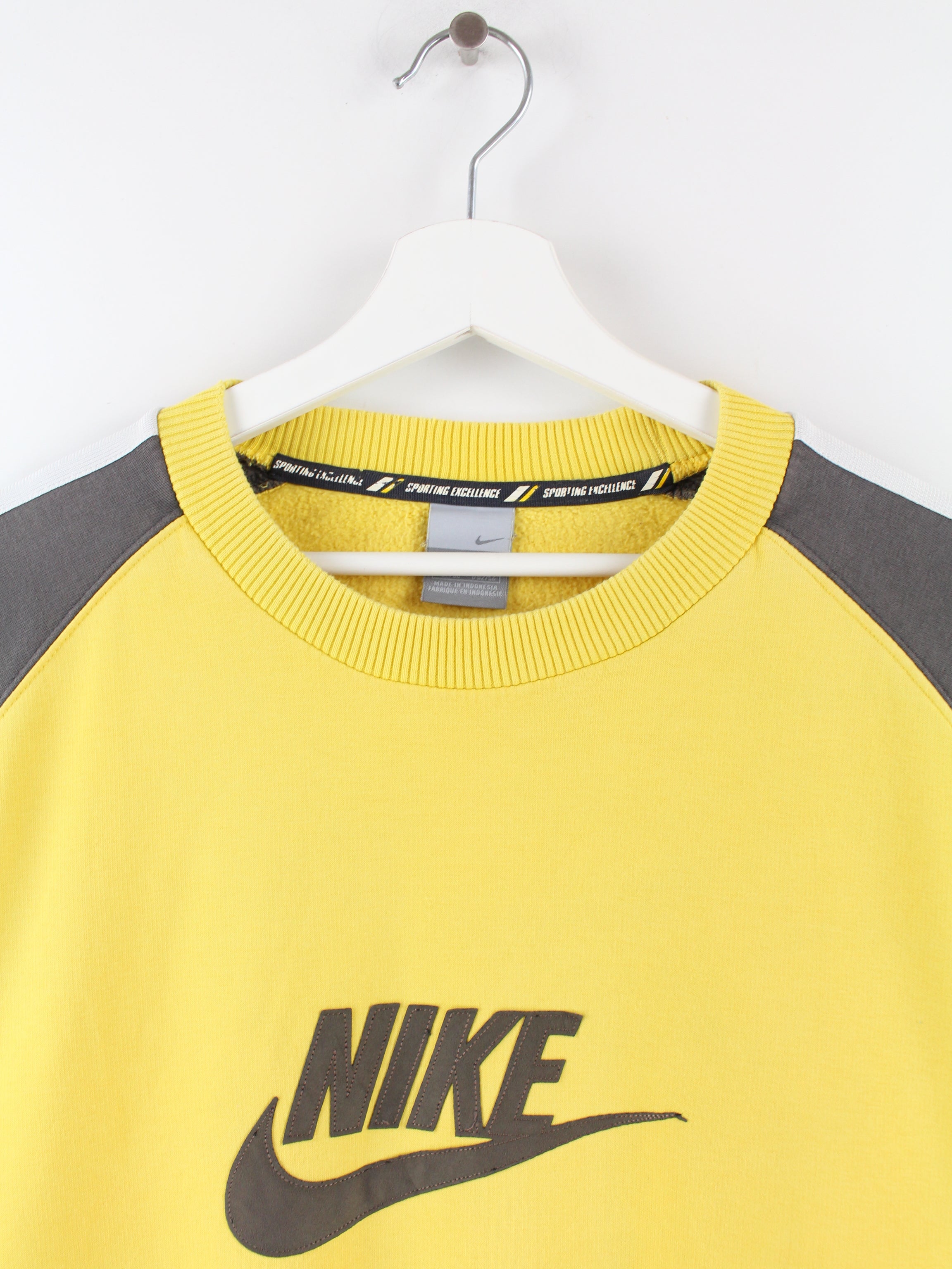 Pull Nike jaune avec un grand logo sur la poitrine.