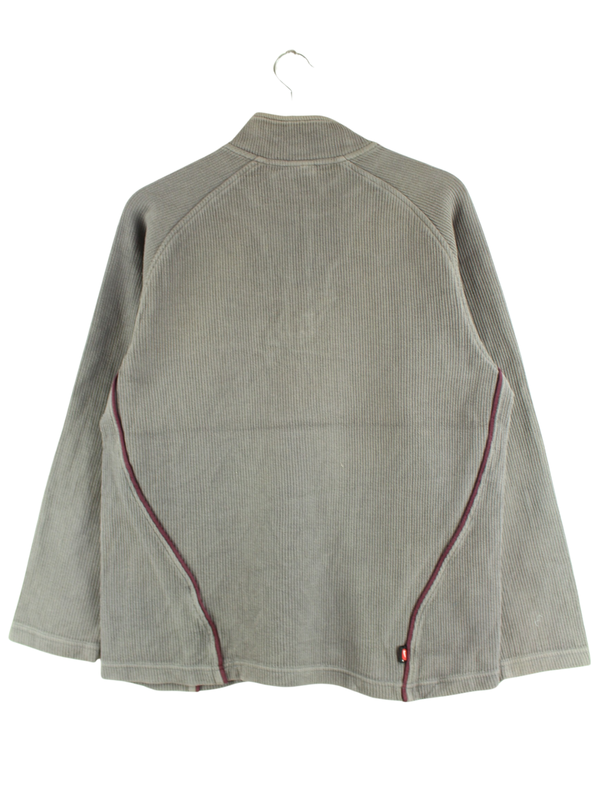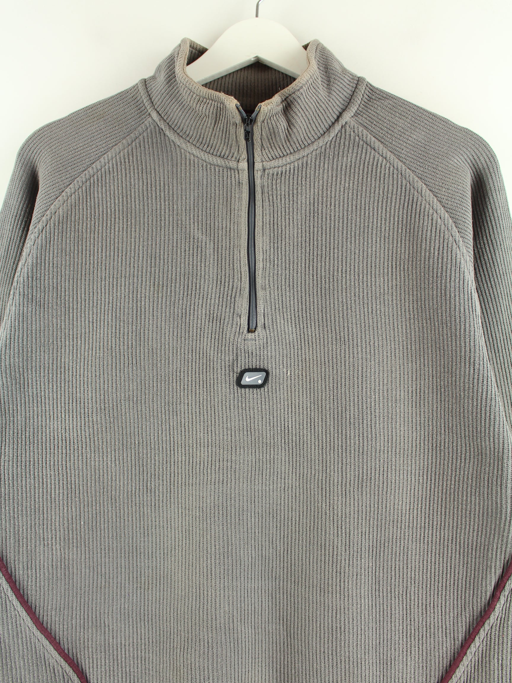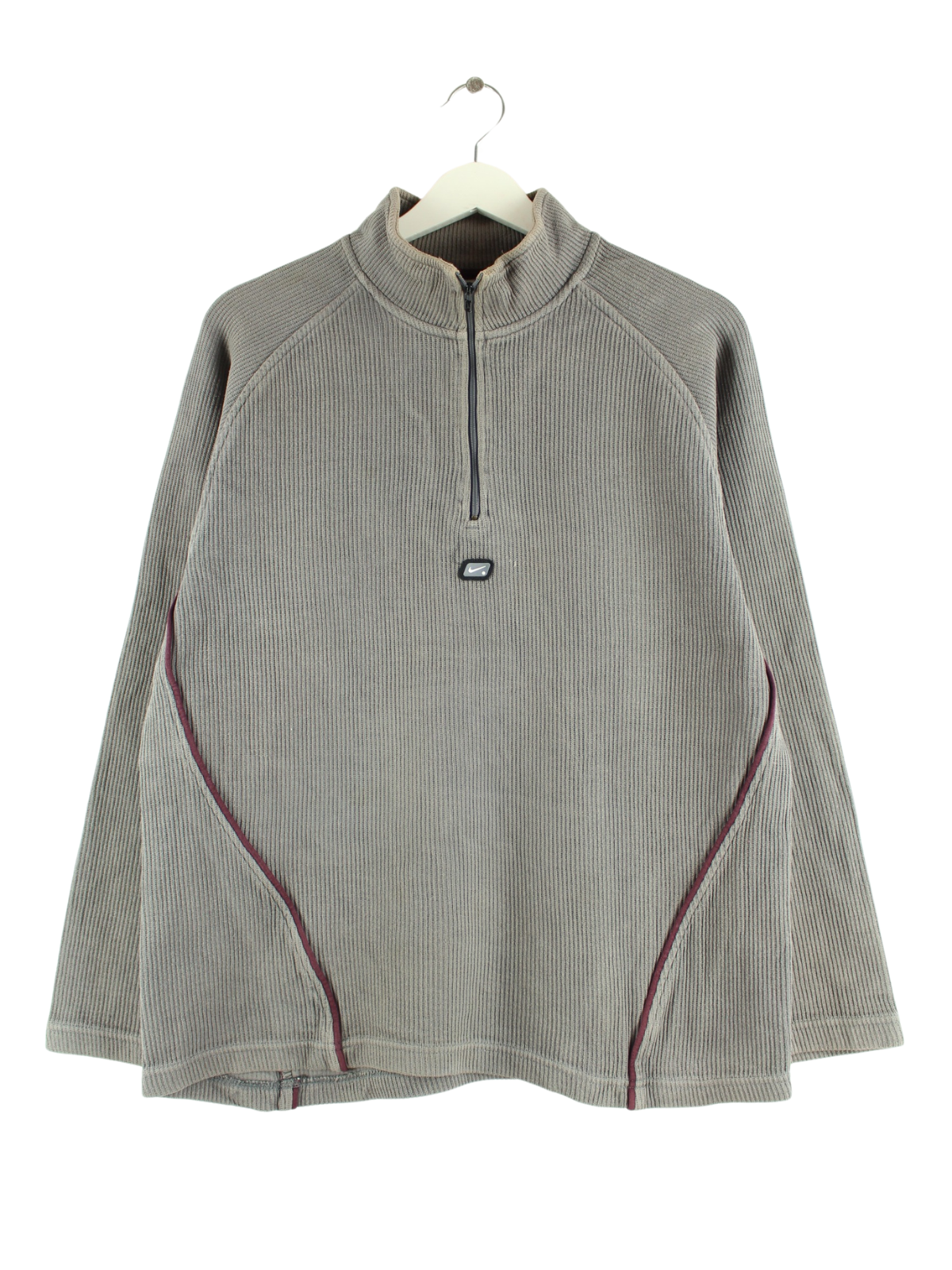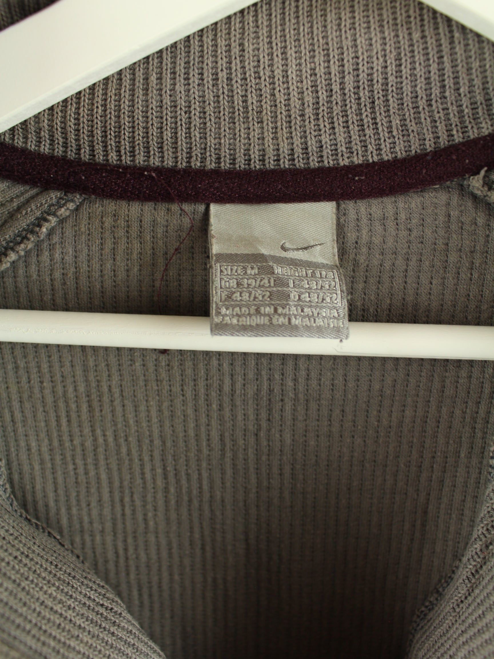 Grauer Sweater mit kurzem Reißverschluß der Marke Nike aus Anfang der 2000'er in Größe M. Er ist aus einer Baumwollmischung produziert und in sehr gutem Zustand bei uns vorrätig.